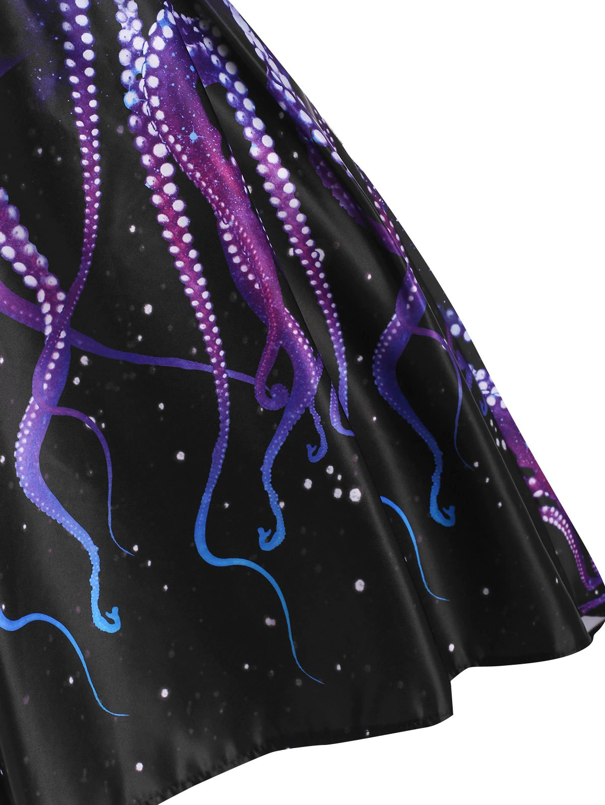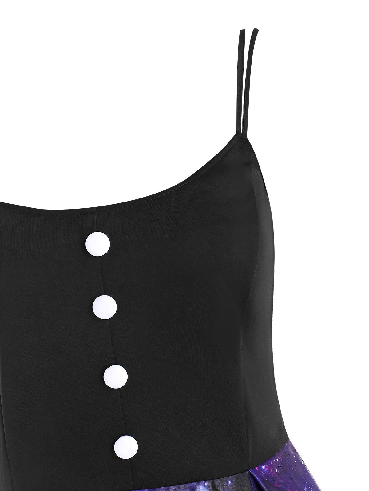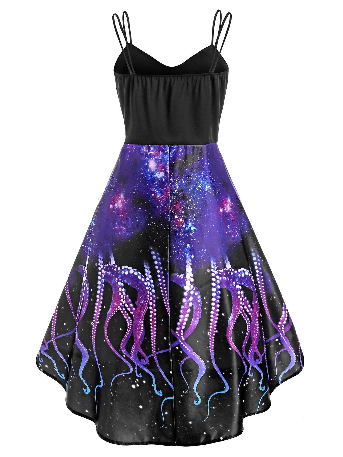 This charming dress makes a splash through the galaxy octopus pattern. Mock buttons set in a row in the front to add a chic look. Dual straps separate it apart from others in a wonderful way. And the high low hem shows your elegance with ease.