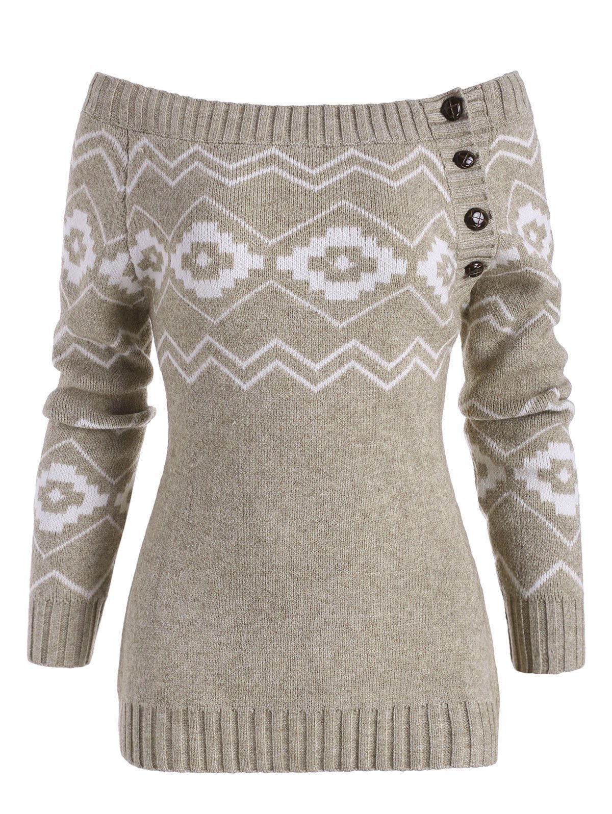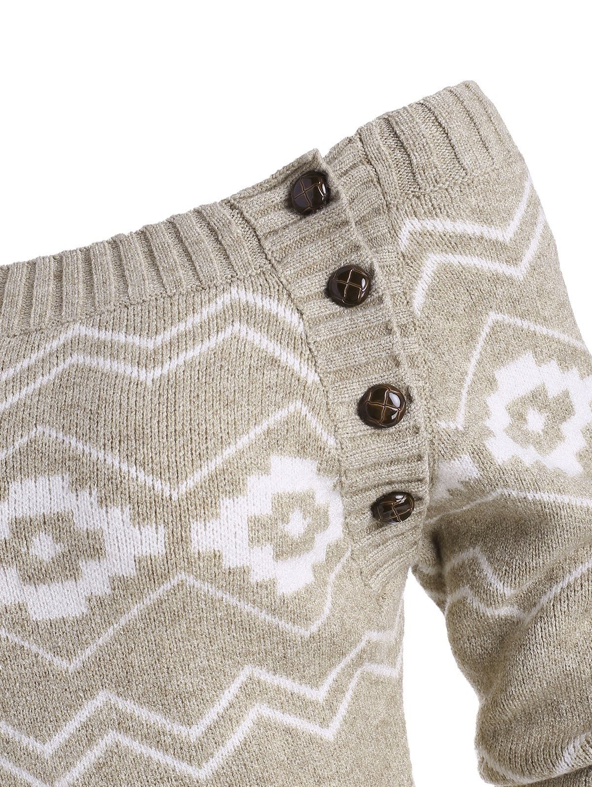 Off Shoulder Button Side Zig Zag Geometric Sweater