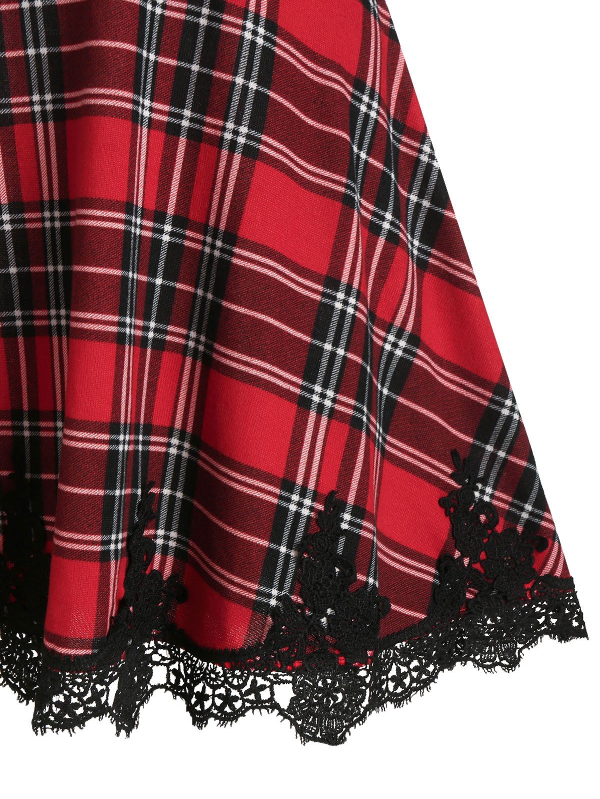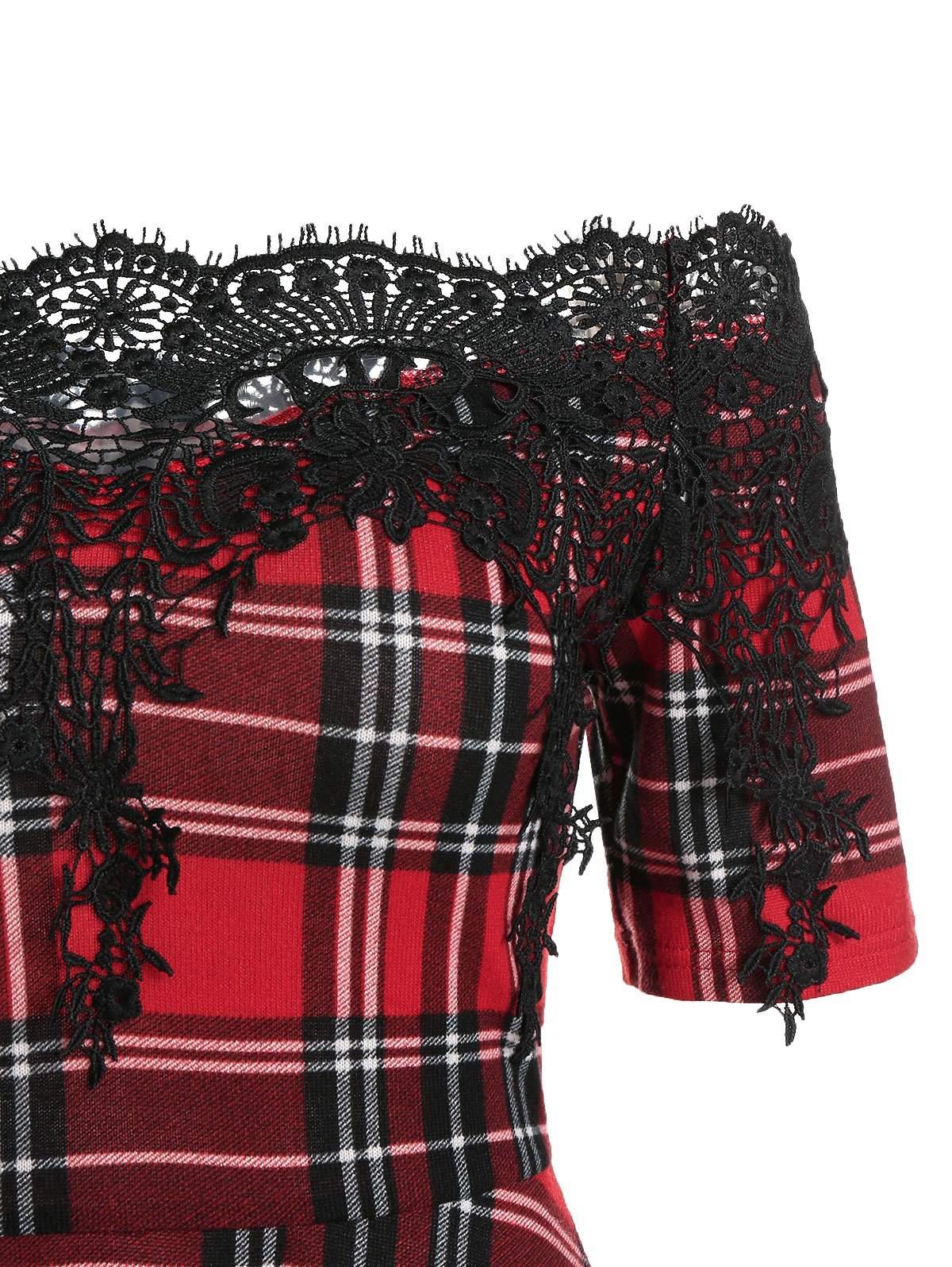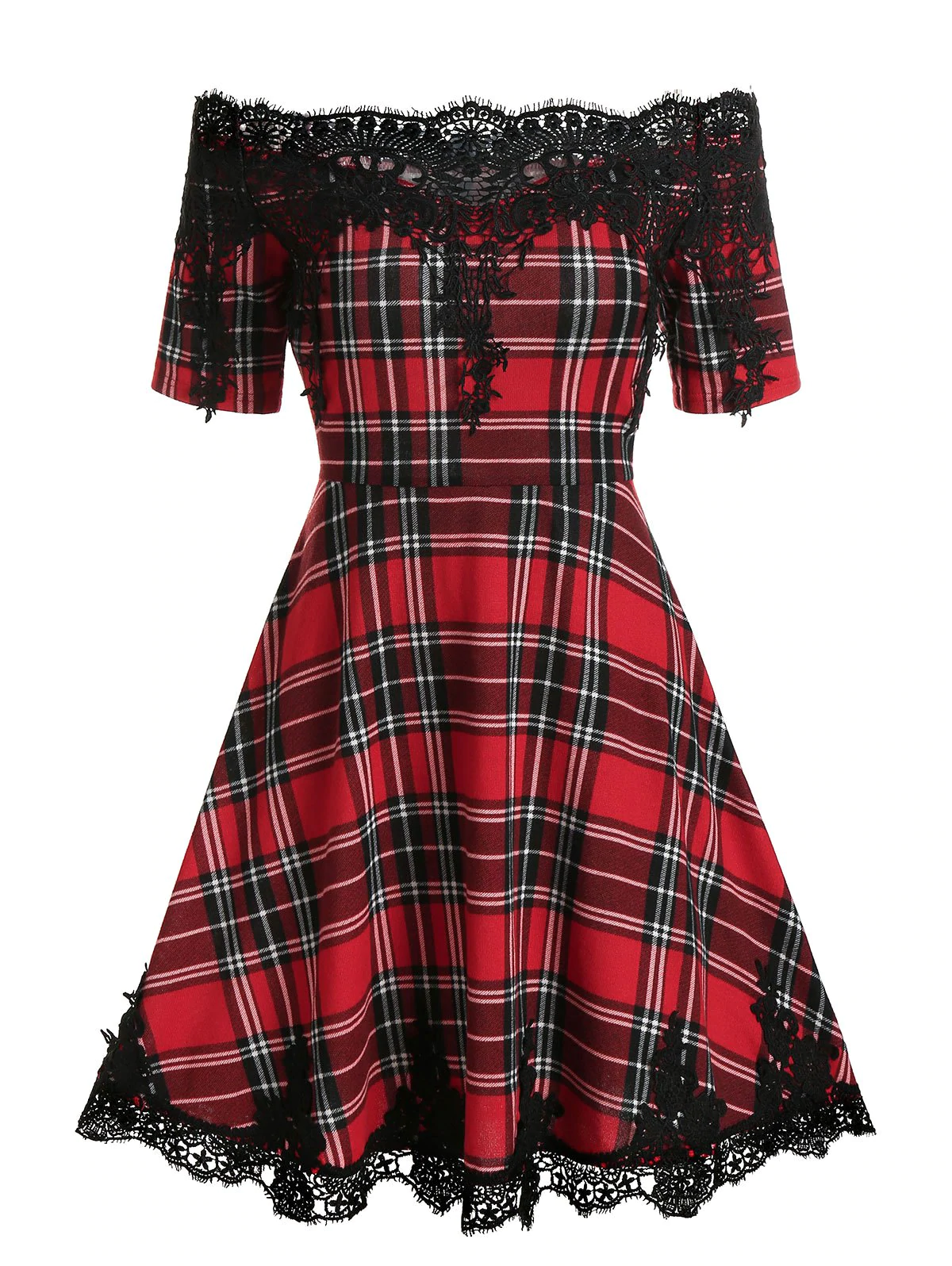 Off Shoulder Checked Lace Insert Mini A Line Dress