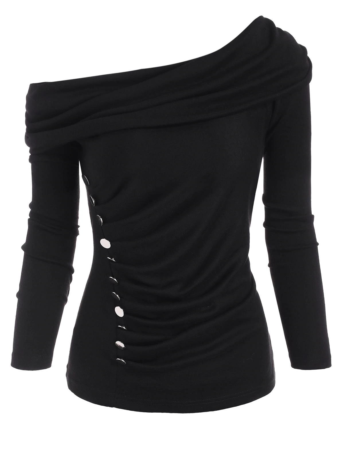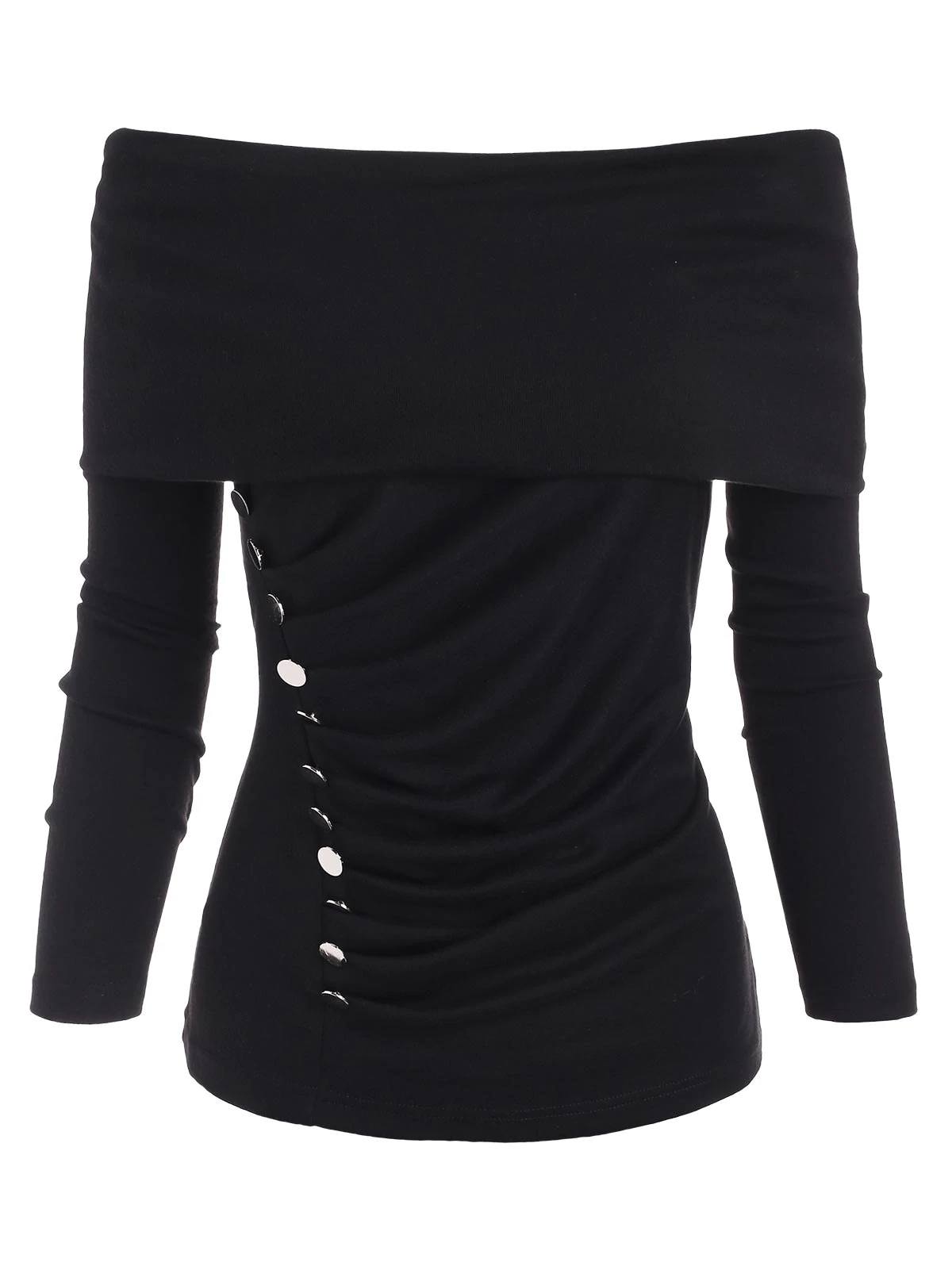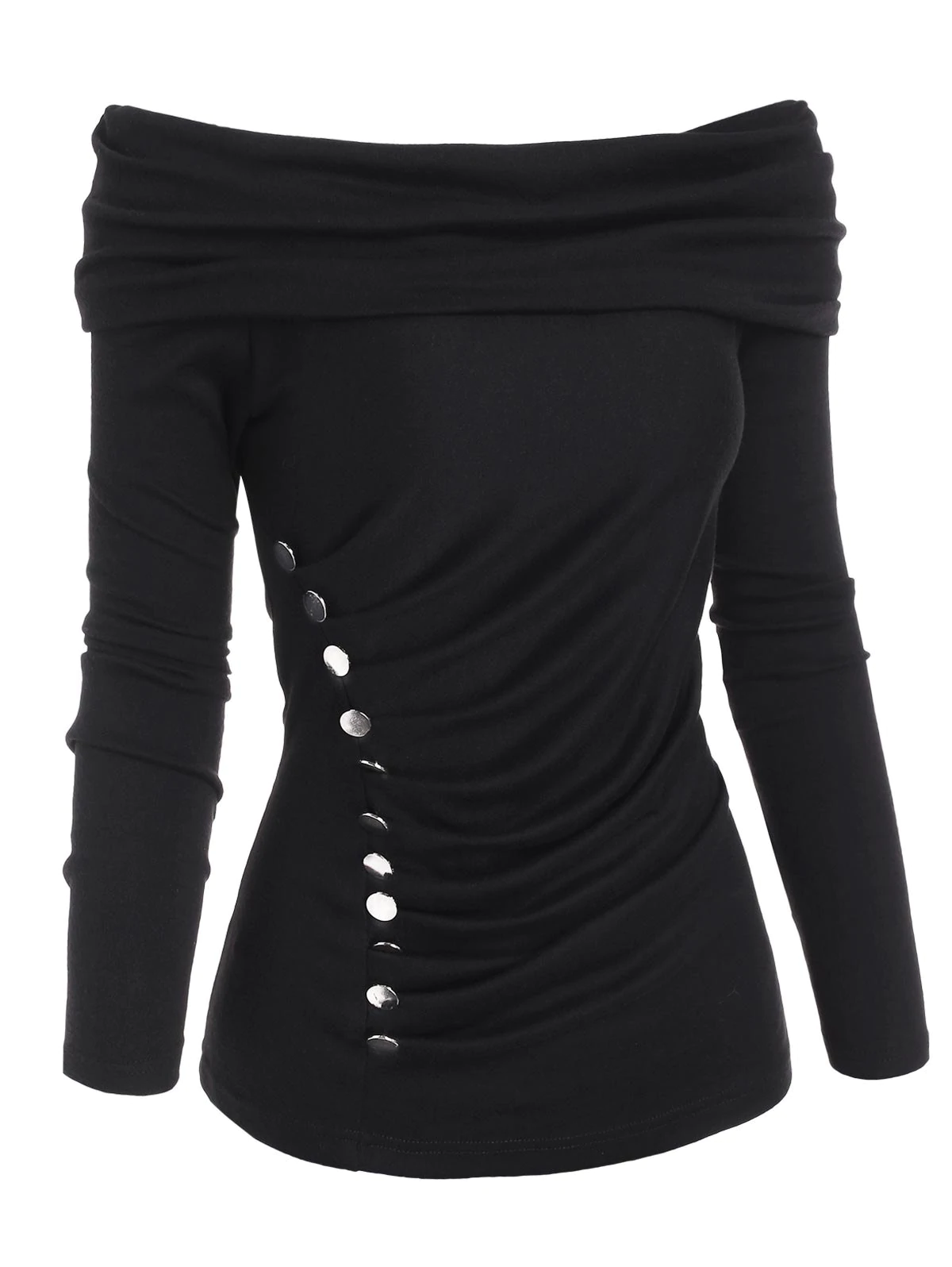 The foldover design makes this knitwear versatile, you can wear it as a portrait neck, off-shoulder neck, or skew neck as you prefer. The side mock buttons echo well with the ruched detail to provide a sleek and smooth look that you will love.