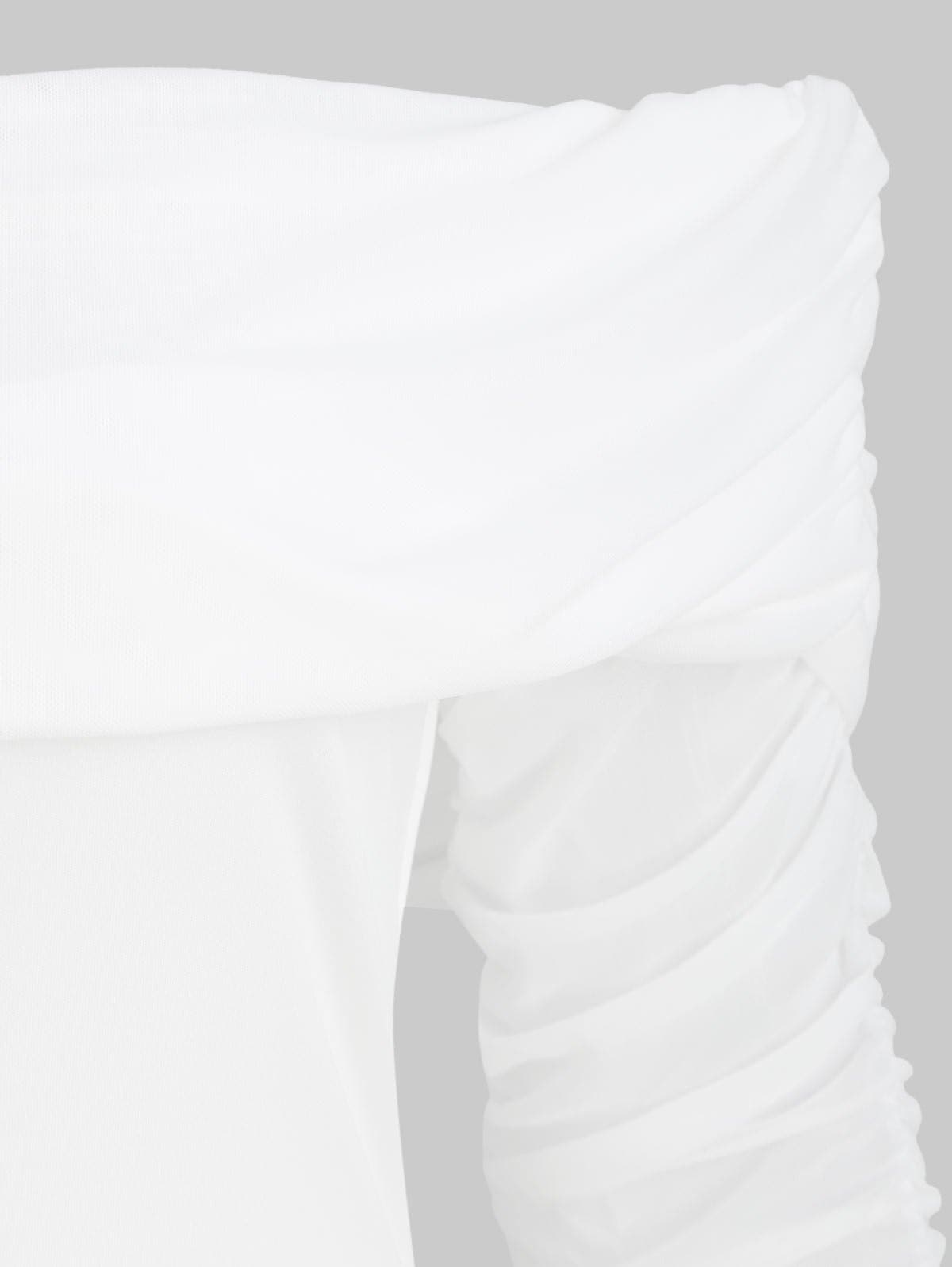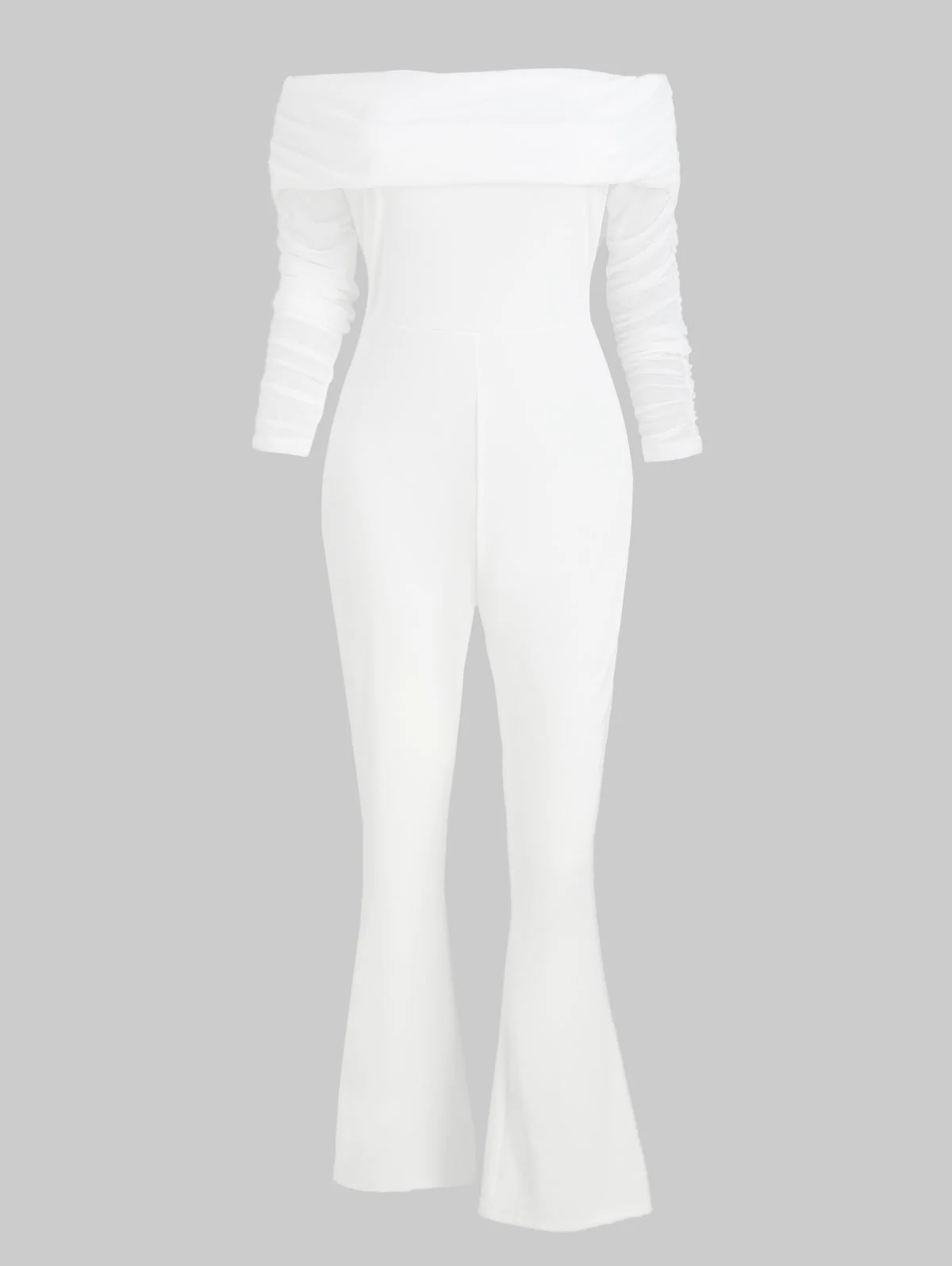 Off Shoulder Mesh Panel Ruched Jumpsuit