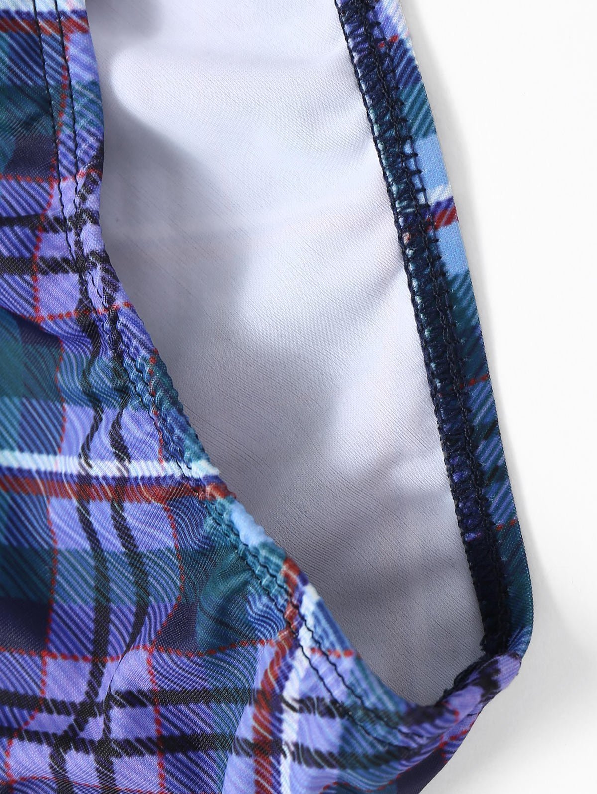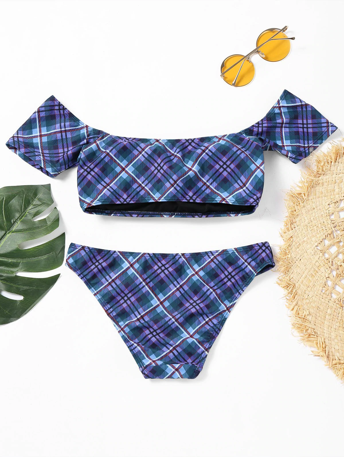 Hit the beach in this awesome plaid bikini set! This style features flirty off the shoulder design, comfy padding cups giving the lift you love, and a cheeky fit briefs.