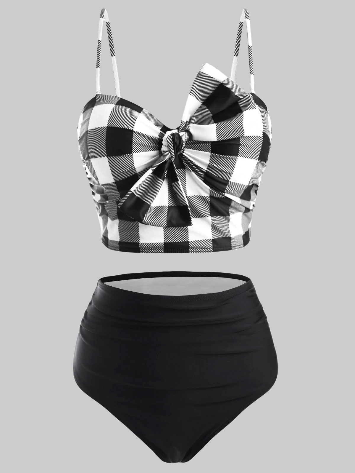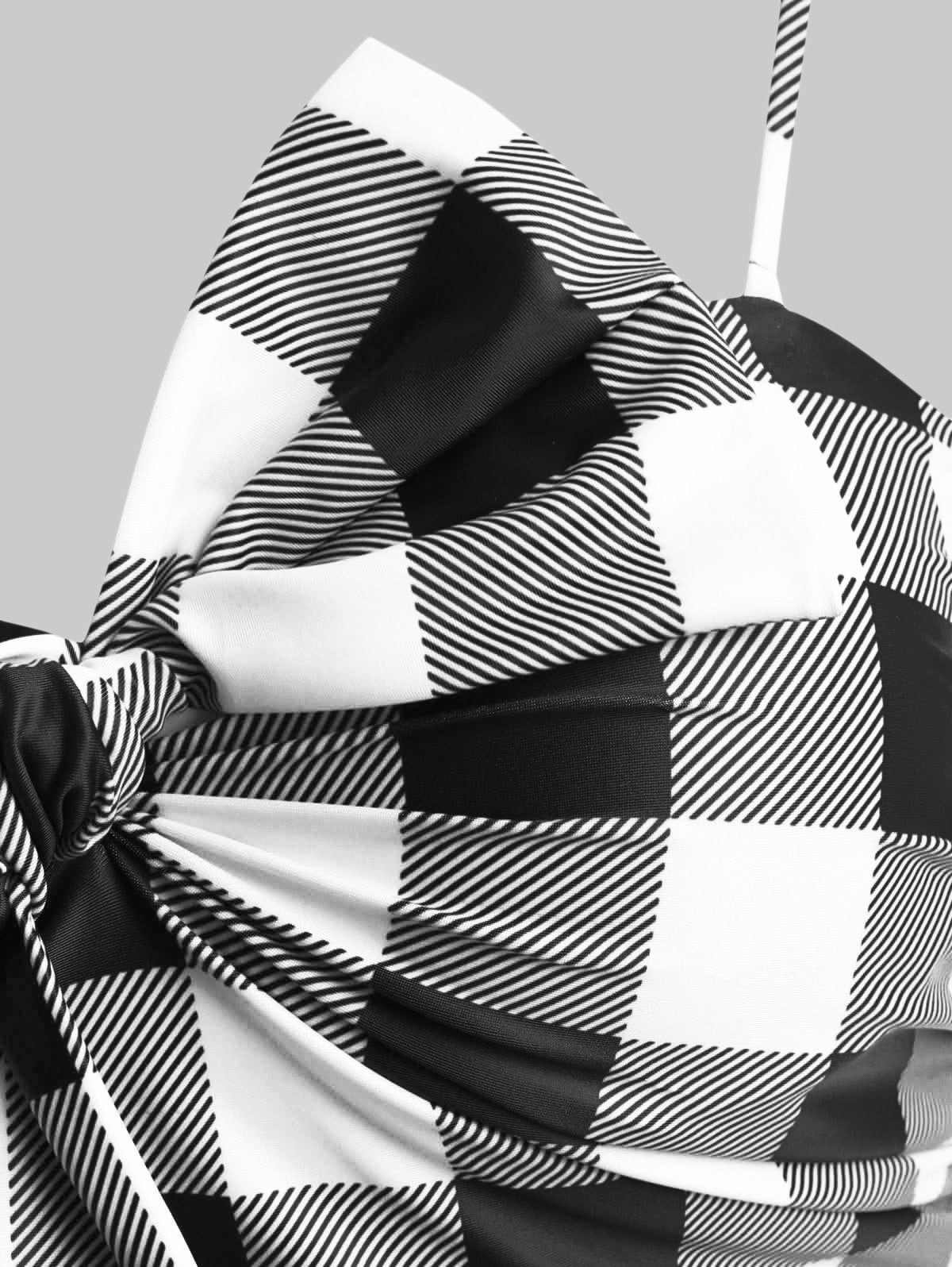Plaid Bowknot Push Up Ruched Tankini Swimwear