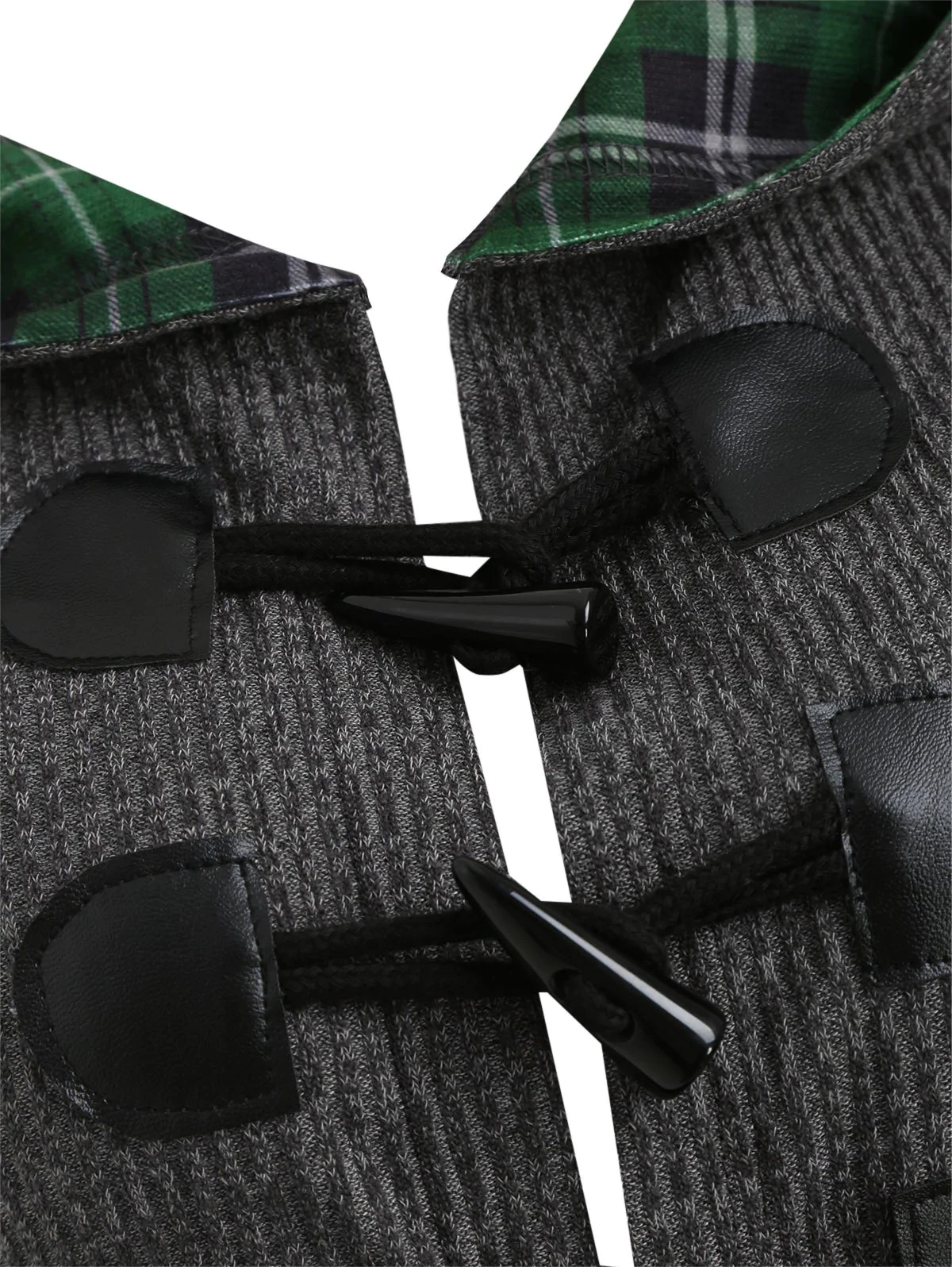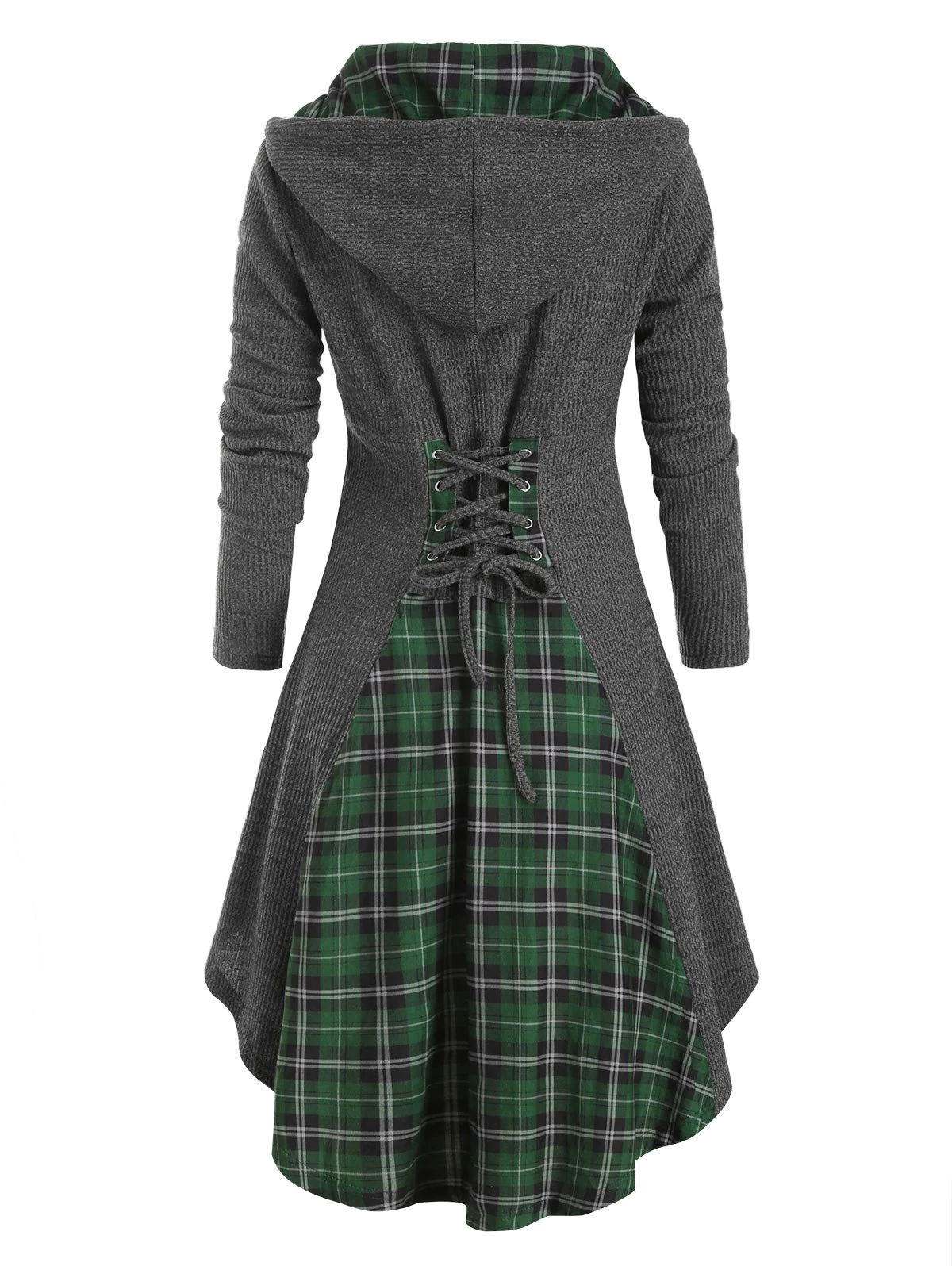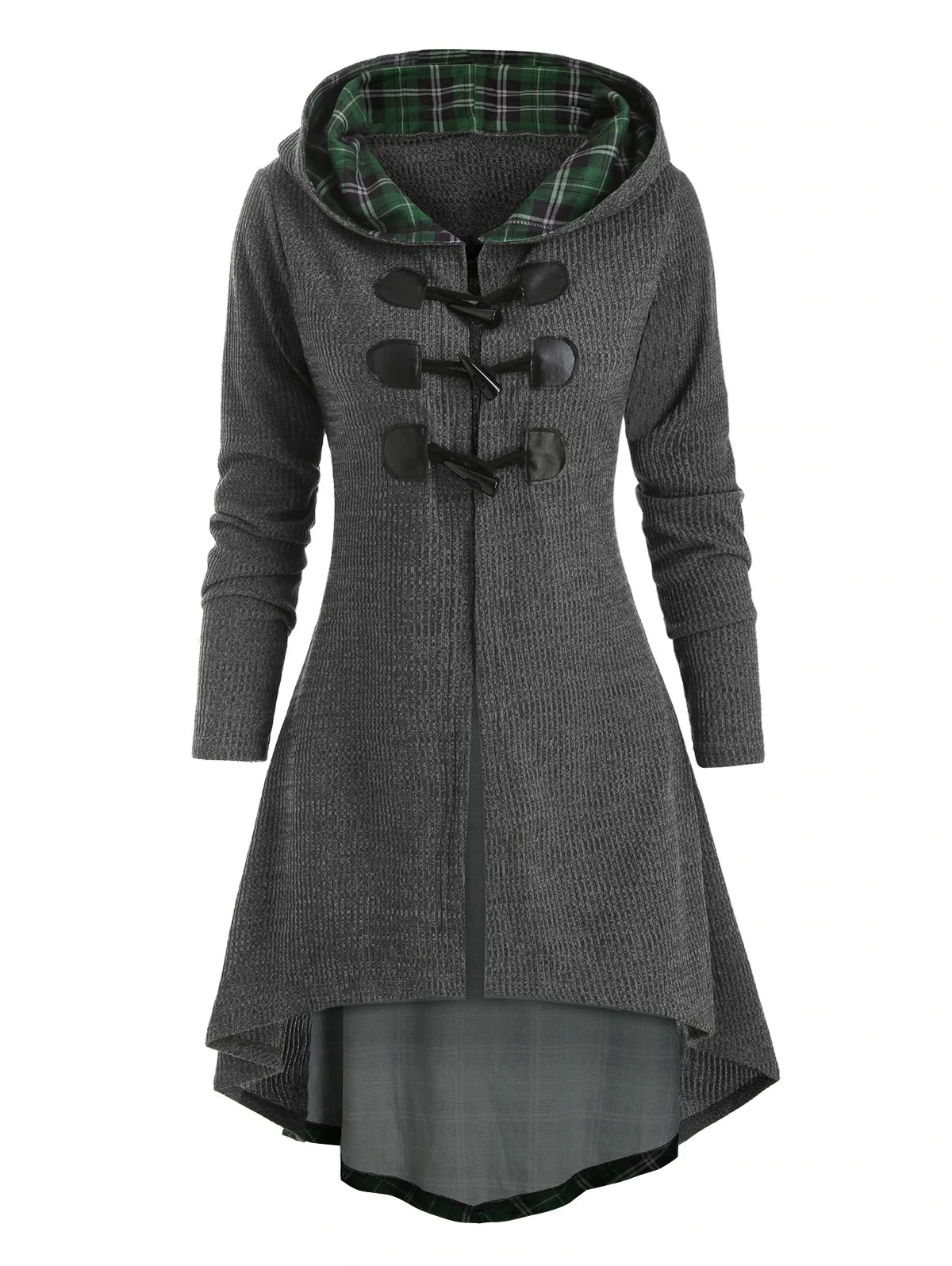 Plaid Horn Button Lace Up High Low Hooded Cardigan