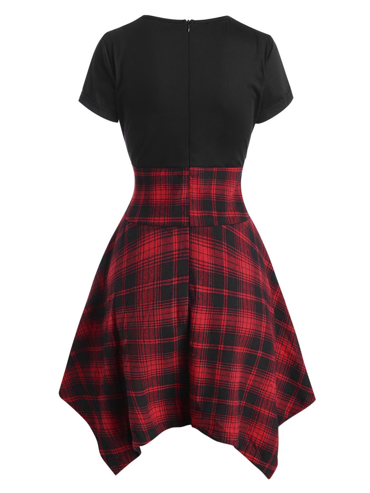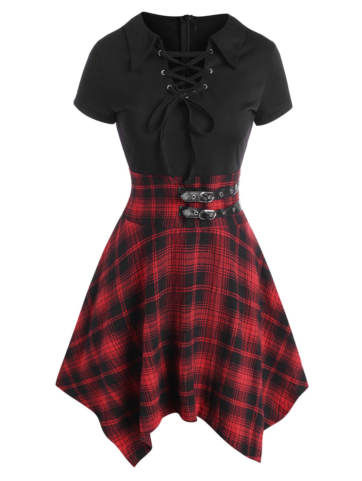 Plaid Lace Up Buckle Embellished Handkerchief Dress