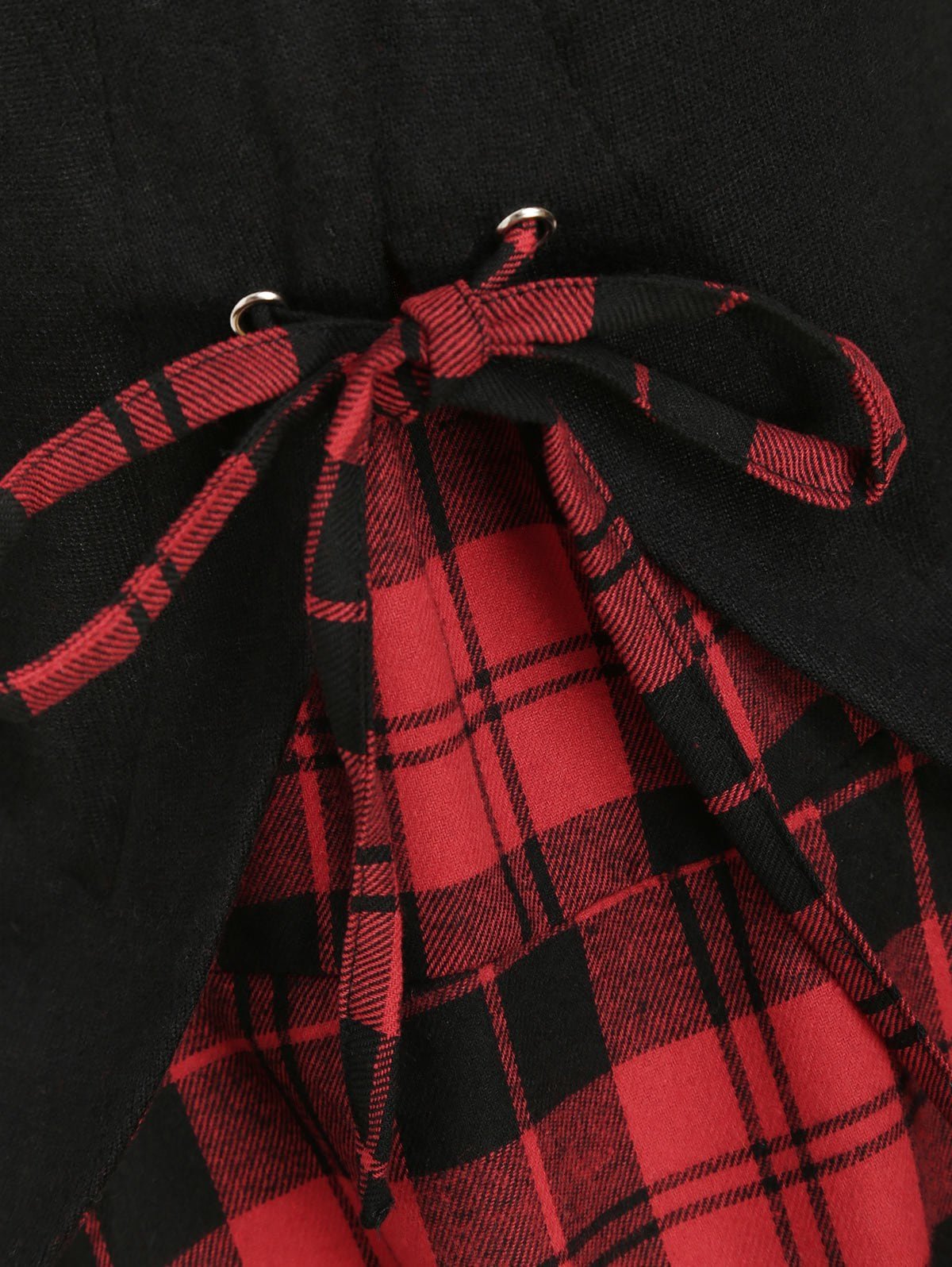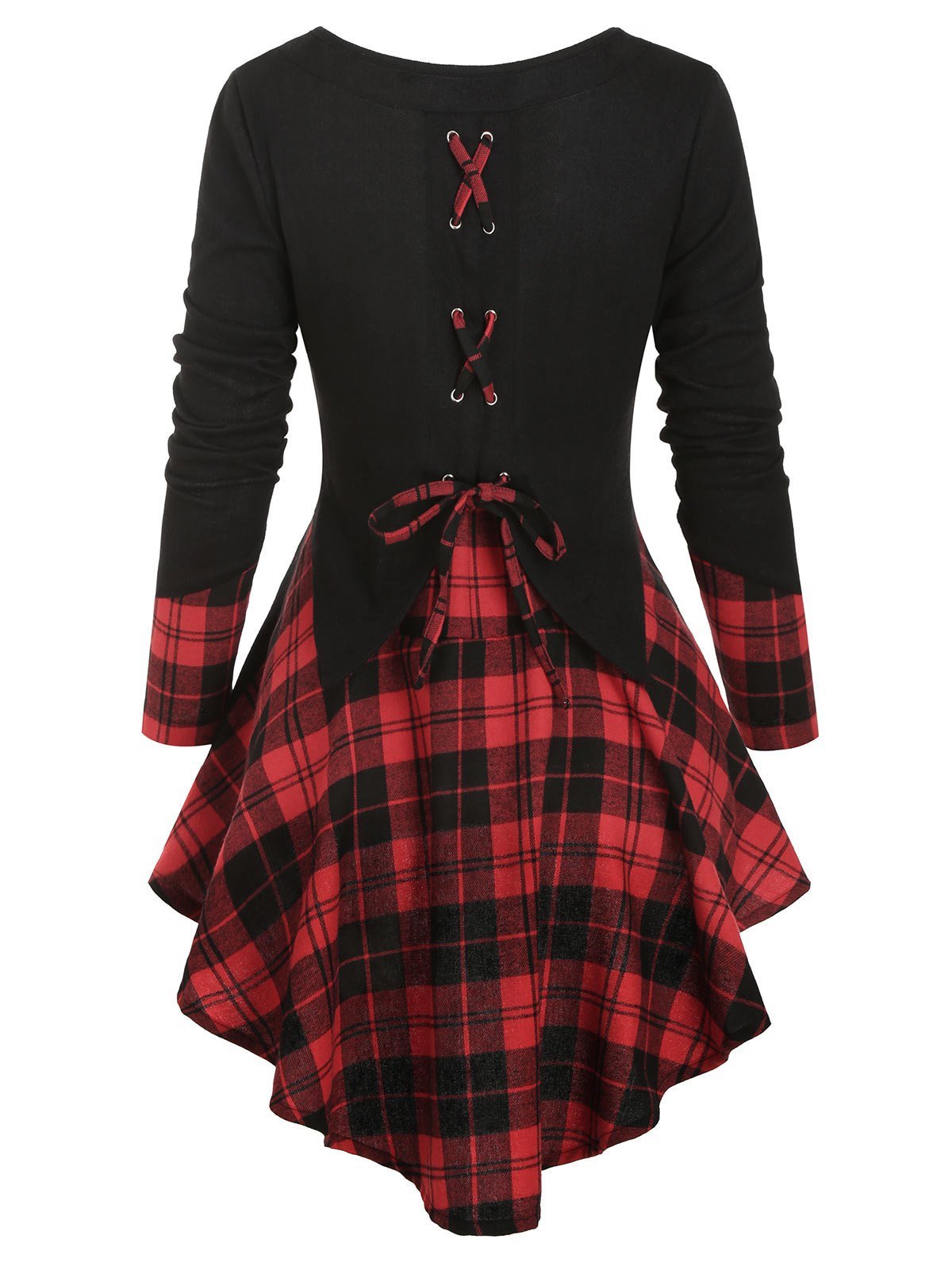 What makes this long knitwear unique is the plaid insert that makes a contrast with the solid bodice part to catch eyes. The back lace-up accent highlights your slim waist. And the longer hem gives the illusion of an elongated, more slender figure.