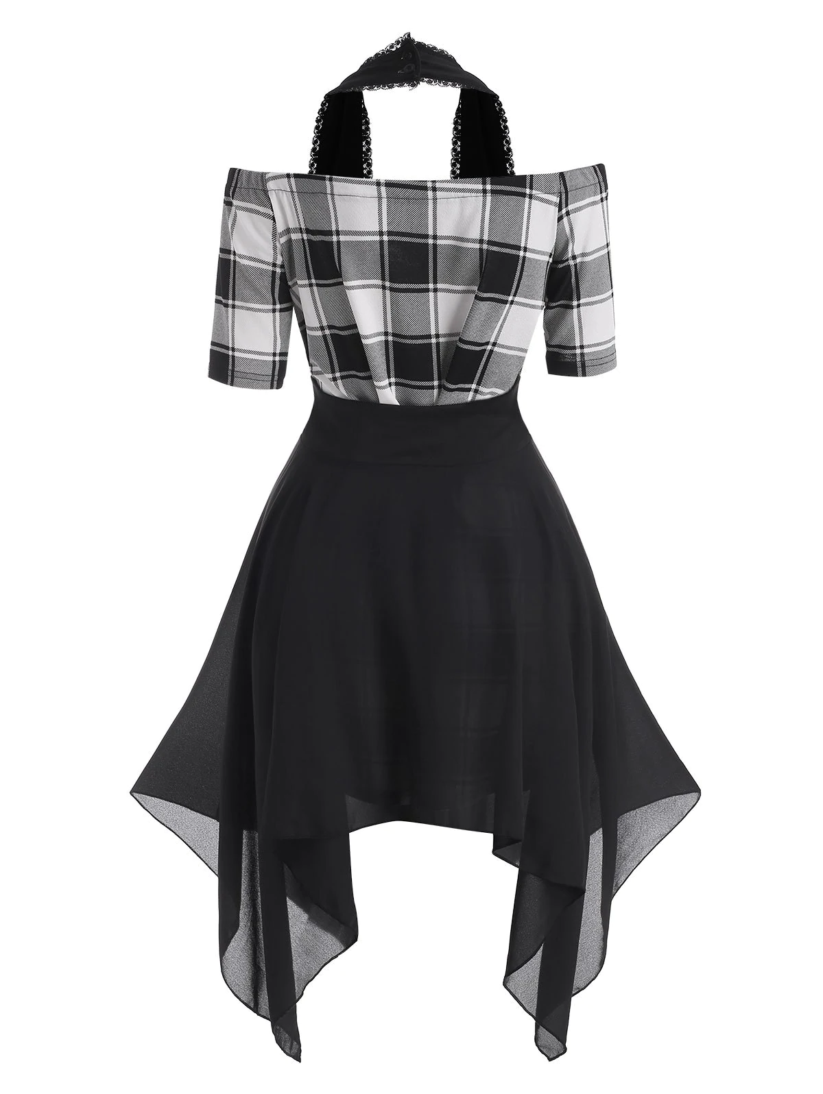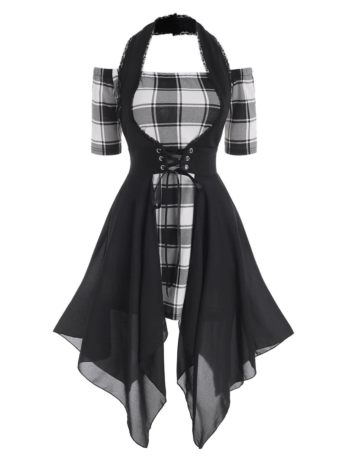 Plaid Off Shoulder Dress with Lace Up Halter Vest