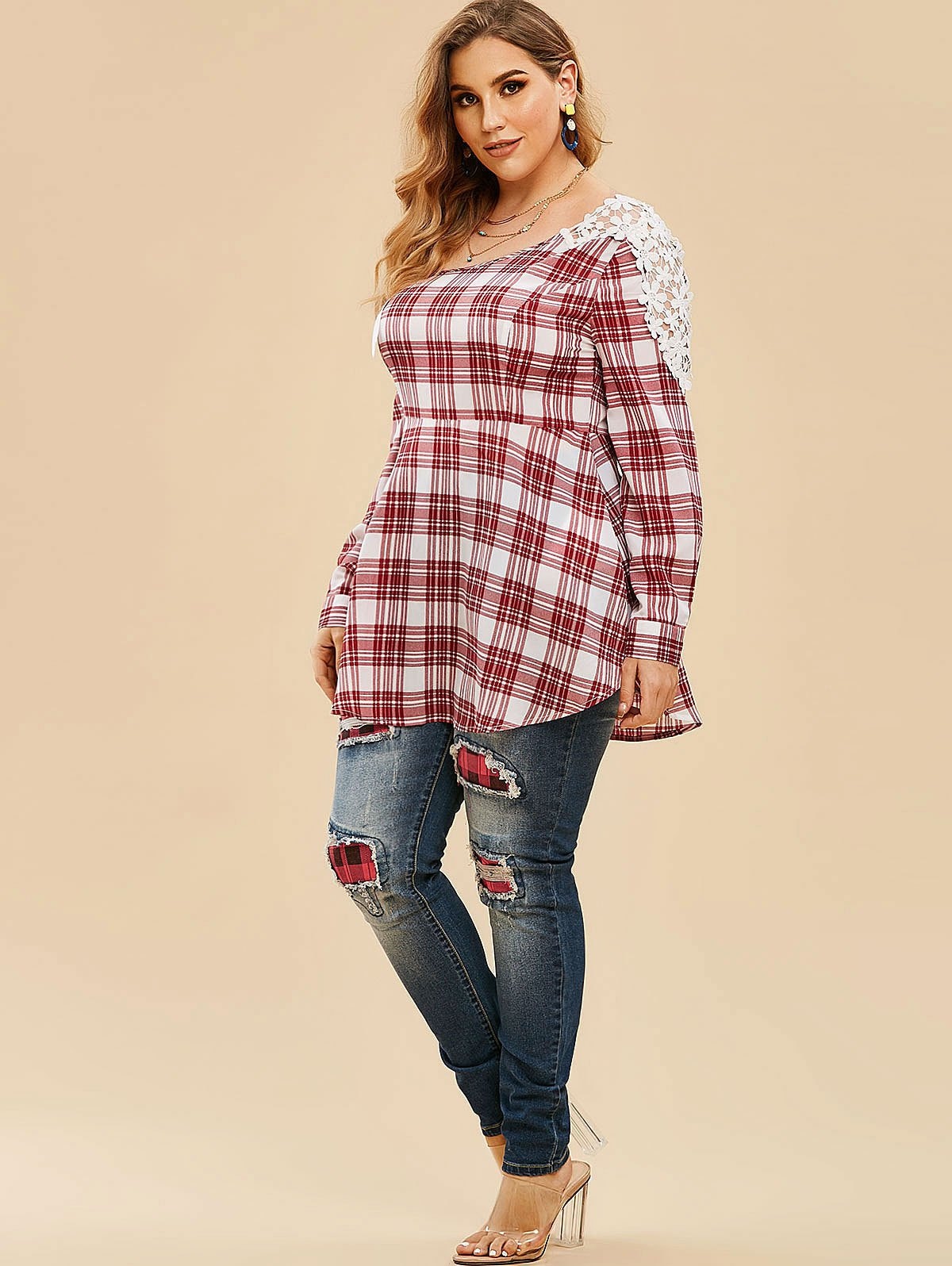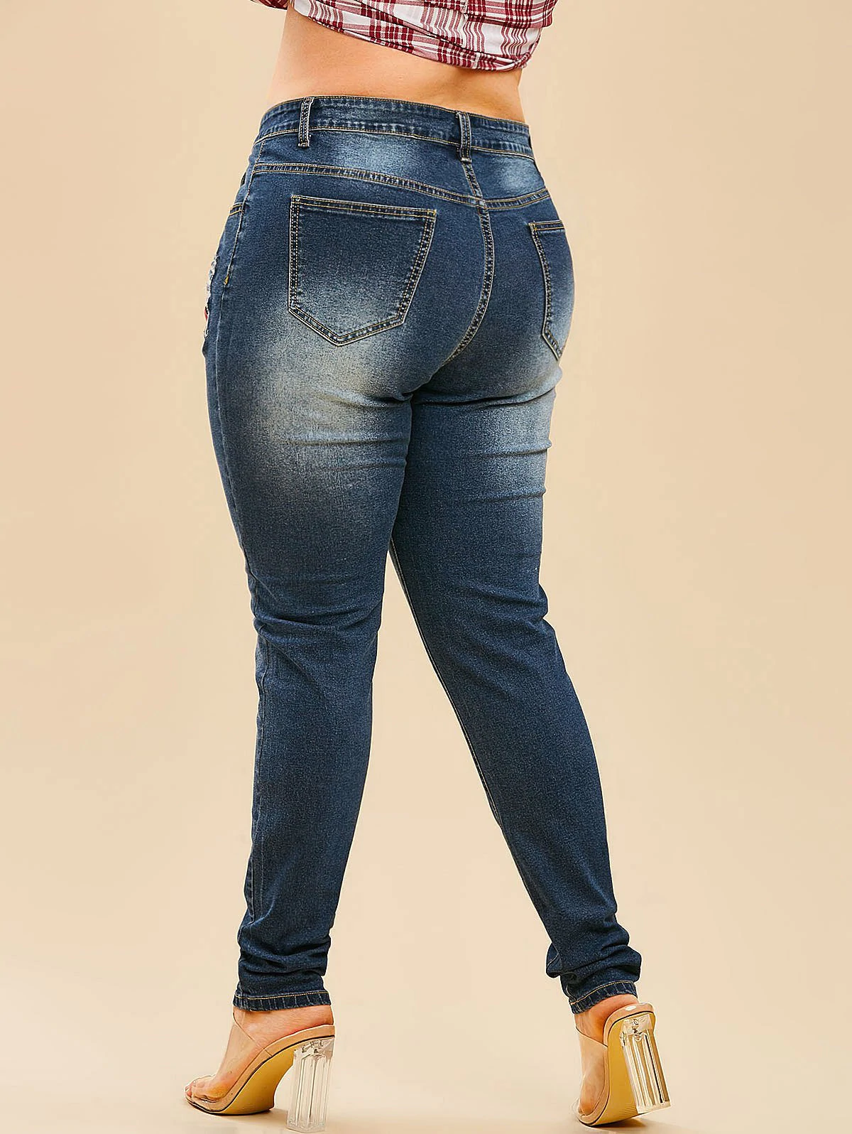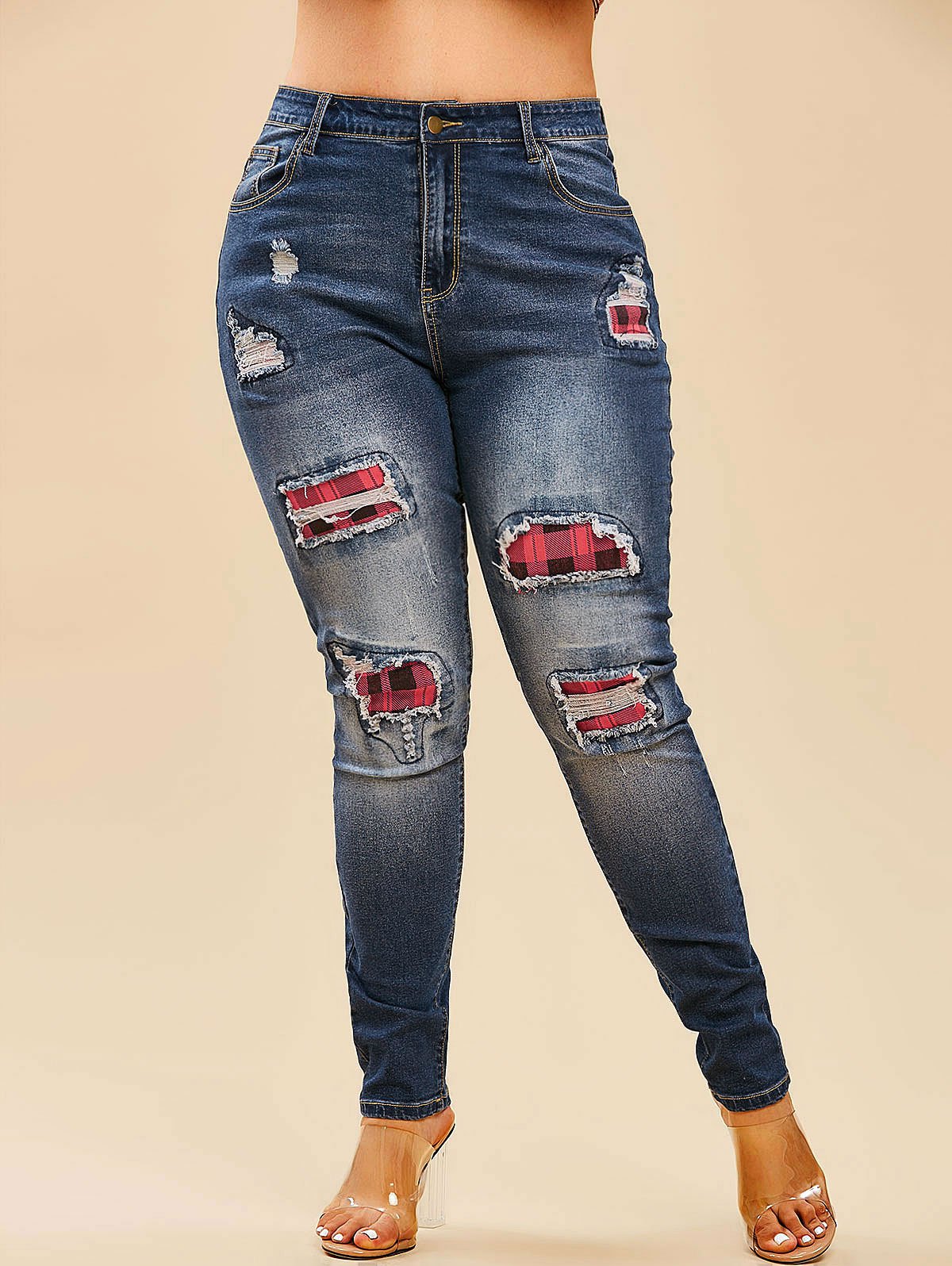 Plaid Panel Ripped Plus Size Skinny Jeans
