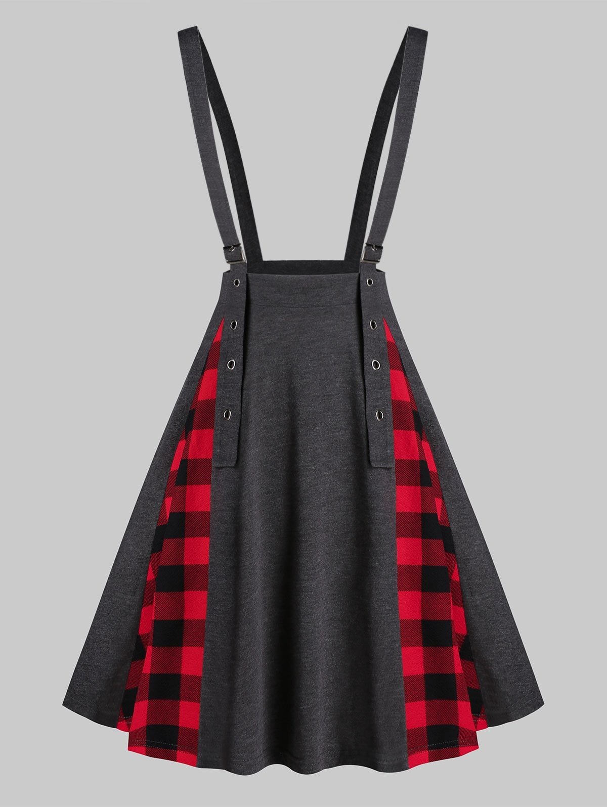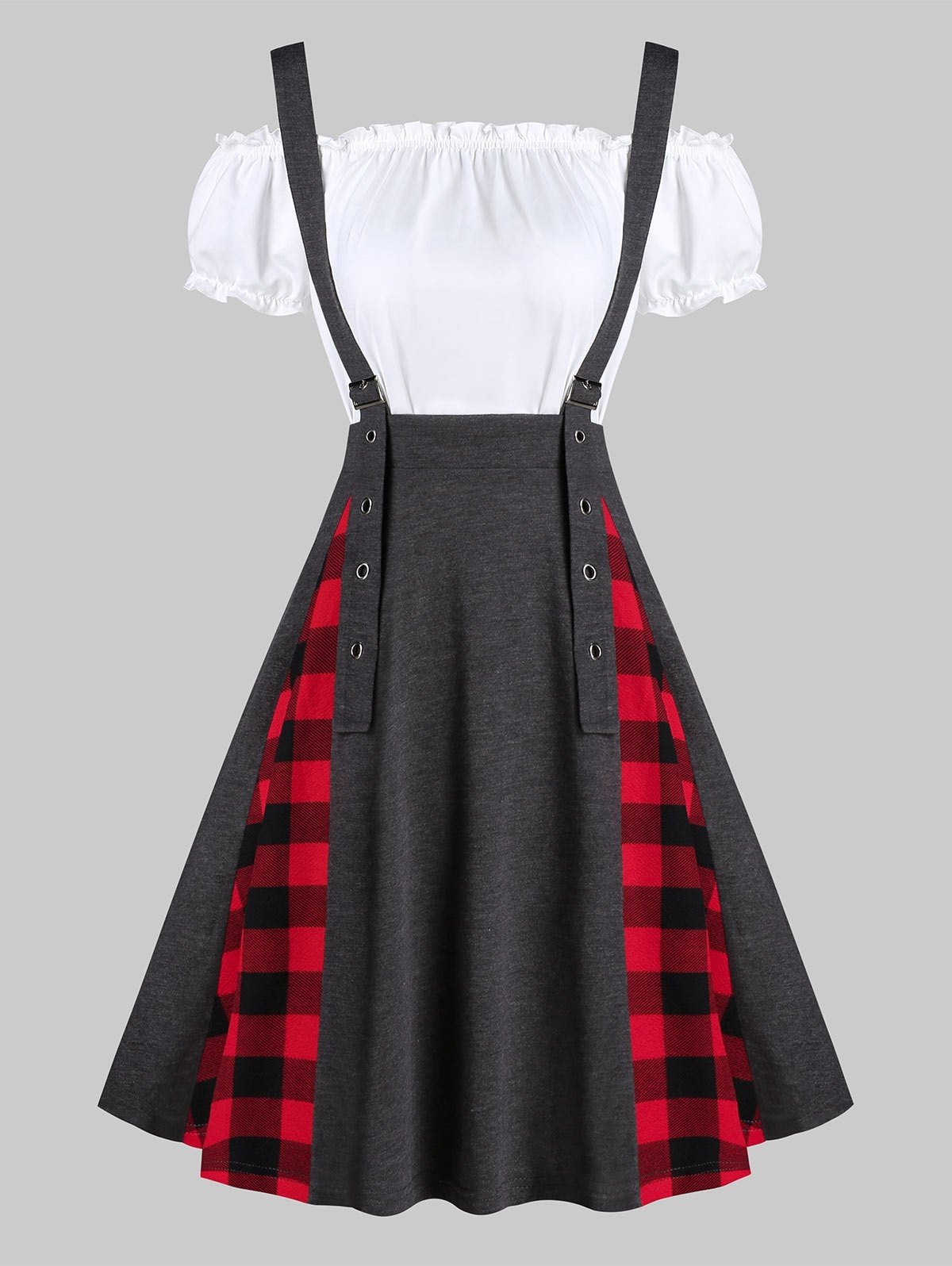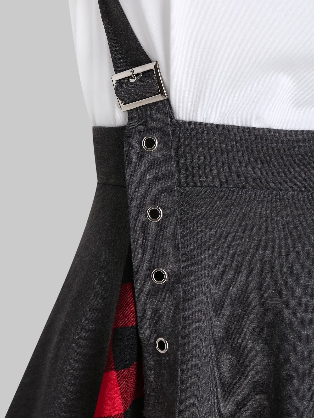 Plaid Print Buckle Strap Suspender Skirt and Plain Top