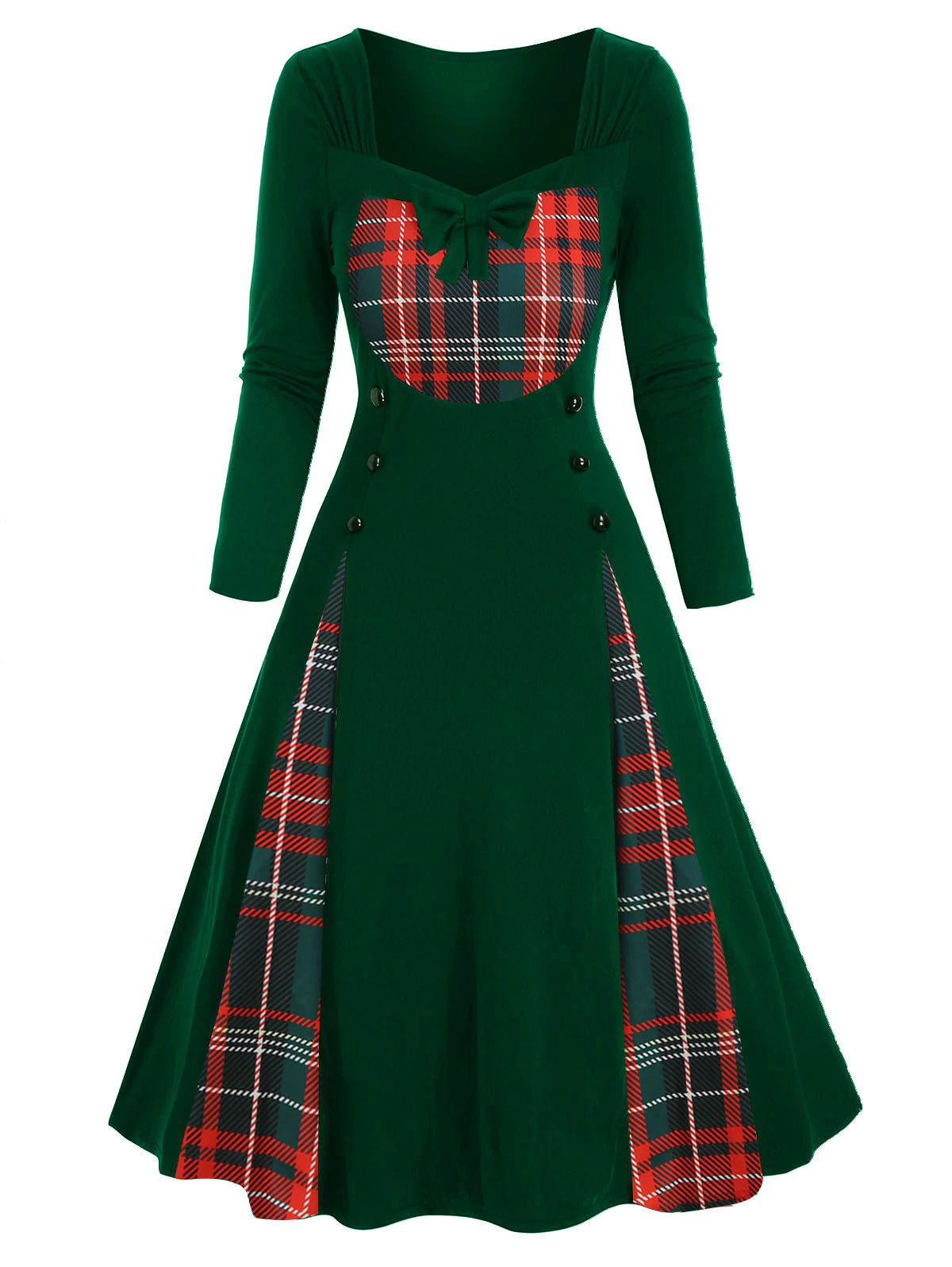 Create a charming sweetheart neckline for a little flirt and with a panel of the plaid pattern and the Christmas prints for a versatile classic look, this plus size long sleeve dress is accented with the fit-and-flare silhouette that is more fitted at the bodice and flared at the skirt for a feminine silhouette.