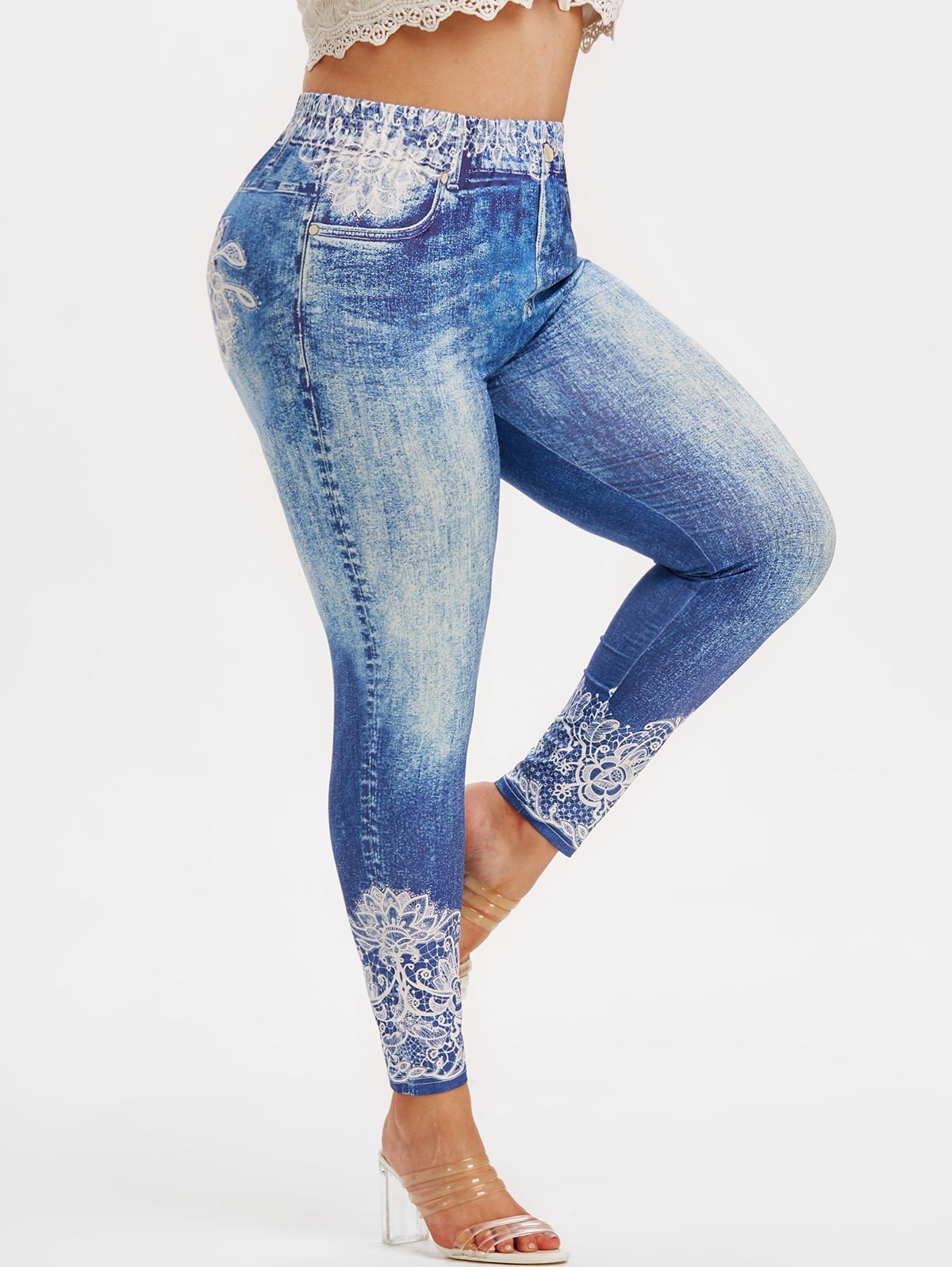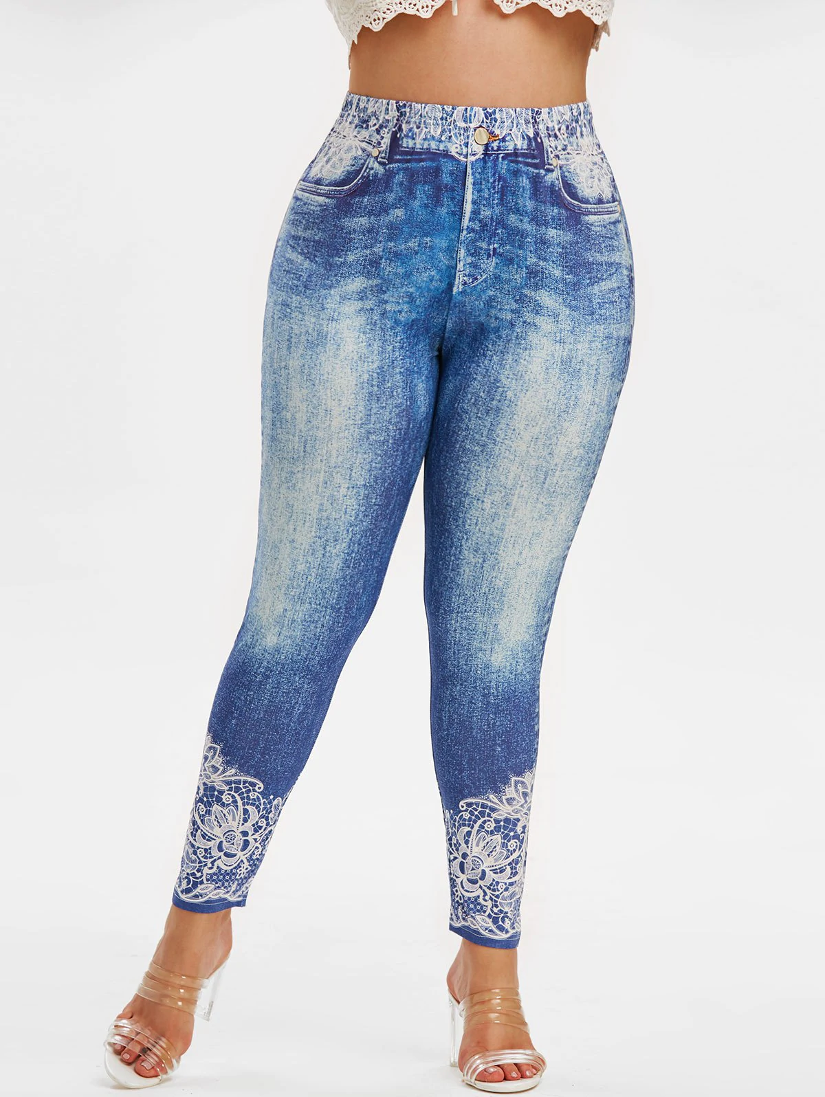 Plus Size 3D Lace Jean Print Tight Jeggings