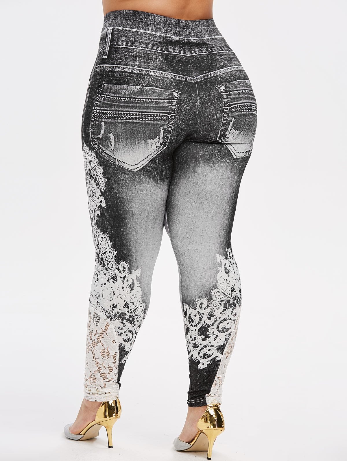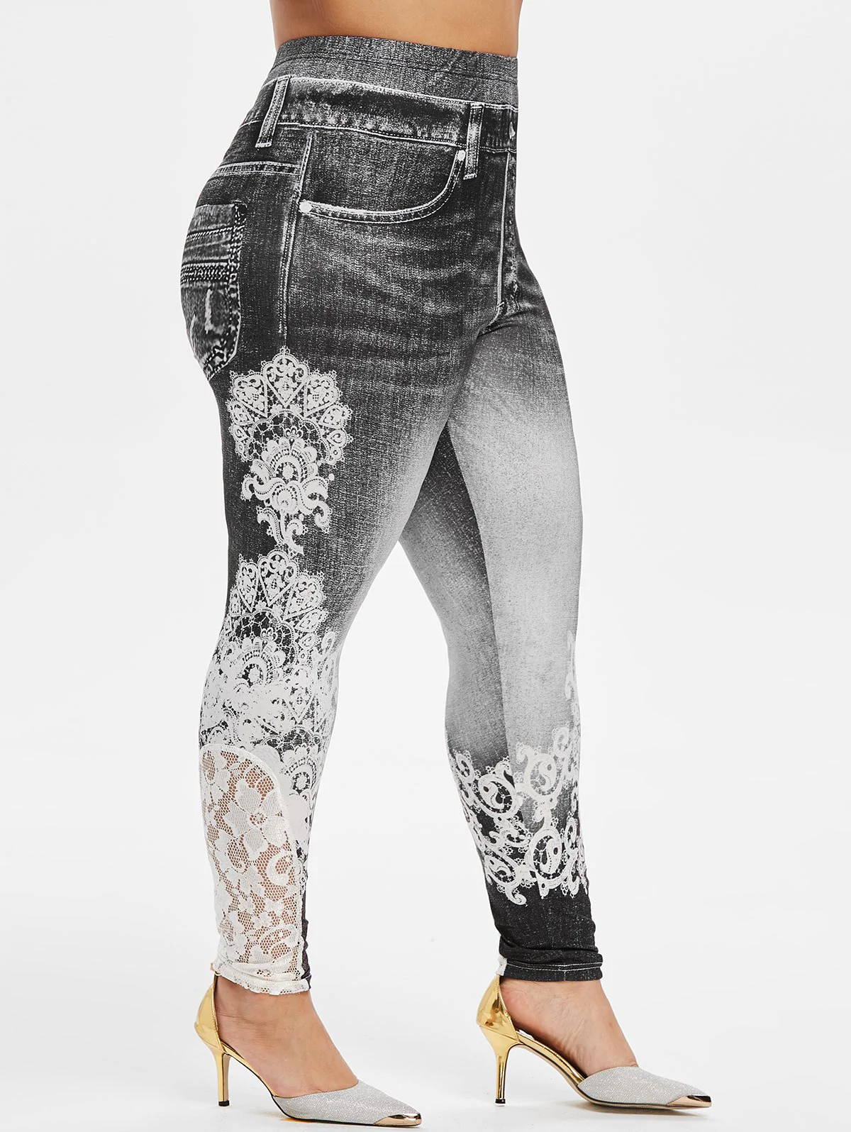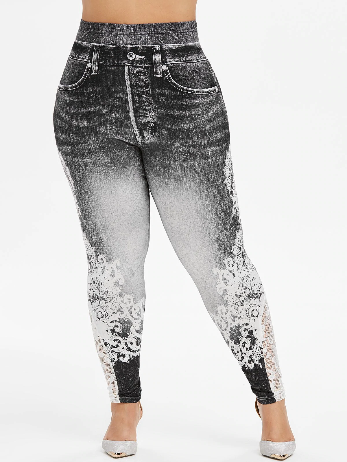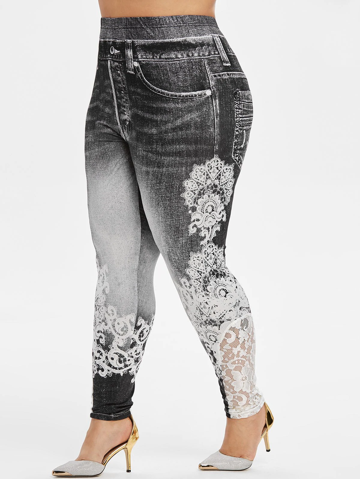 Plus Size 3D Print Lace Insert Jeggings