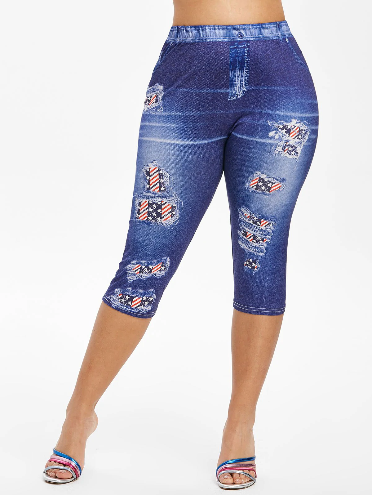 Perfect choice for gals who prefer the jeans style but wanna much more comforts, these capri jeggings definitely fit the bill. It's fashioned with American flag pattern and the 3D print pockets that look so real. A high waist helps to elongate the figure while offering full tummy controls.