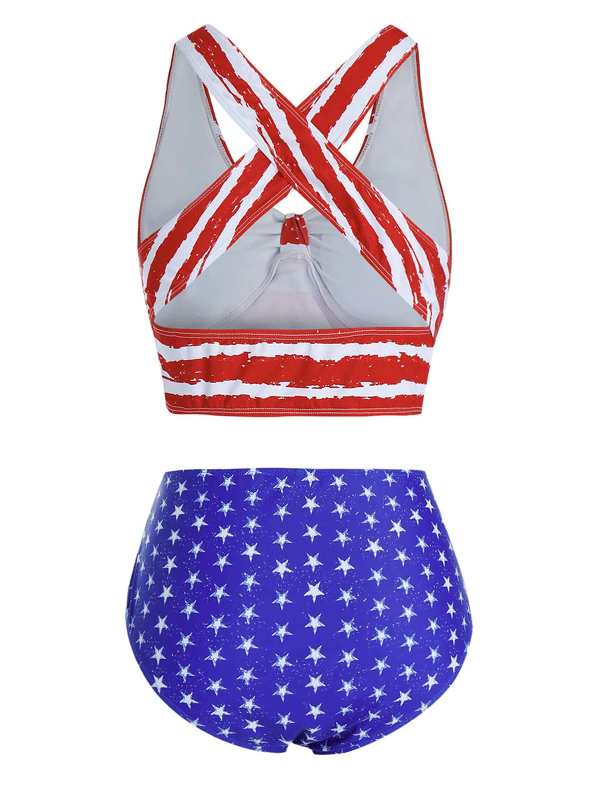 Plus Size American Flag Knotted Cross Back Tankini Swimwear