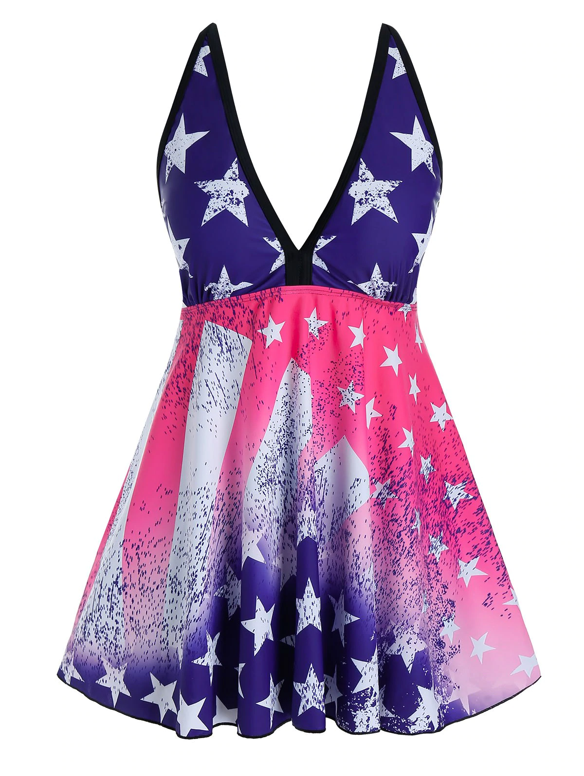 Plus Size American Flag Plunge Backless Tankini Swimwear