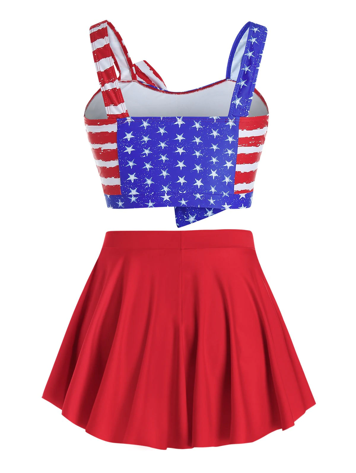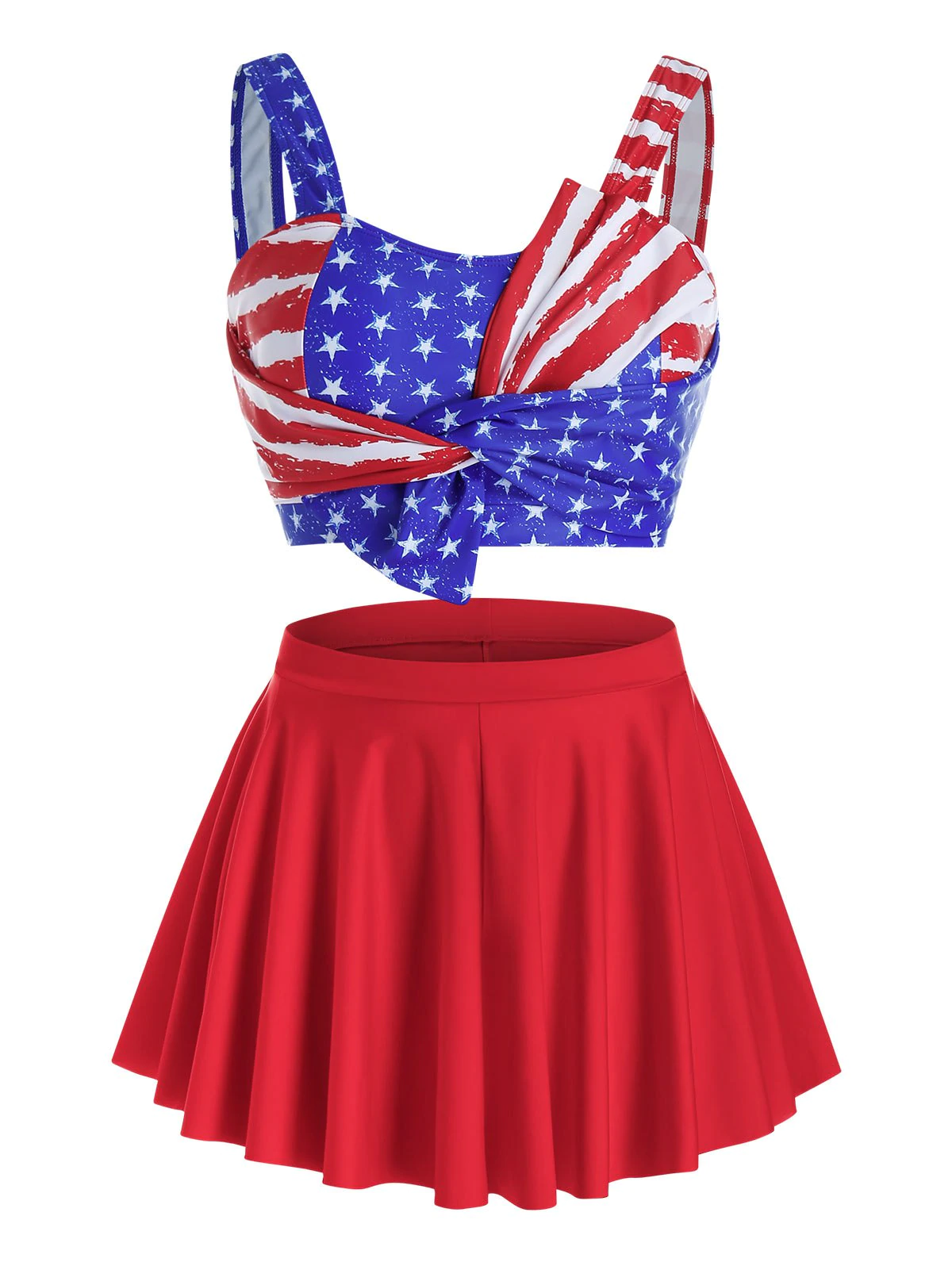 Looks so sassy yet a little flirty, this three-pieces swimsuit features an American flag top with front twisted detail that seems like a bowknot to some extent and a pleated draped A-line skirt. A high-waisted bottom also included completing the chic beach style.