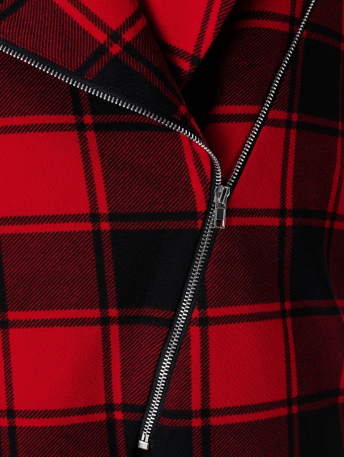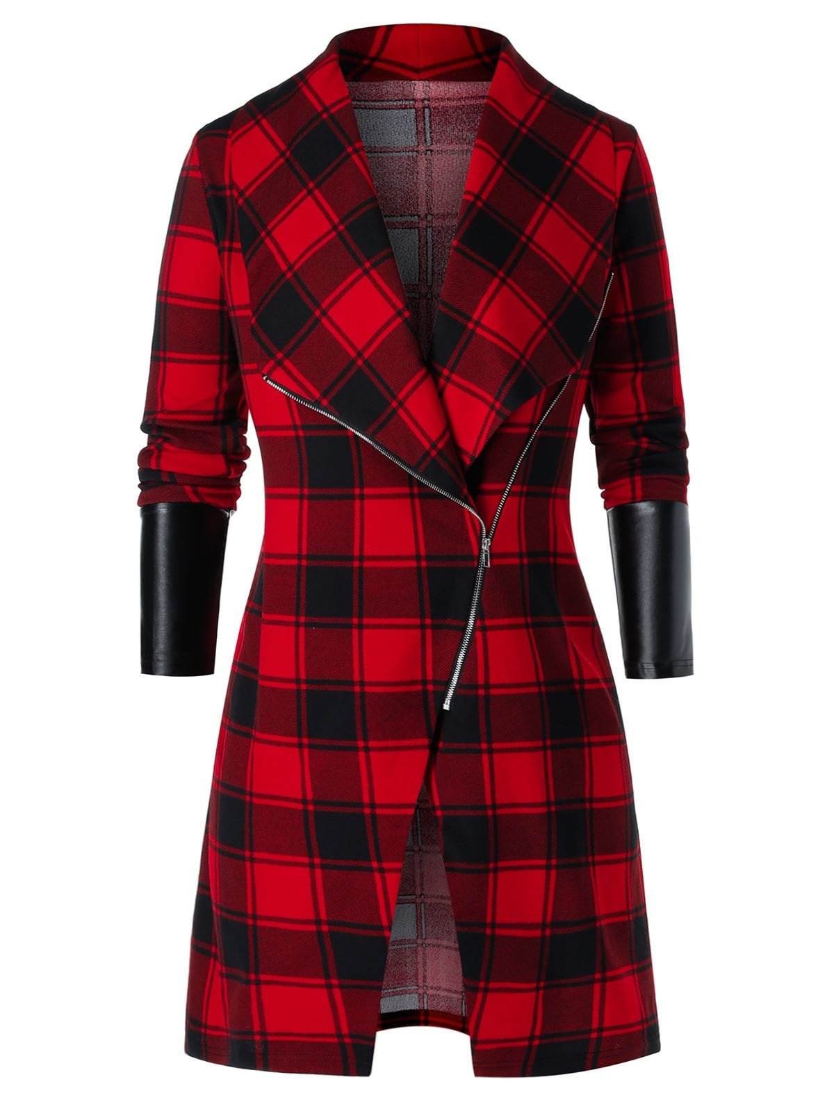 Plus Size Asymmetric Zip Plaid PU Leather Panel Tunic Coat