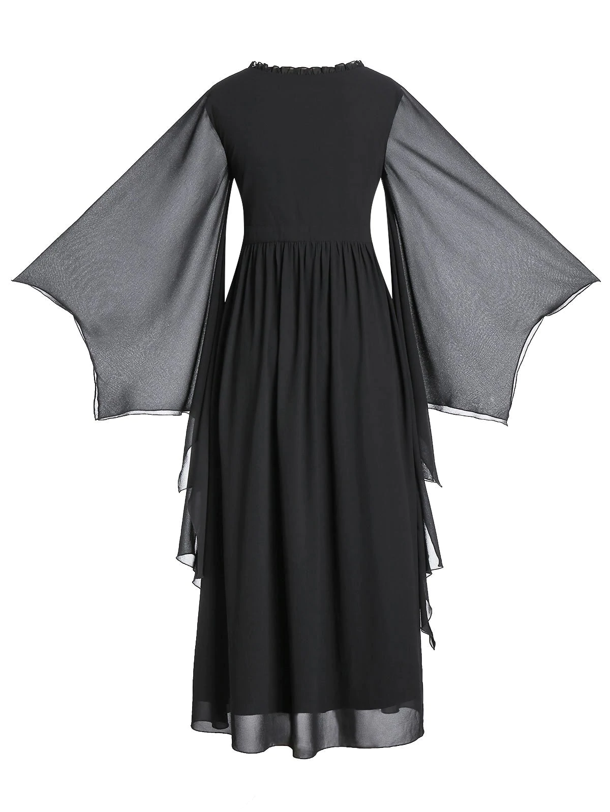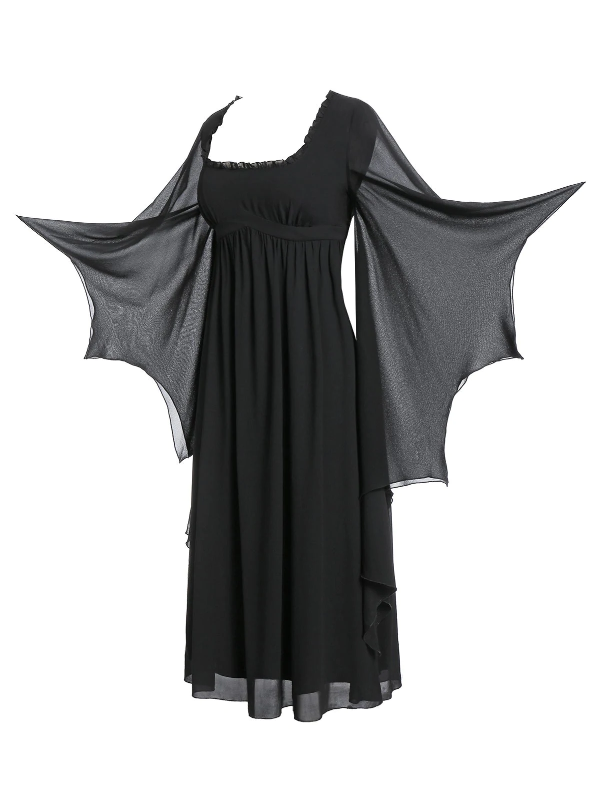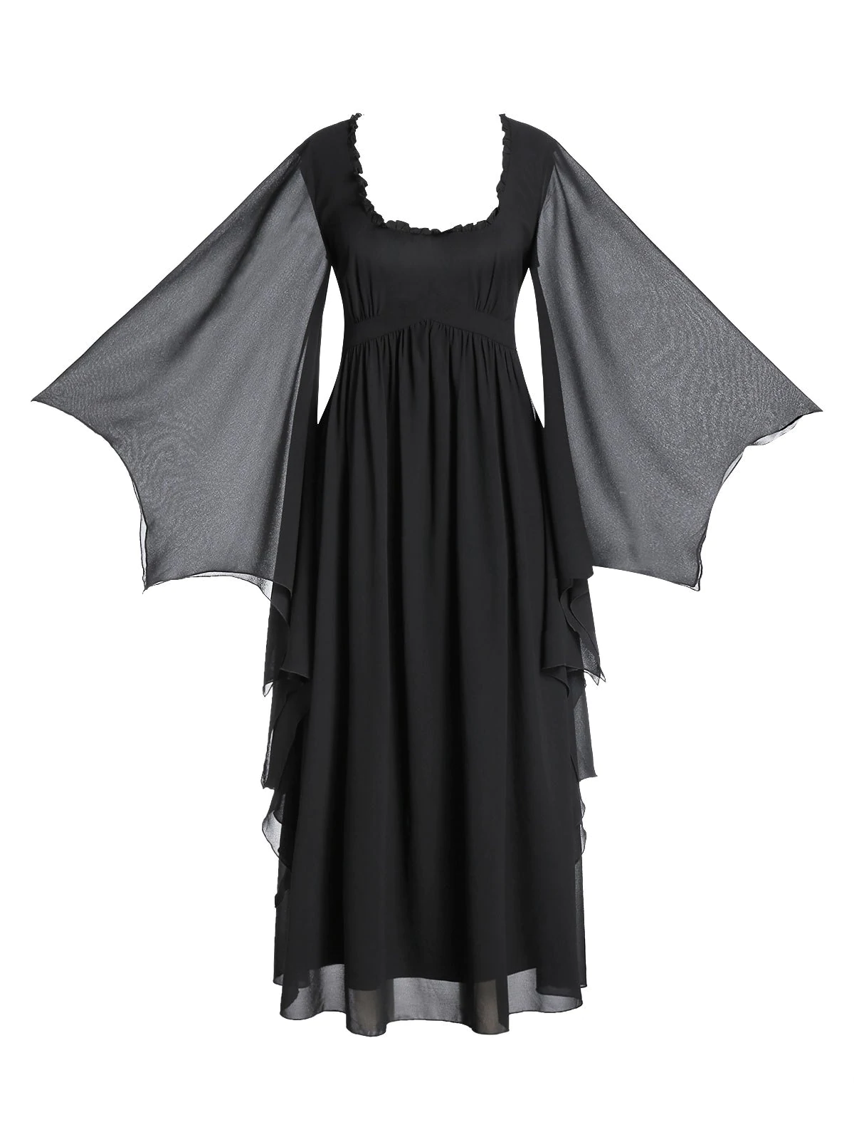 This gorgeous piece of gothic clothing is covered in black and features dramatic witchy bell sleeves. Super flattering, this beautiful dress also has a square neck with ruffled details and an empire waist silhouette. Perfect for evenings out or for prom, this dress looks stunning on.
