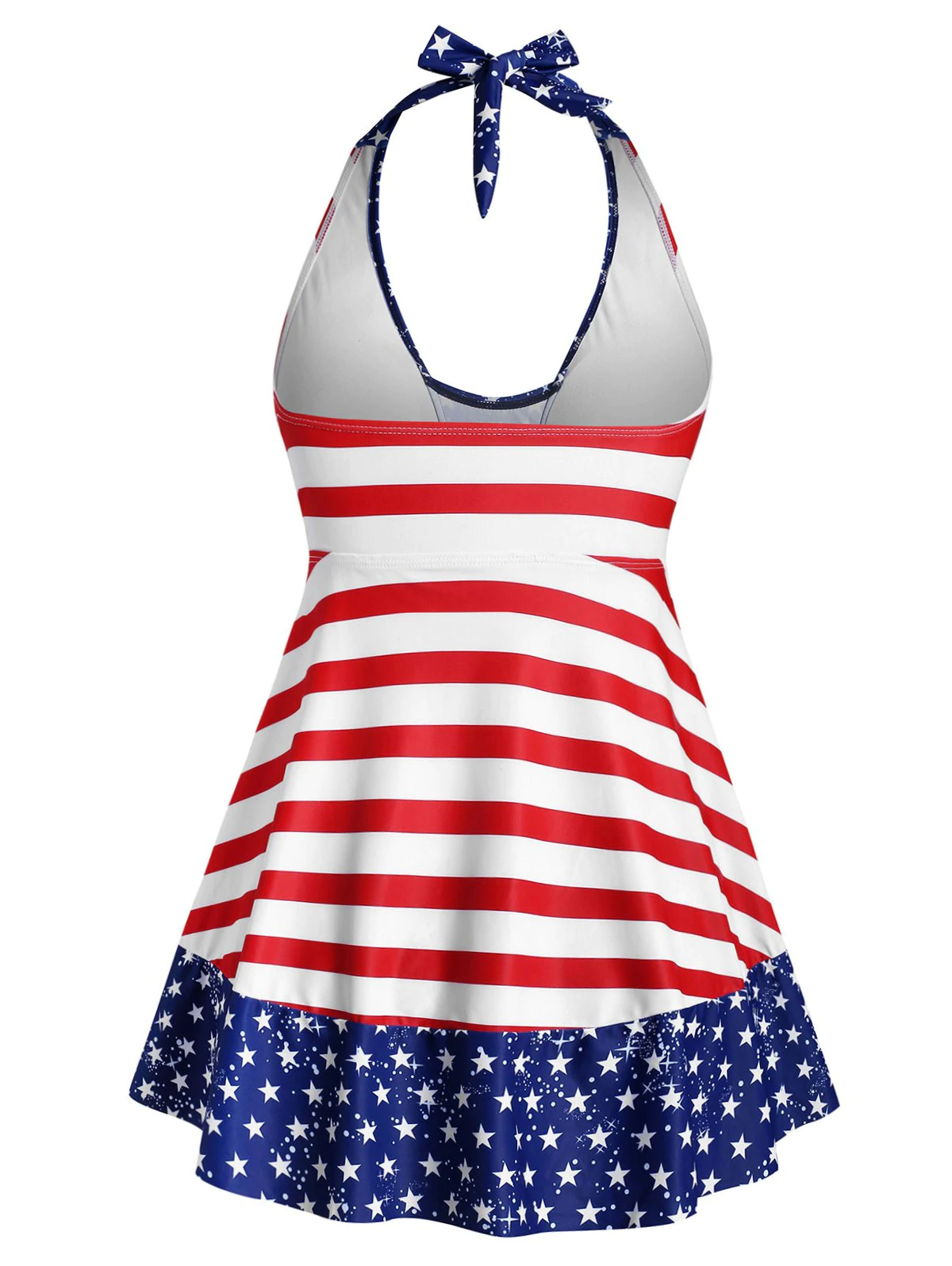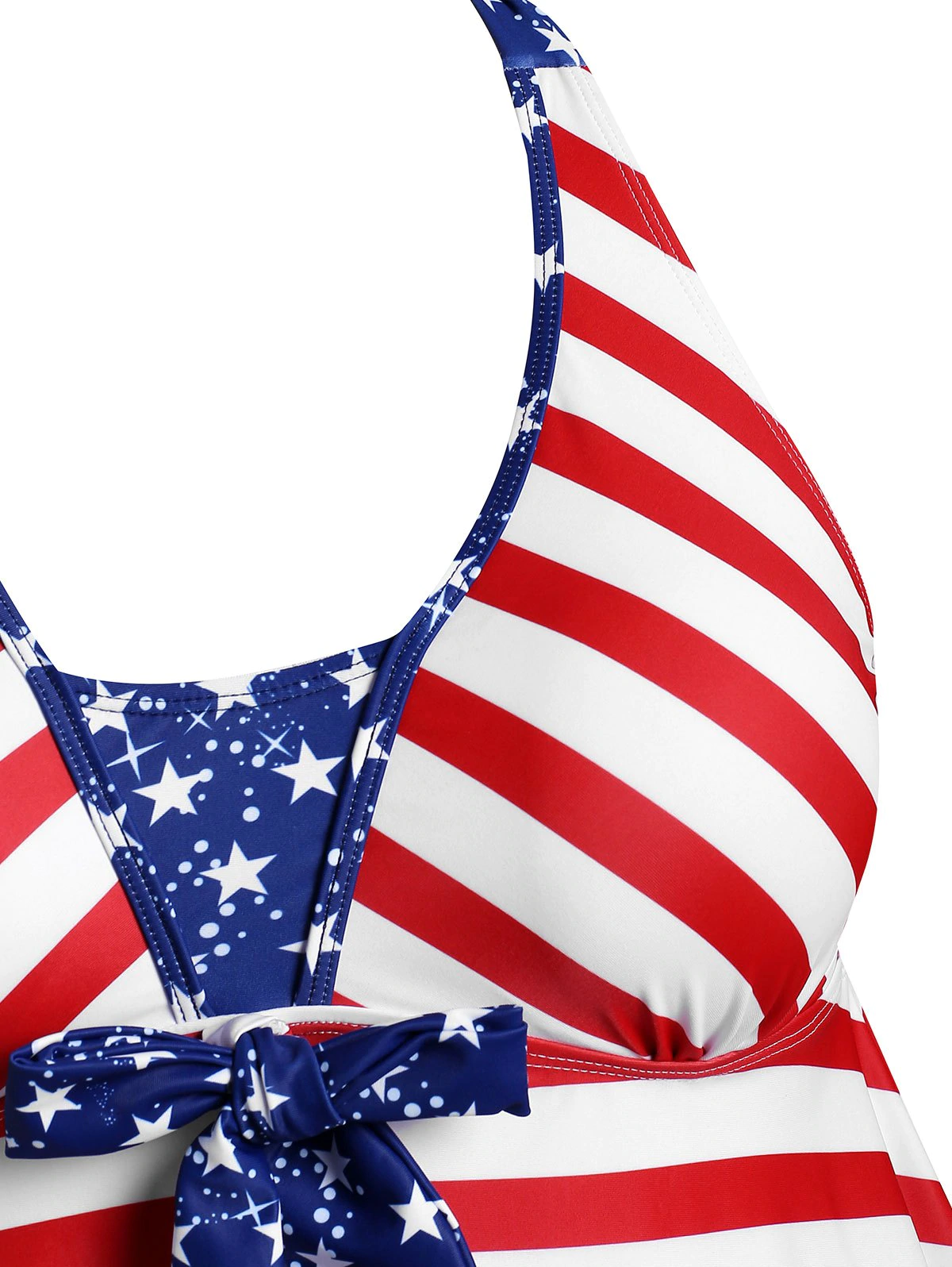 Securely covering your body, but not your loveliness! This is a lovely patriotic skirted tankini swimwear that you will love. The bowknot helps to highlight your slim waist, while the open back shows your summer body under the sun. Matching with a high waisted star print bottom to complete the look!