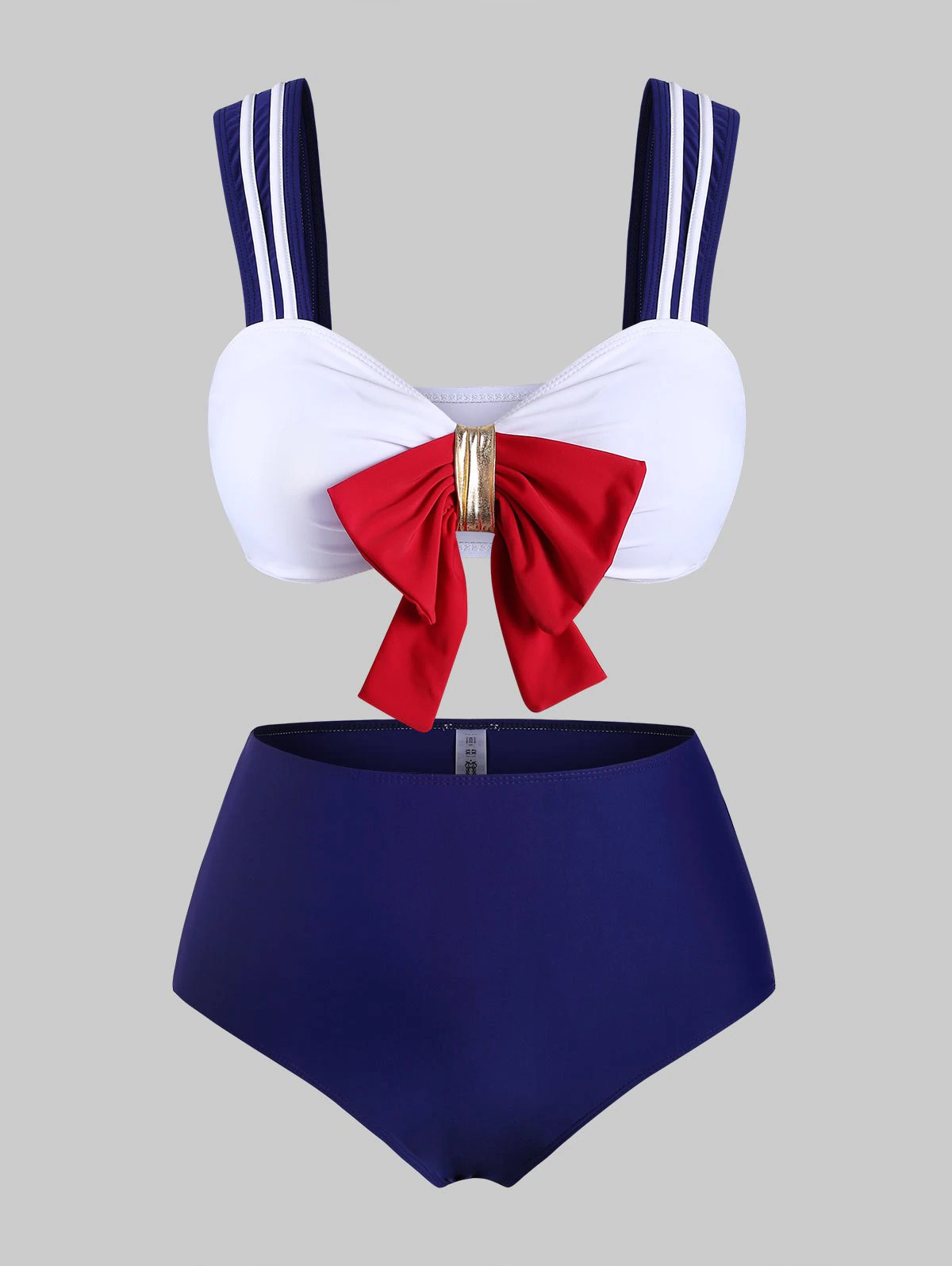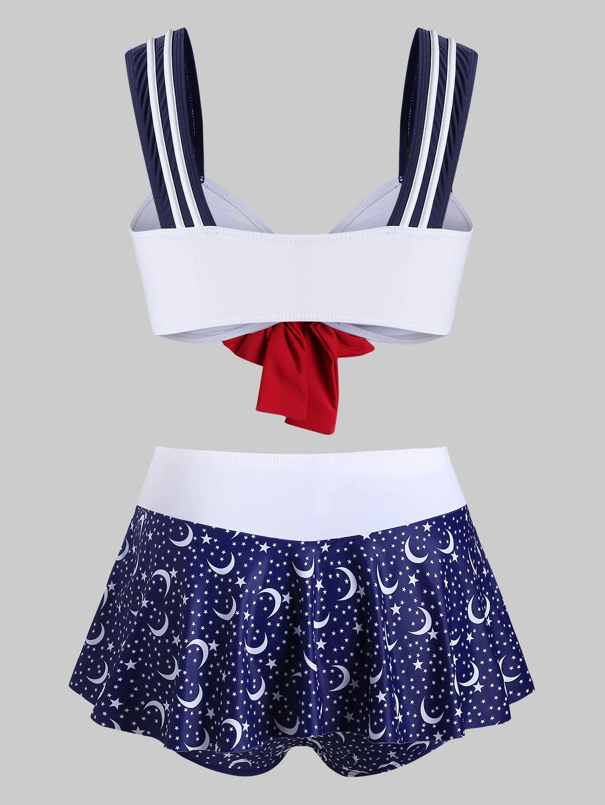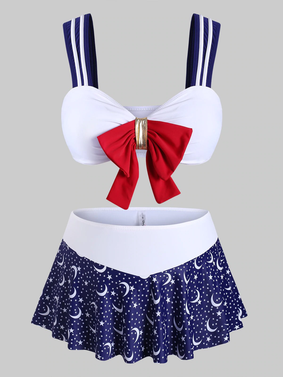 Plus Size Bowknot Moon and Stars Print Three Piece Swimwear