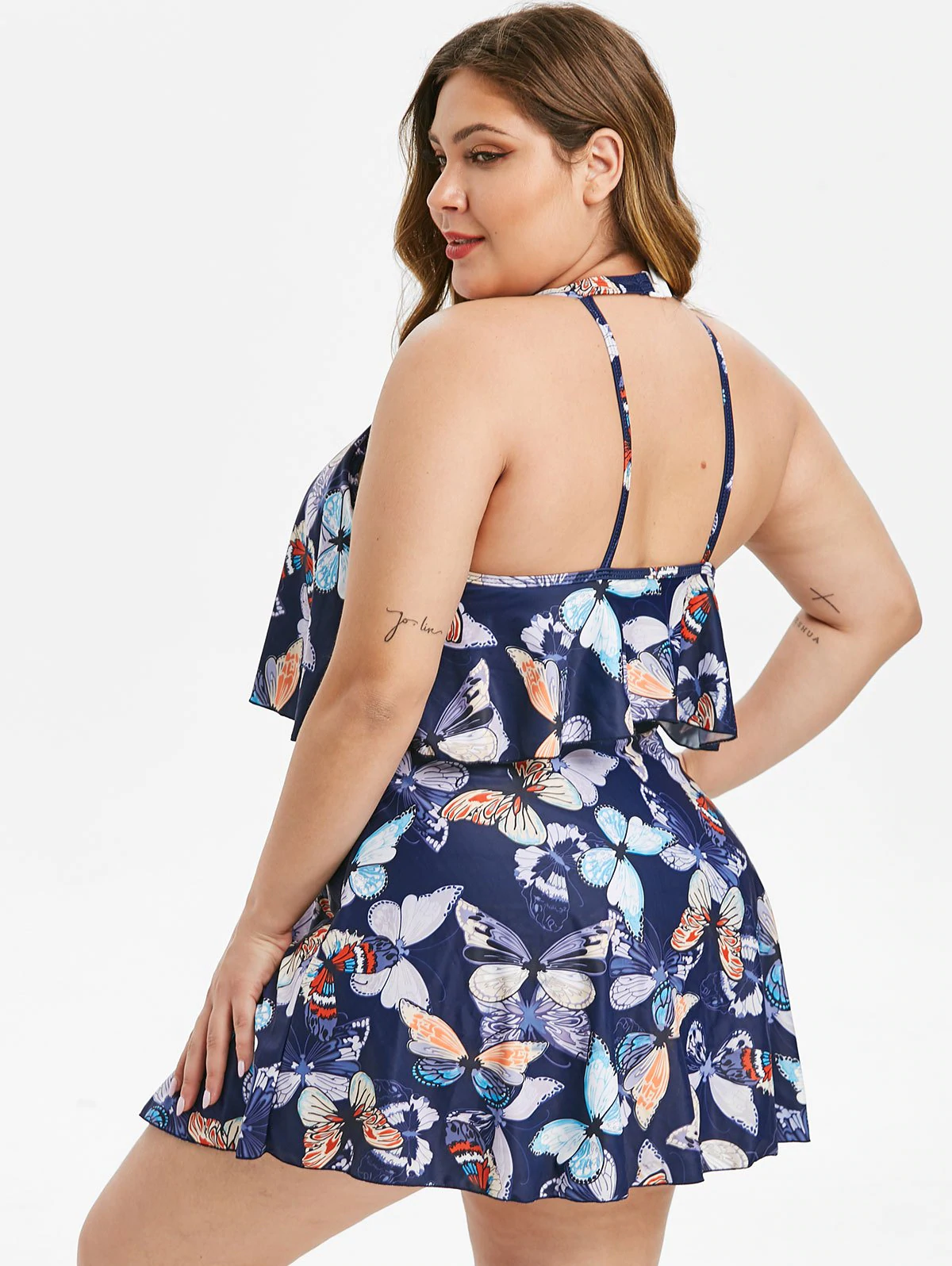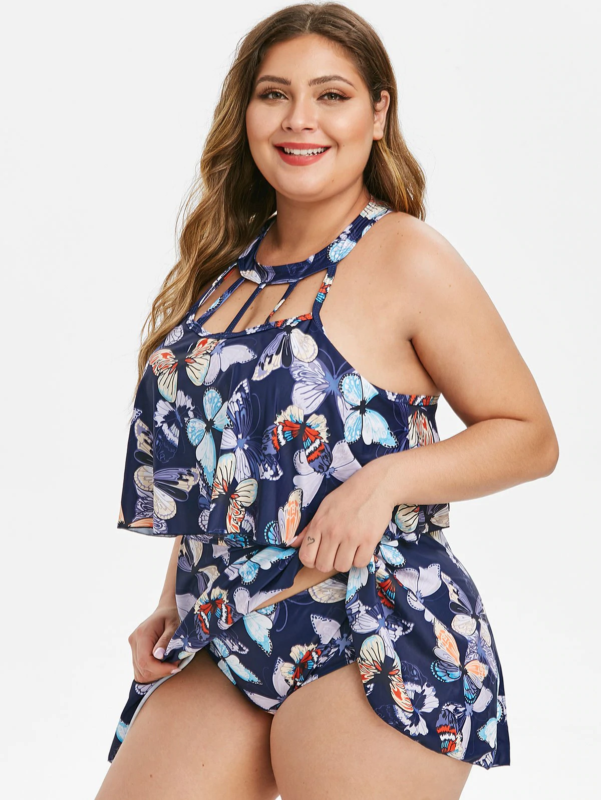3 reviews for Plus Size Butterfly Print Cut Out Flounce Tankini Set