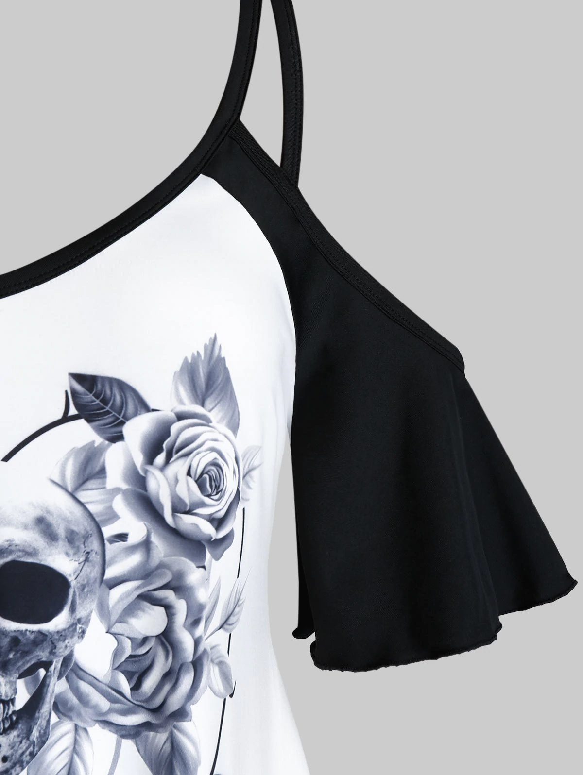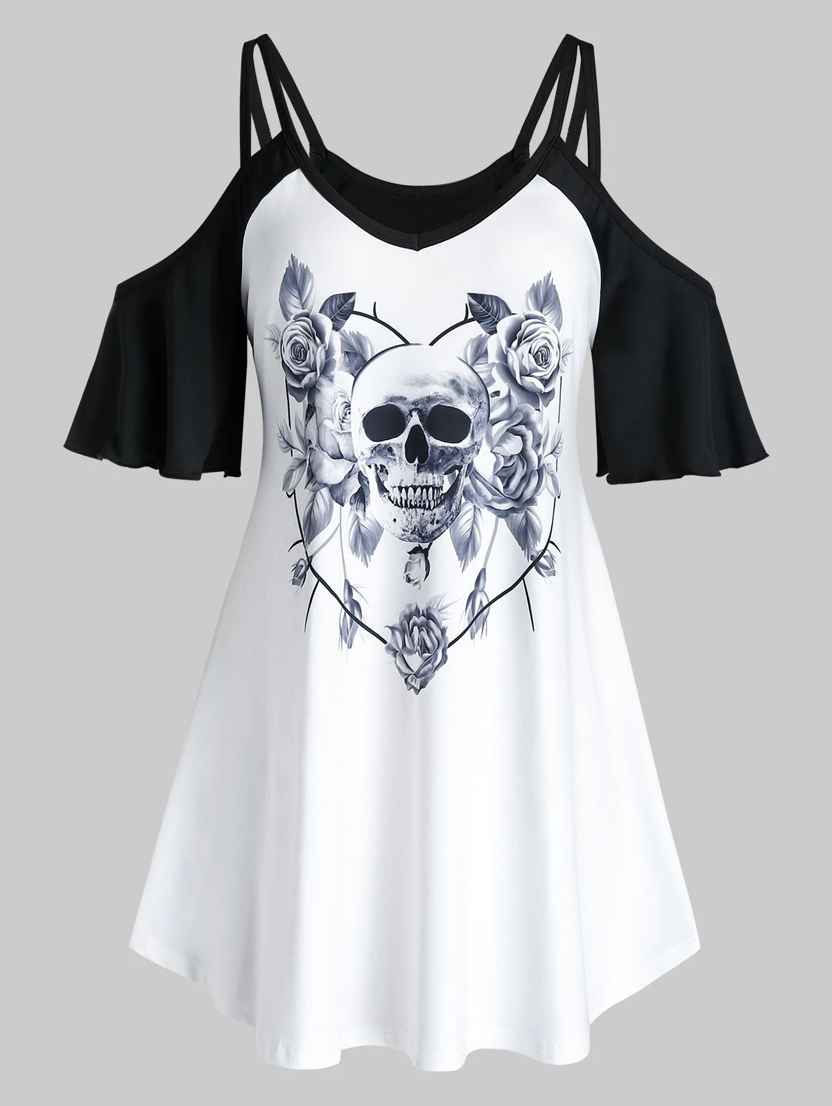 Floral skull print pattern plays up the punk style of a casual-cool tee done in soft cotton. It also features flattering cold shoulders and flutter sleeves which gives it a very feminine drape. Throw this comfortable tee on denim shorts for a chic look.