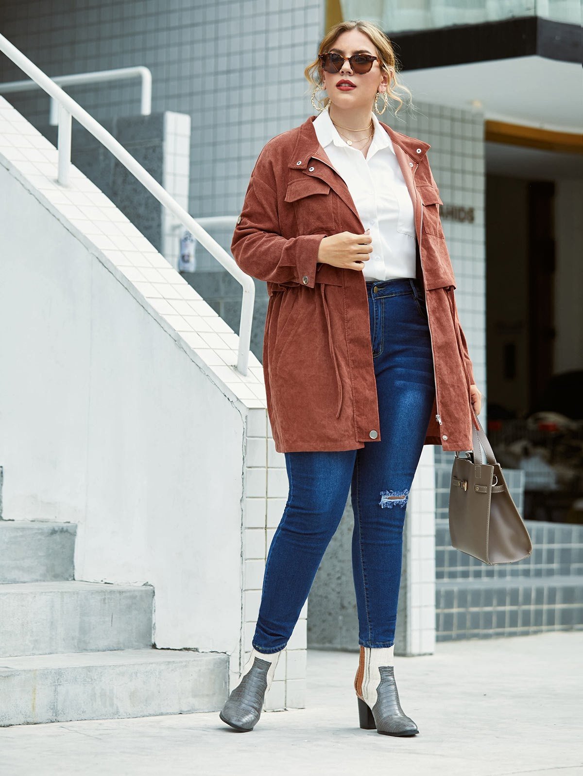 Plus Size Corduroy Flap Pocket Zip Roll Up Sleeve Coat