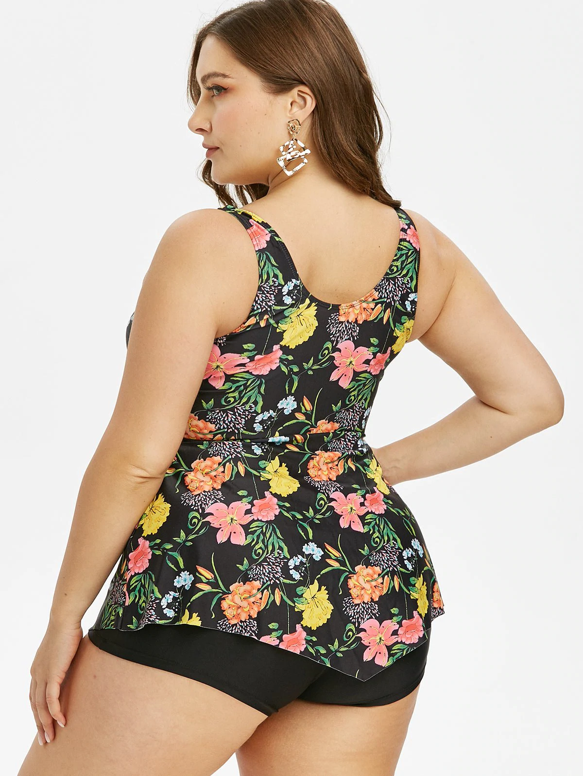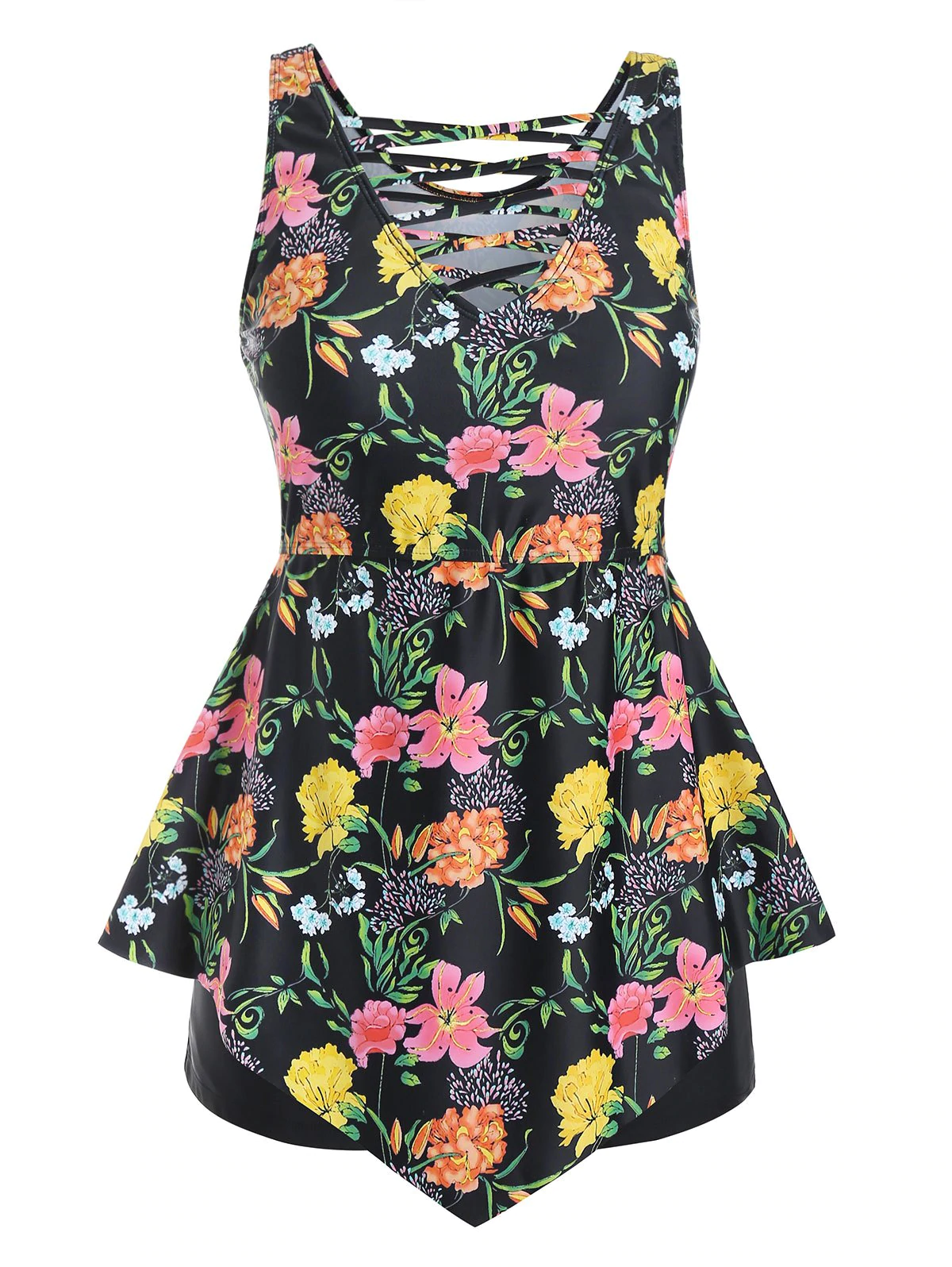 Plus Size Crisscross Floral Print Peplum Tankini Swimwear