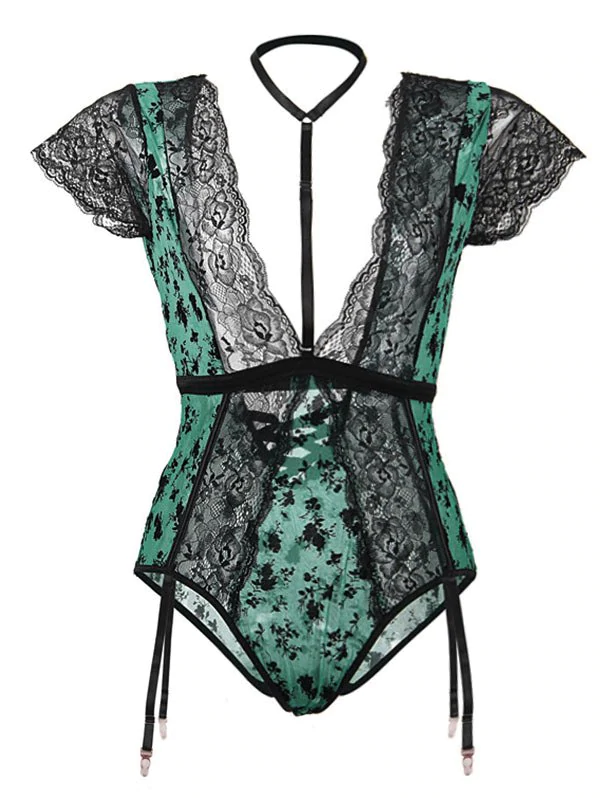 Plus Size Flocking Floral Lace Panel Mesh Harness Bodysuit