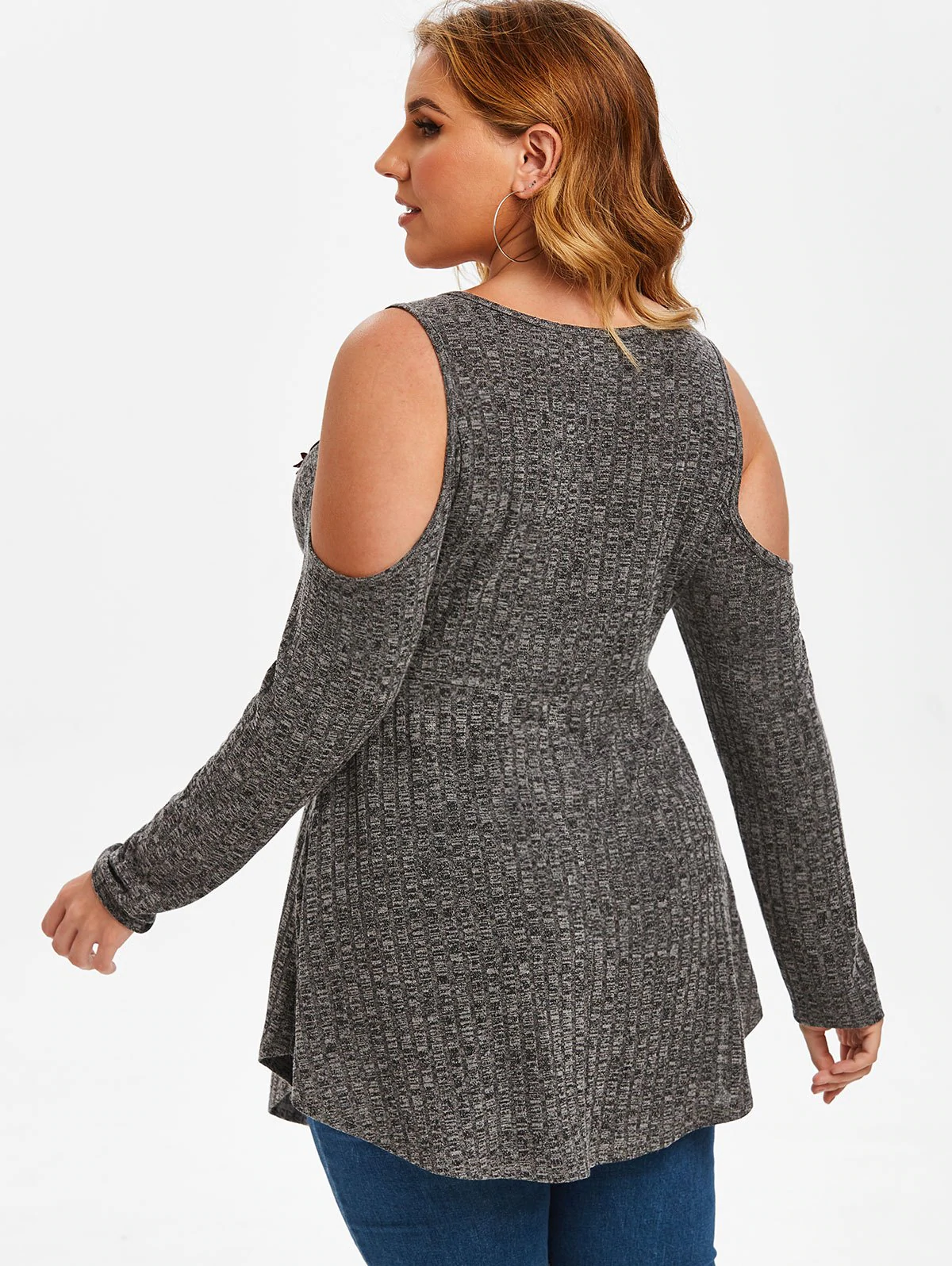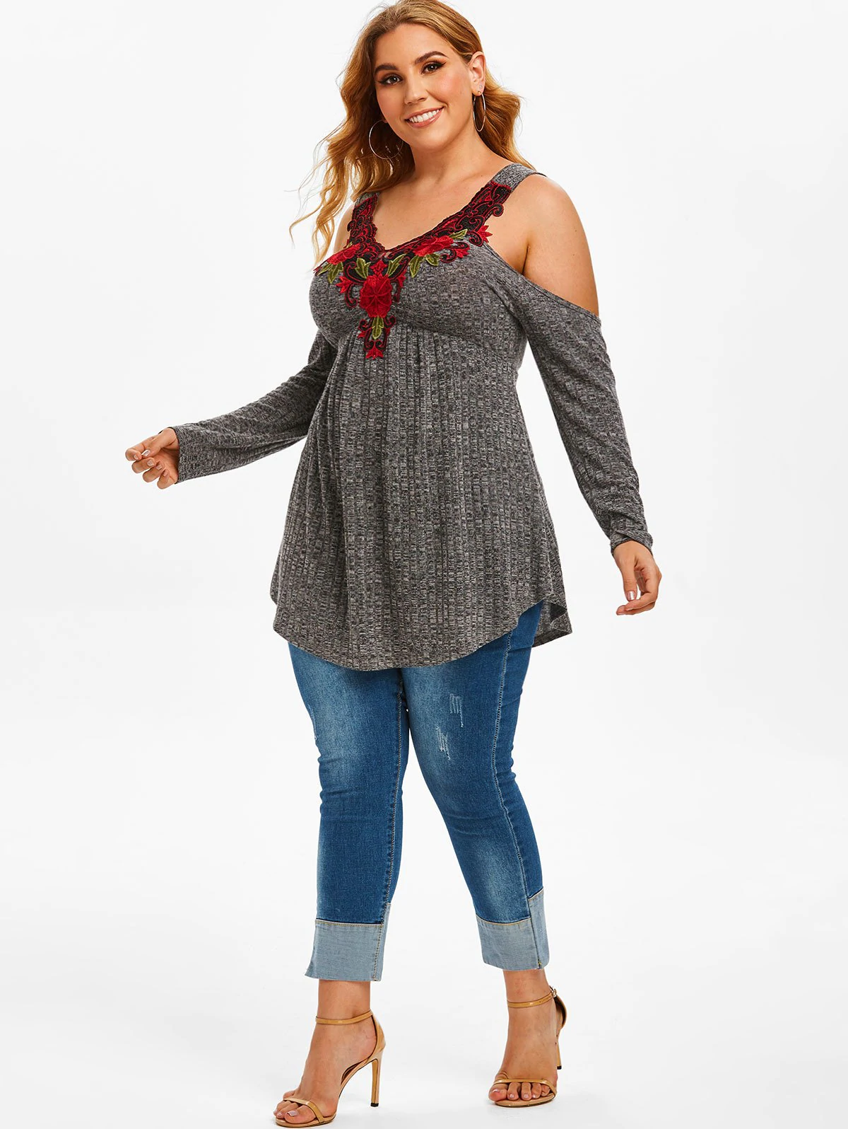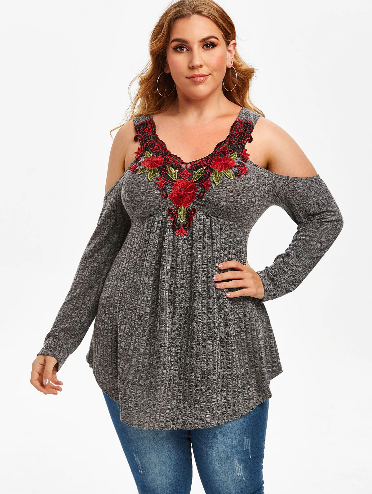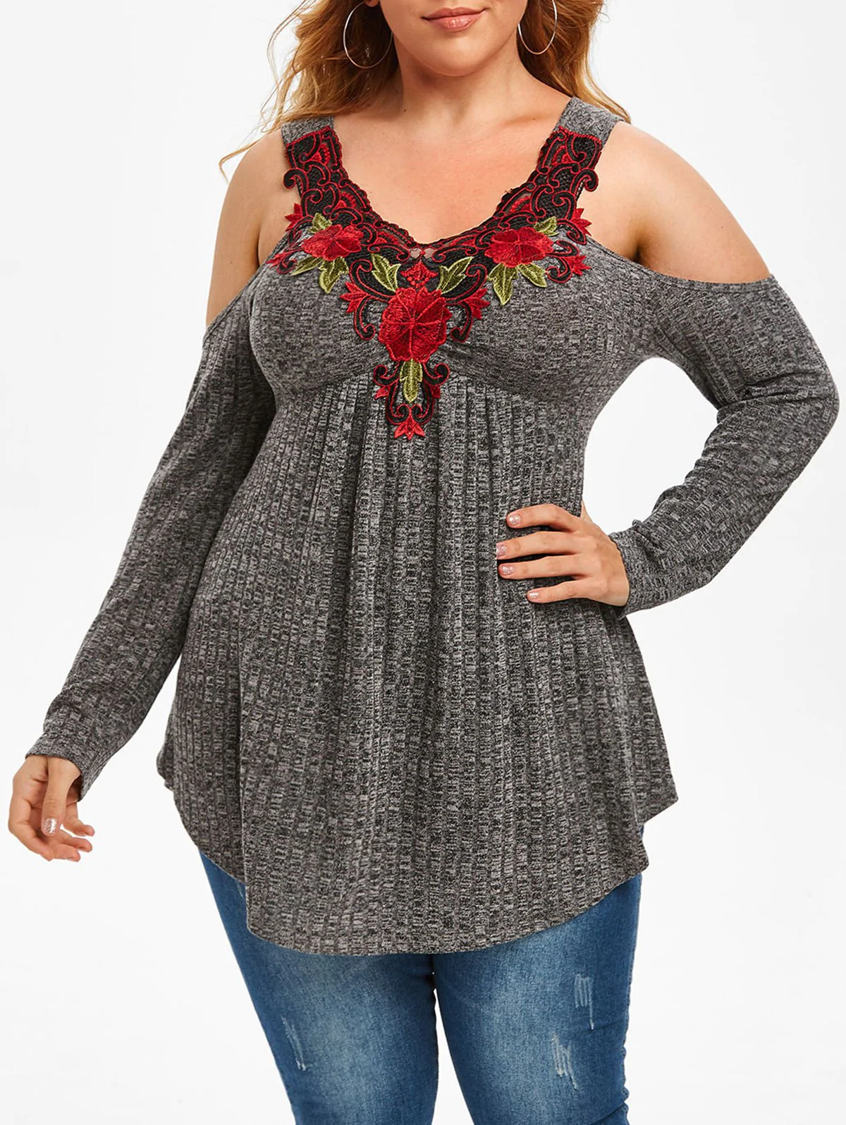 Plus Size Floral Applique Heathered Cold Shoulder Knitwear