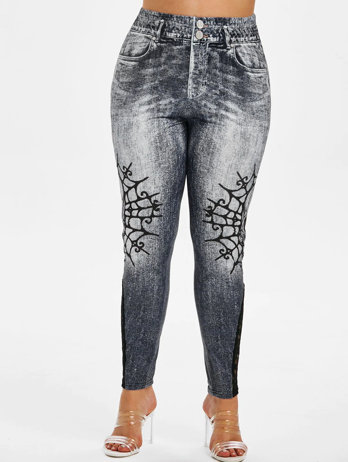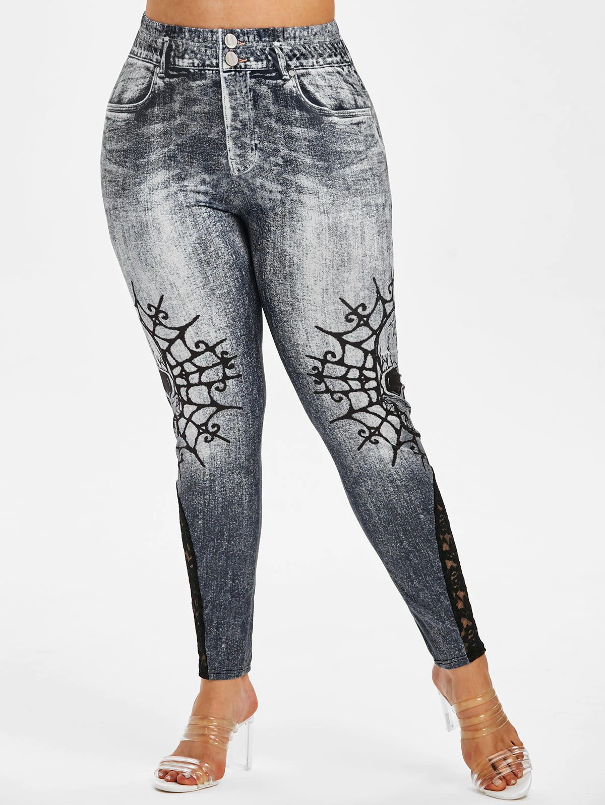 Plus Size Halloween Skull Print Lace Insert Jeggings