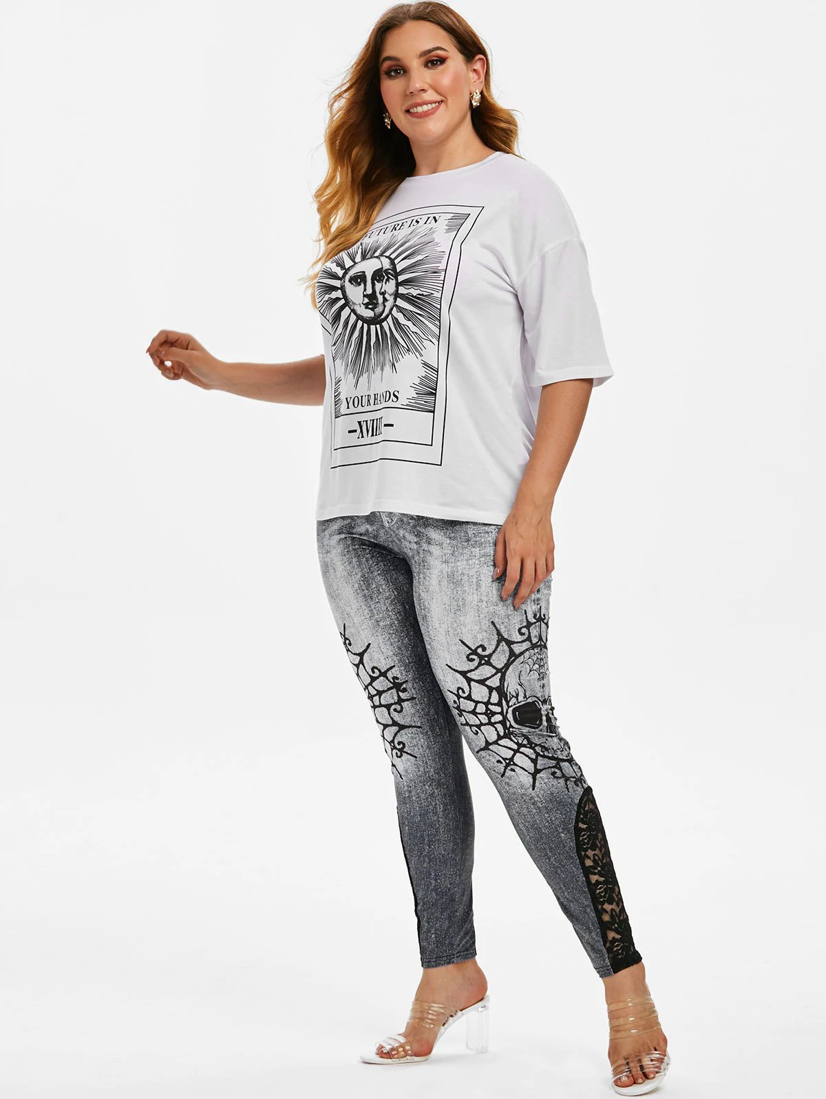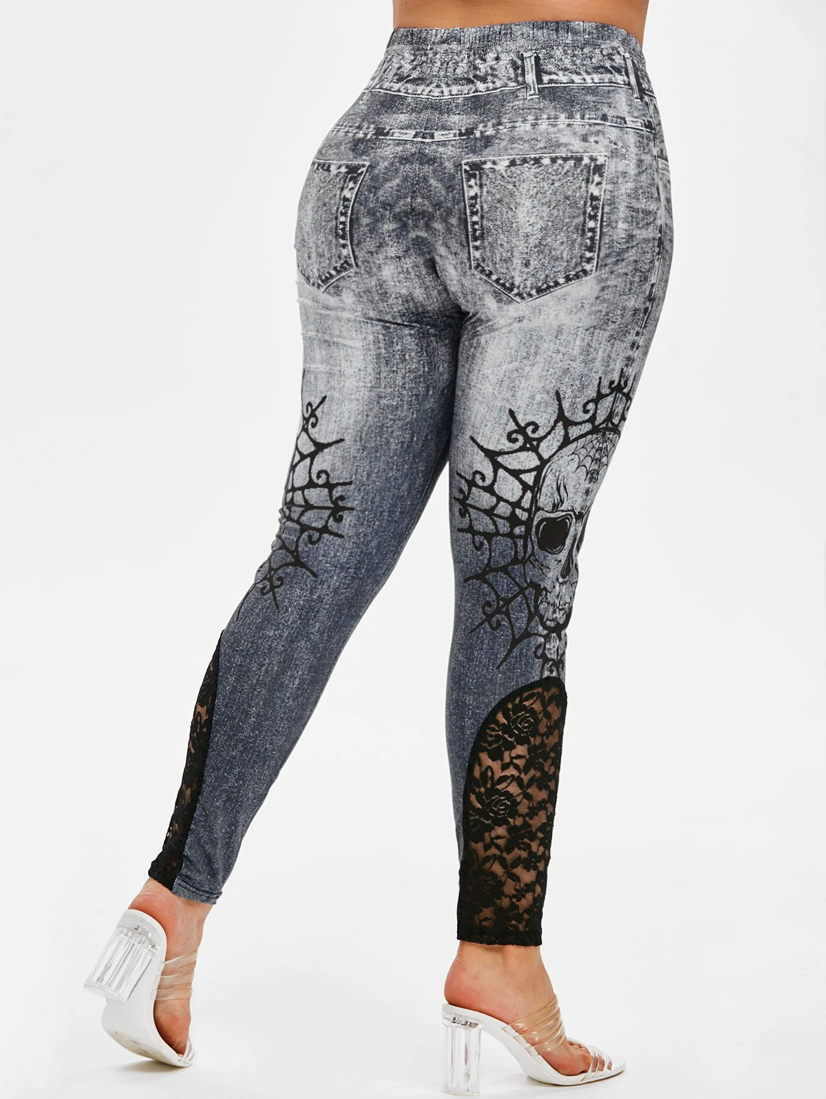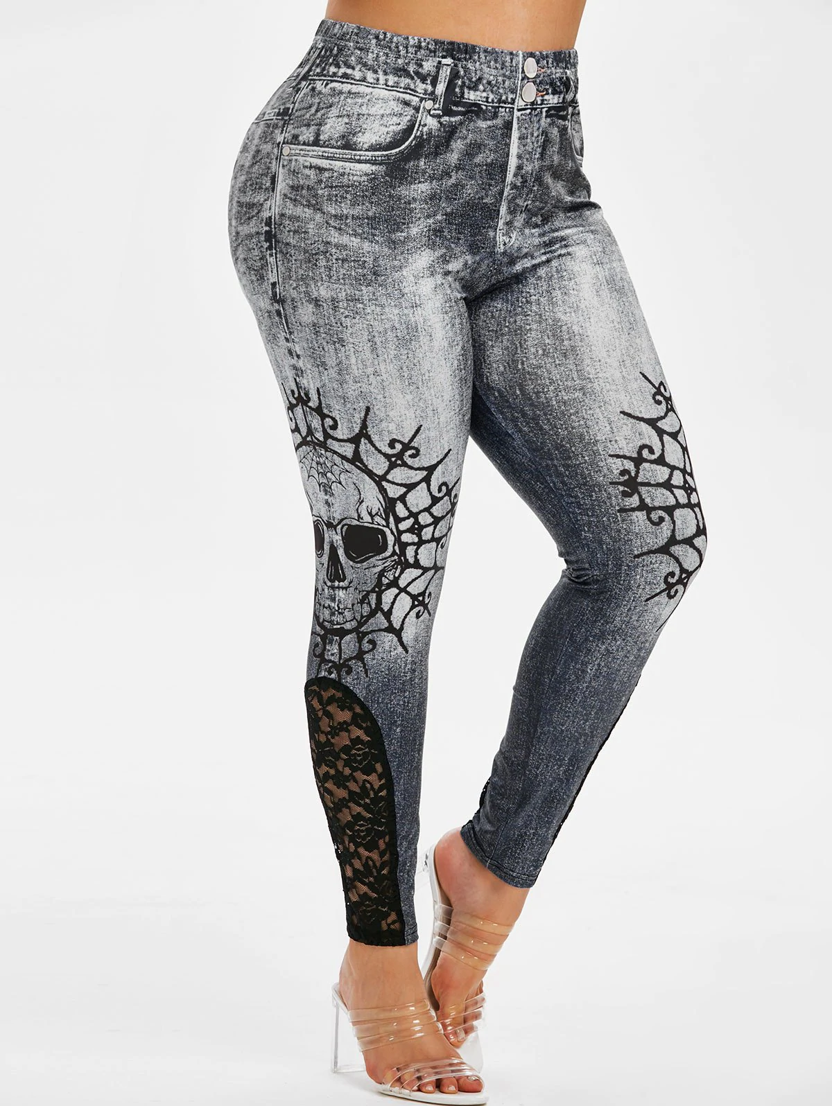 Plus Size Halloween Skull Print Lace Insert Jeggings