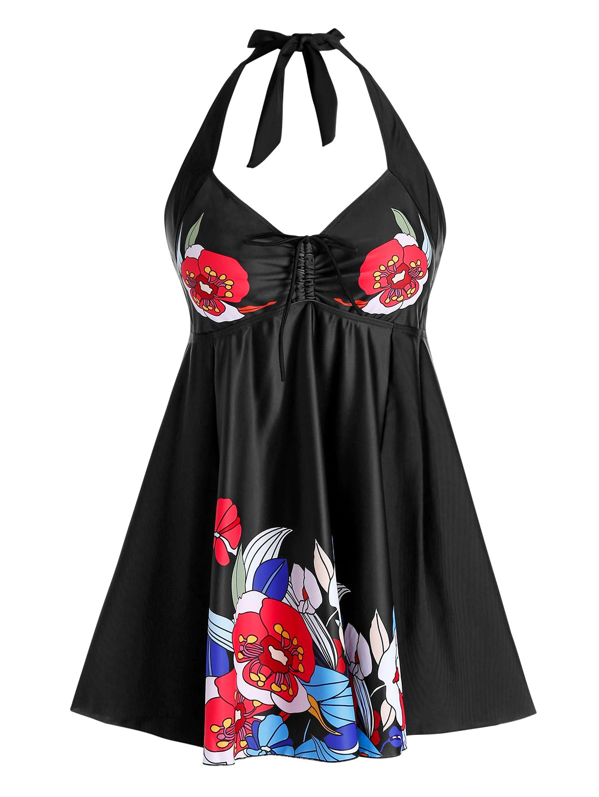 Plus Size Halter Floral Print Cinched Tankini Swimwear