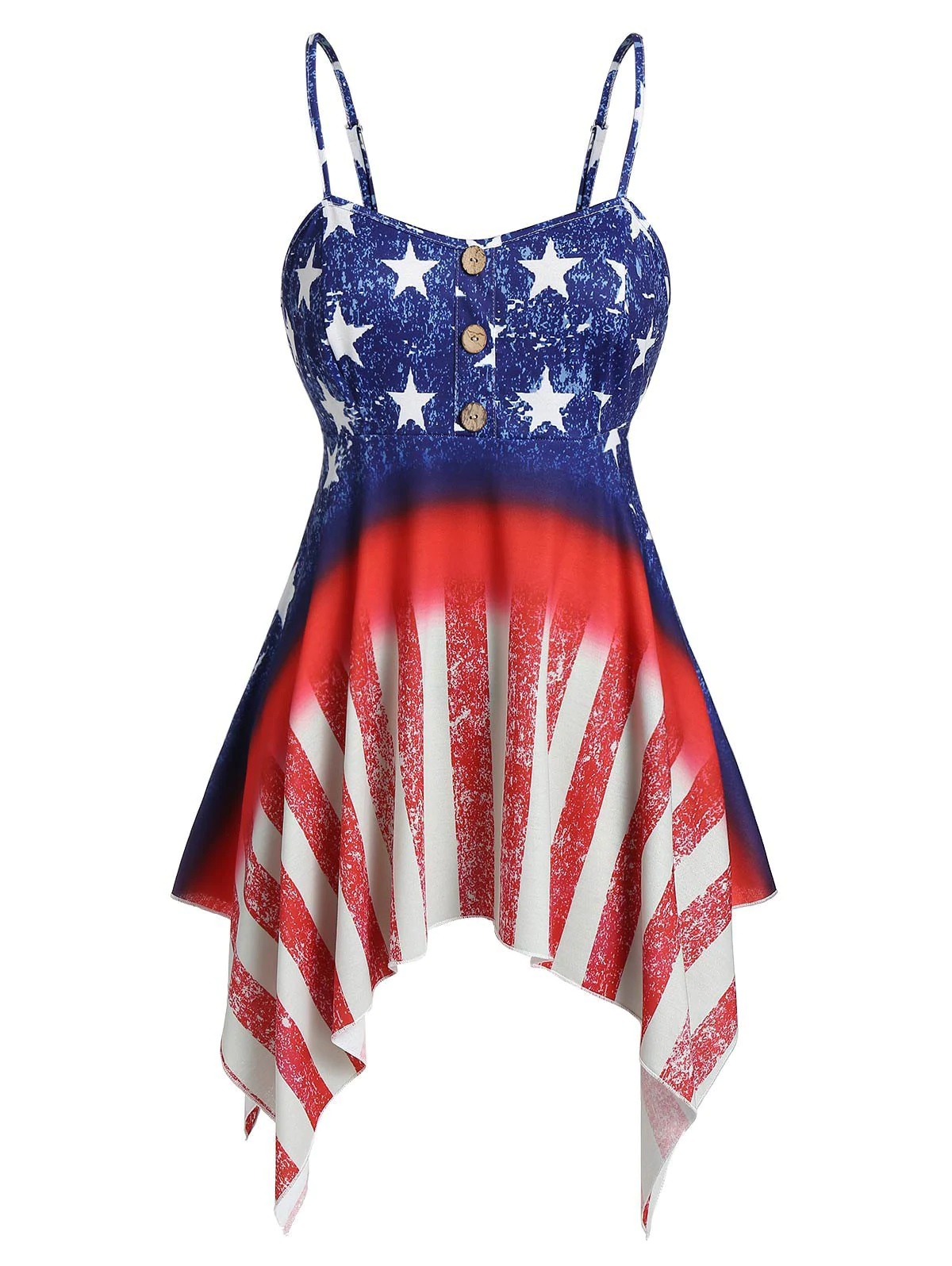 In an easy, effortless fit, this patriotic tank top features spaghetti straps with gorgeous American Flag print. The top also features a handkerchief shape for a chic look. Just add shorts or pants for a must-have look.