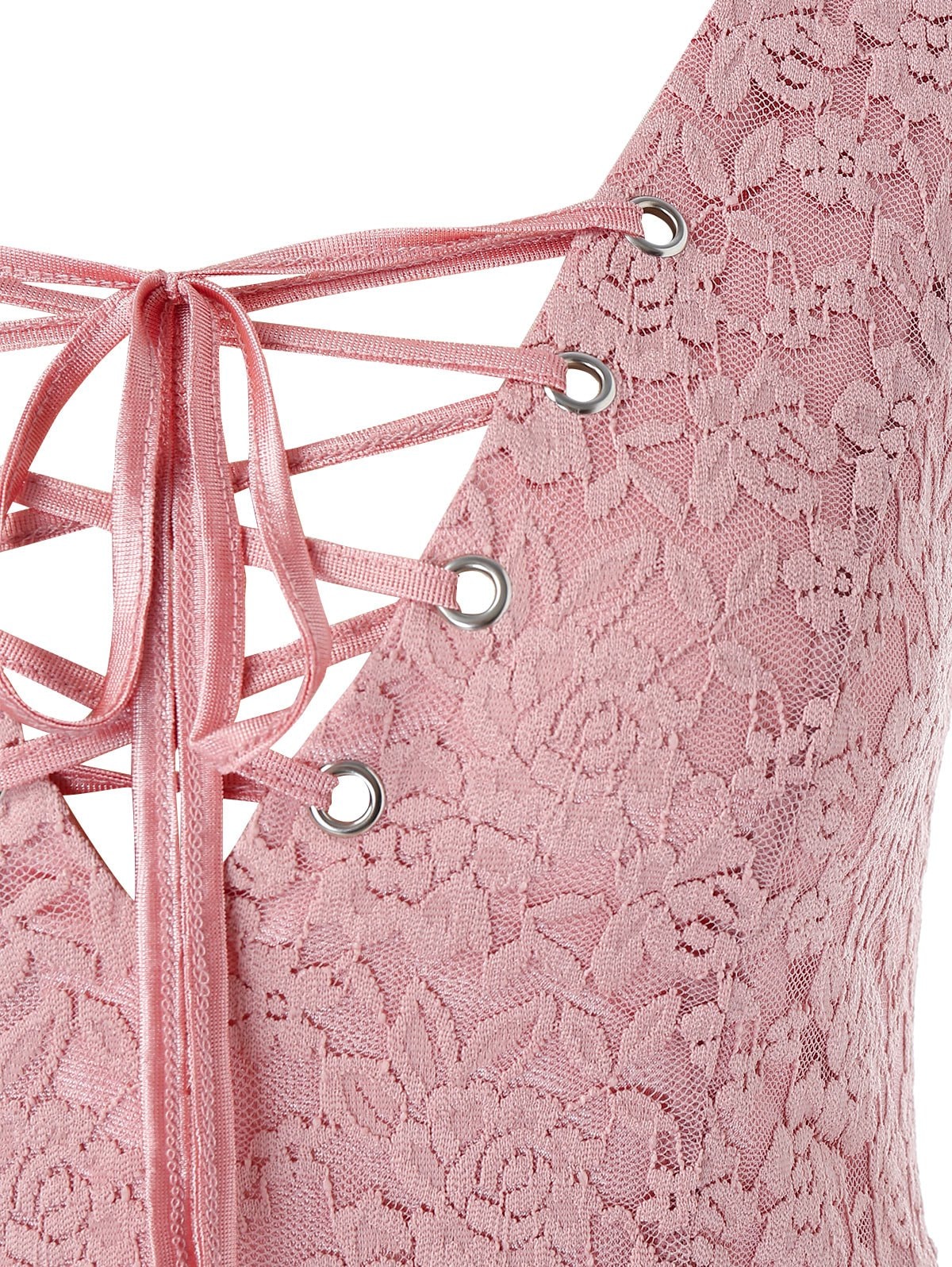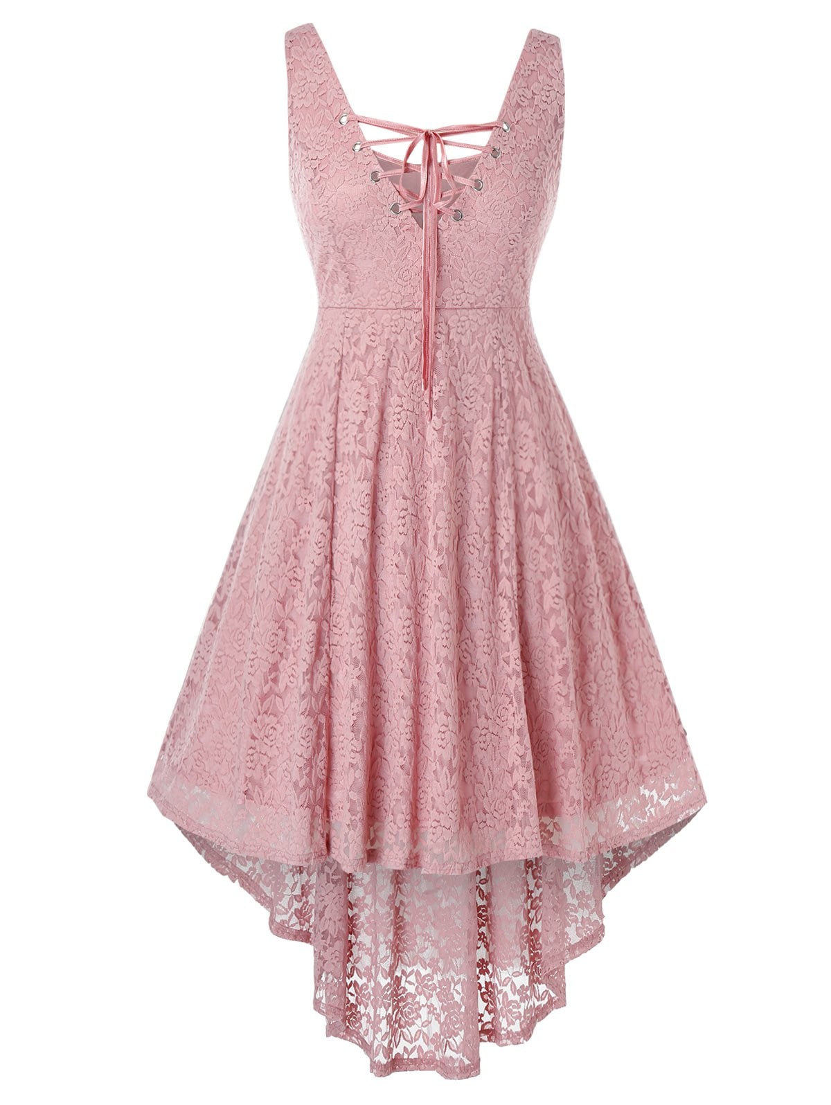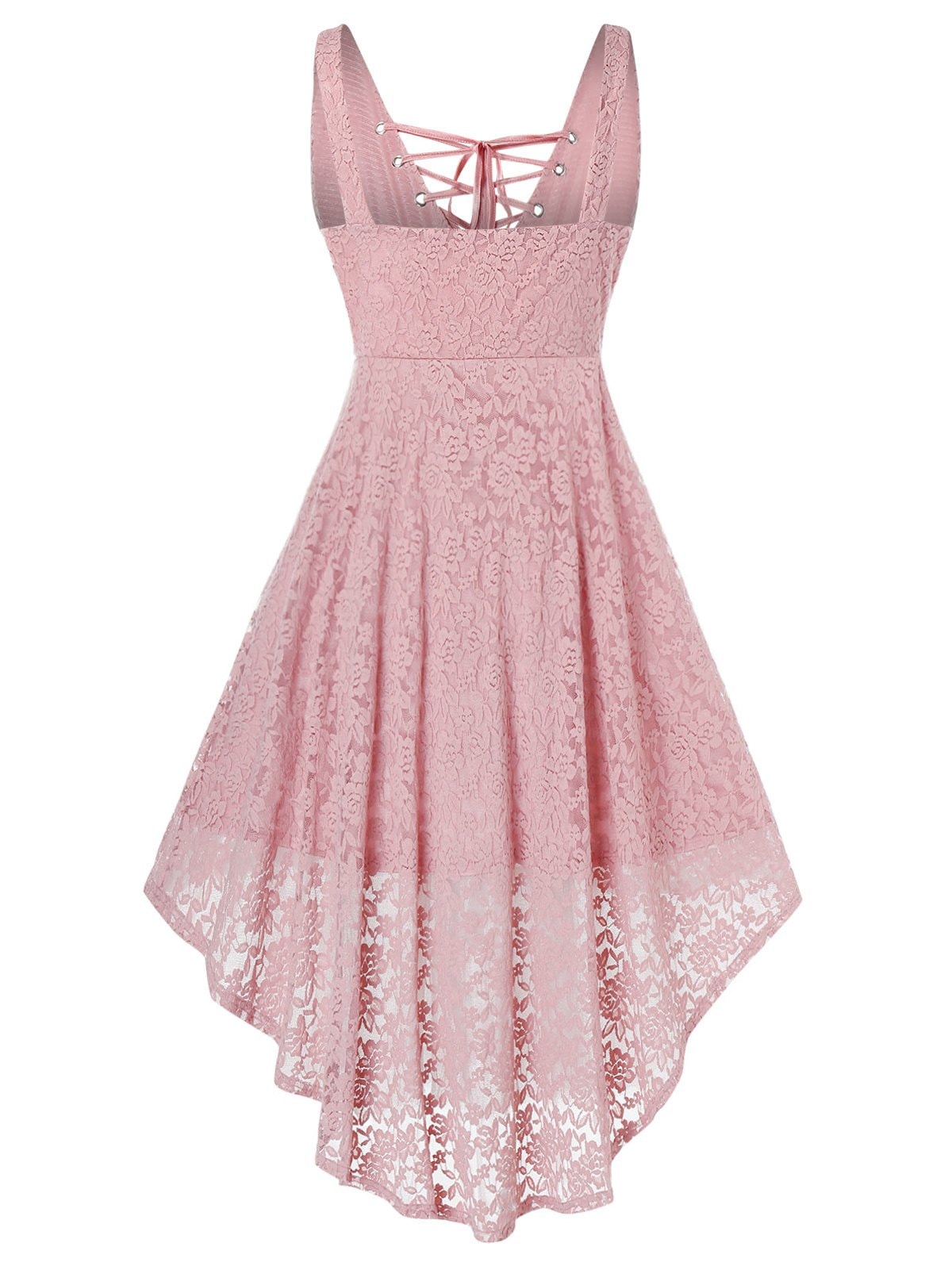 Delicate flower laces make you feel beautiful and elegant in this asymmetrical high-low dress with lace-up straps to accent the low V-neck and a square open back to amplify the flirty style.
