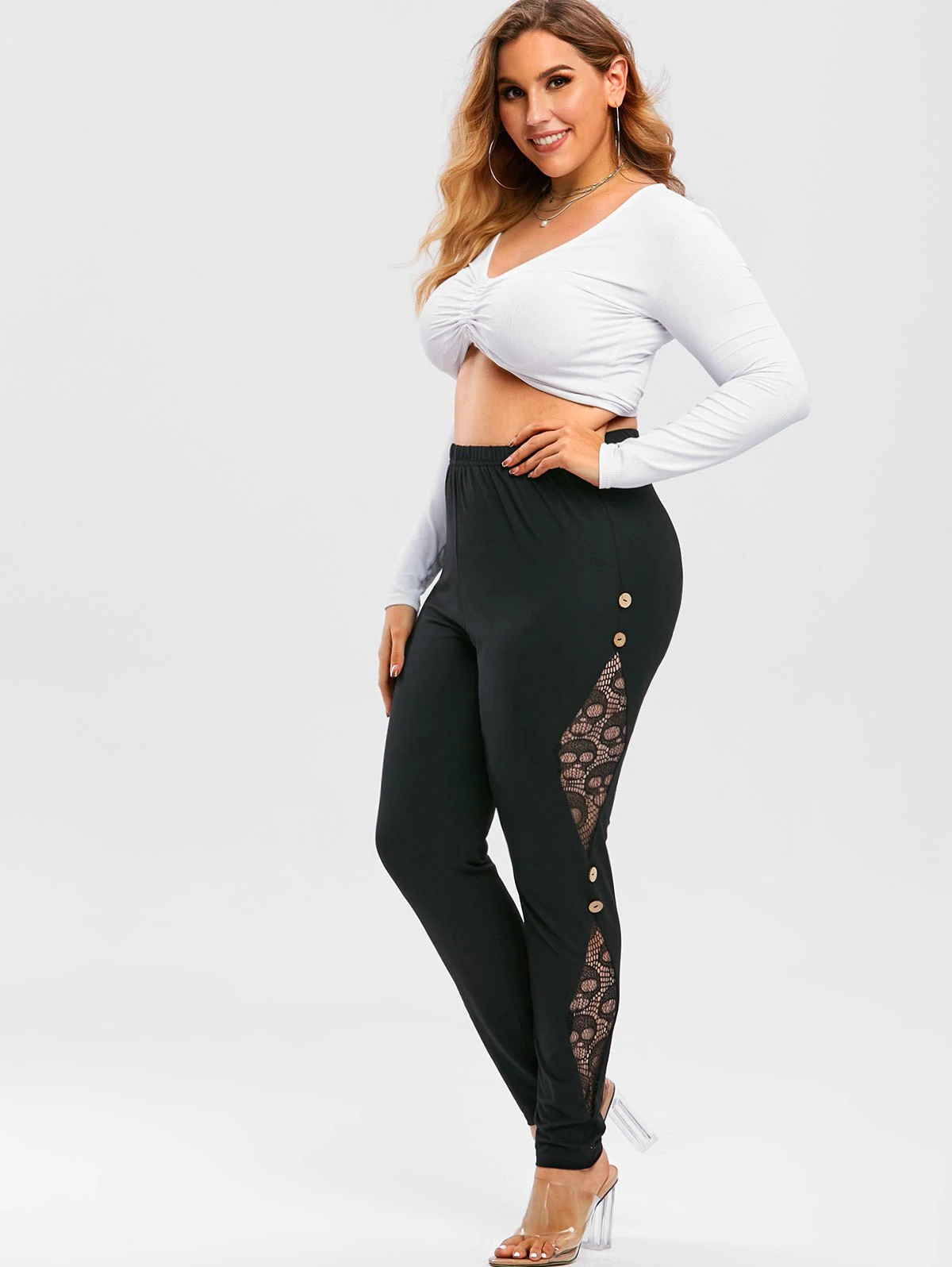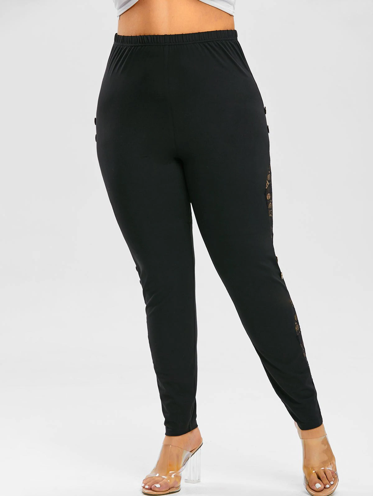 Plus Size High Rise Lace Insert Buttoned Pants