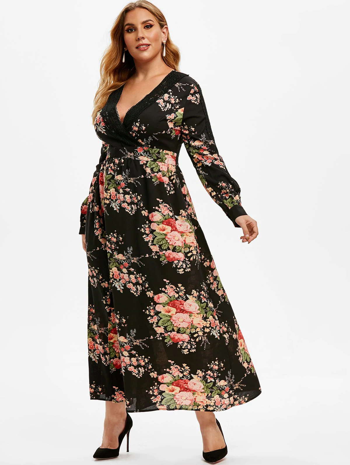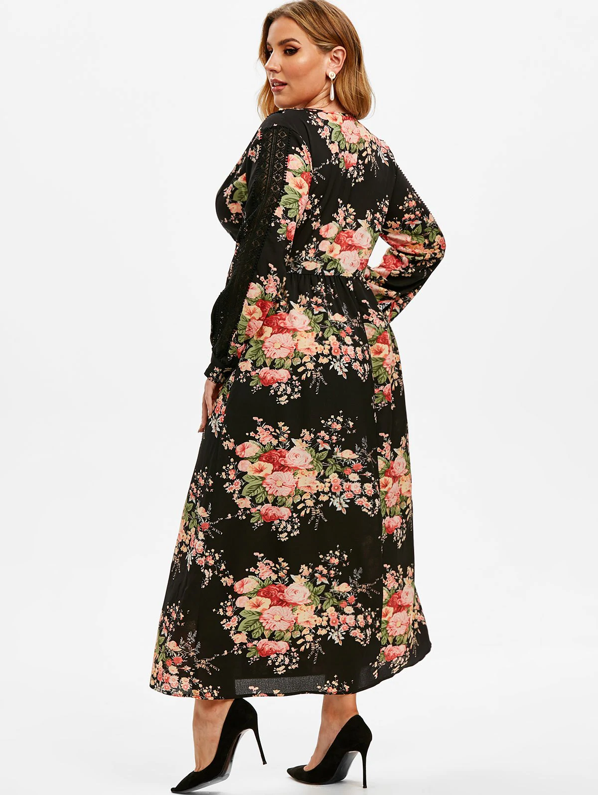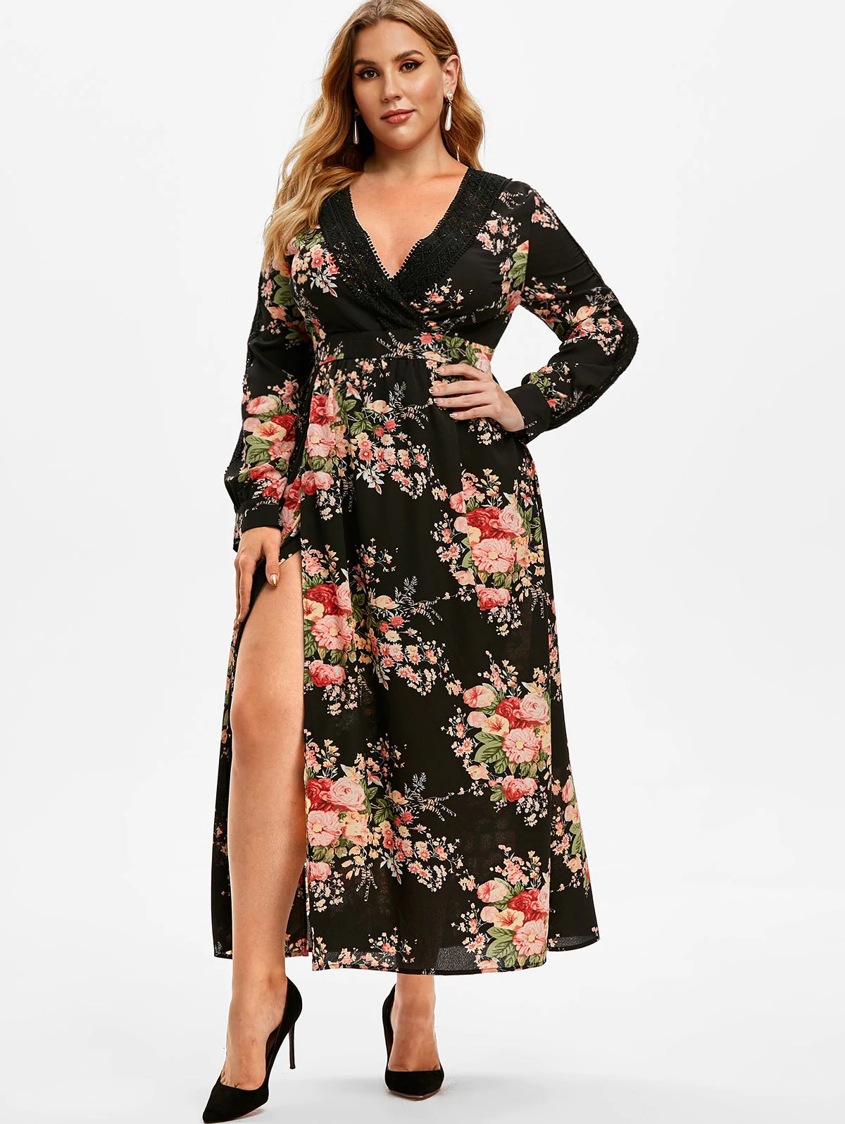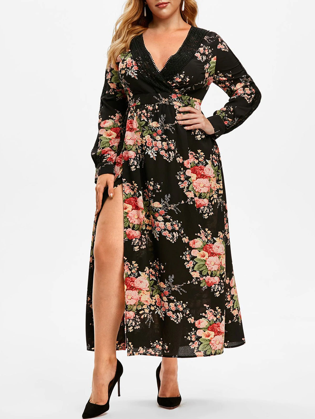 Plus Size Lace Crochet Floral Print High Slit Dress