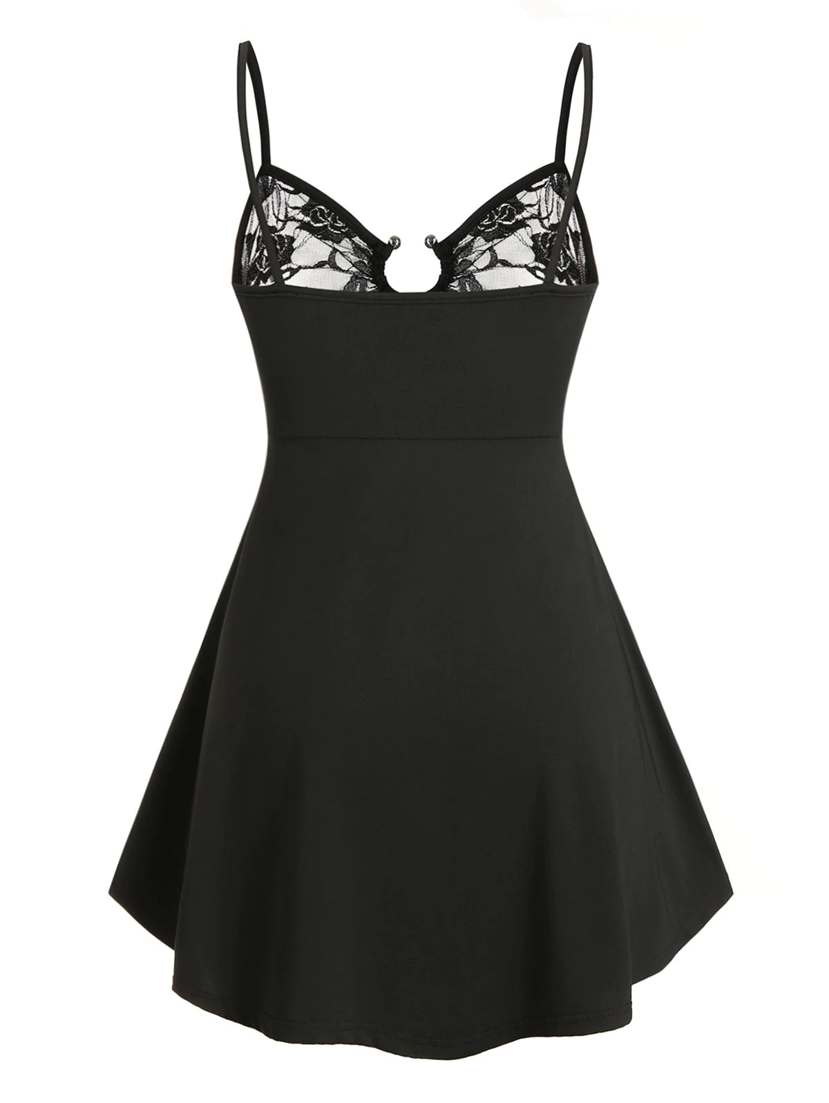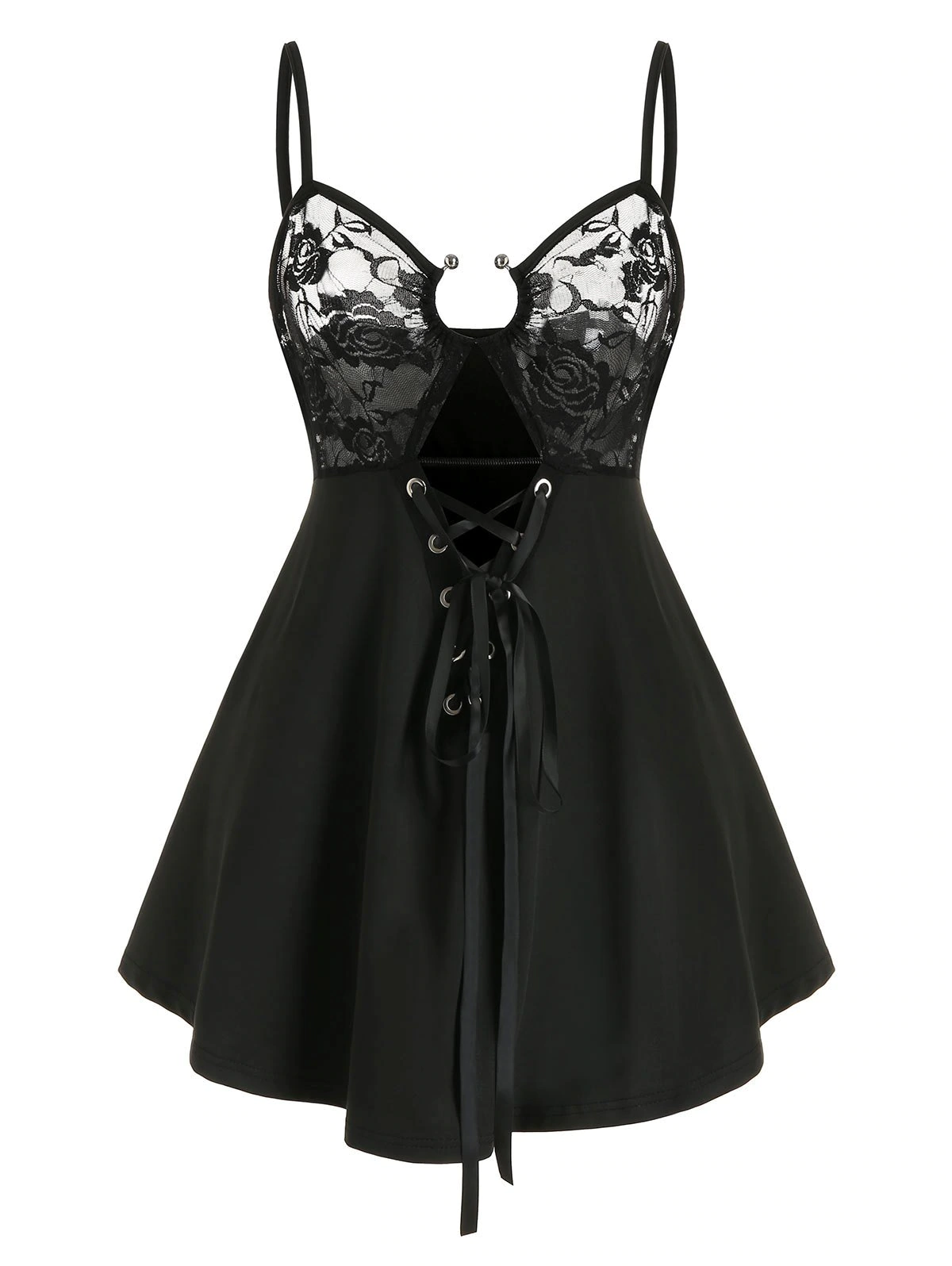 Plus Size Lace Insert Cutout Lace Up Babydoll Set