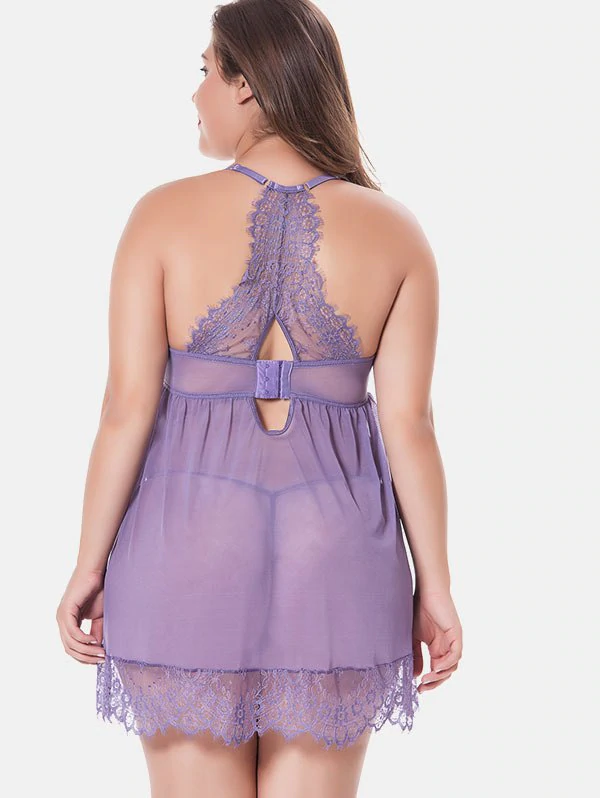 Plus Size Lace Insert Underwire Sheer Mesh Babydoll Set