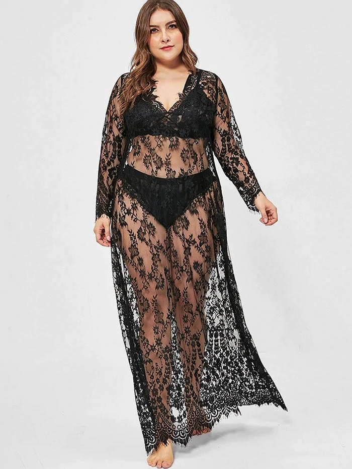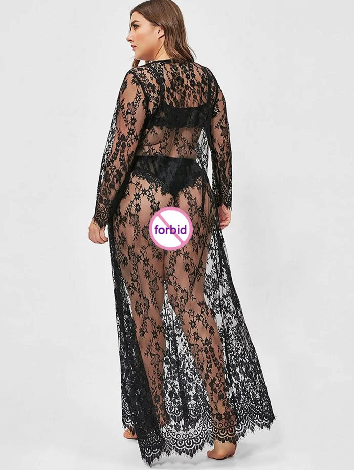 Plus Size Lace Sheer Long Sexy Dress with T-back