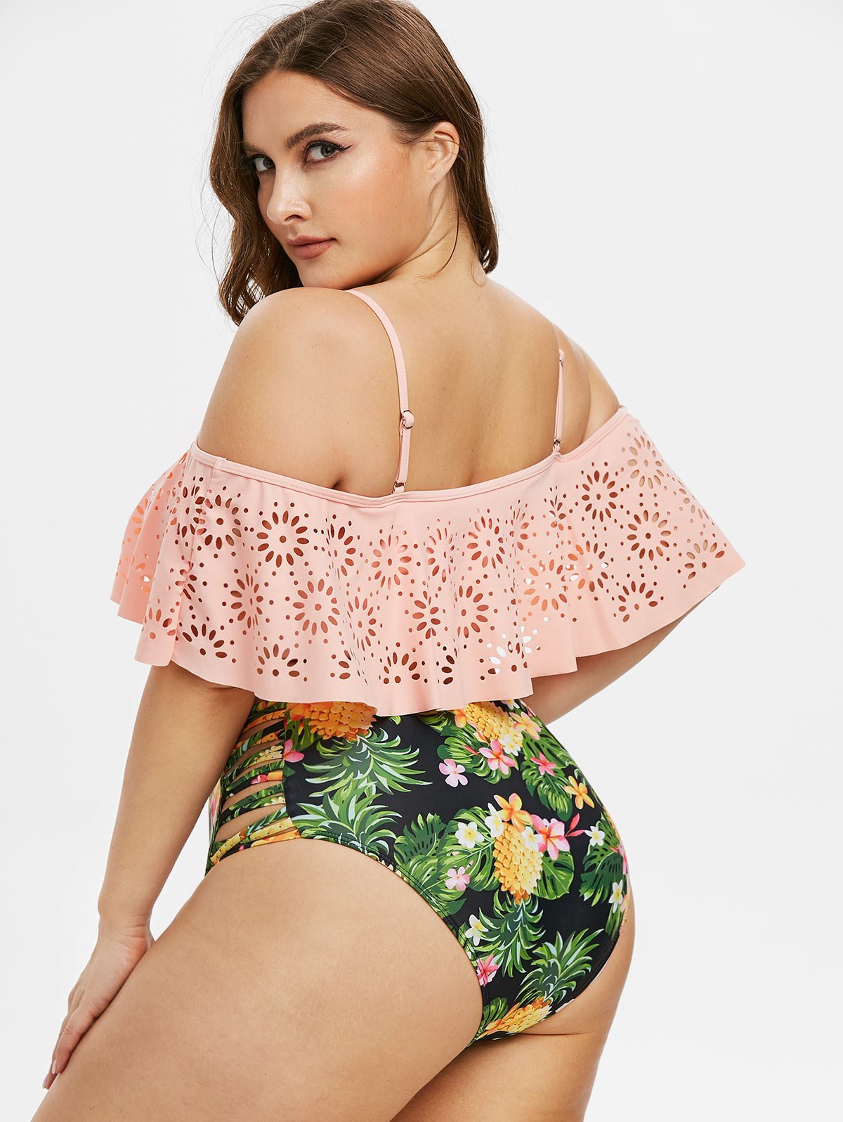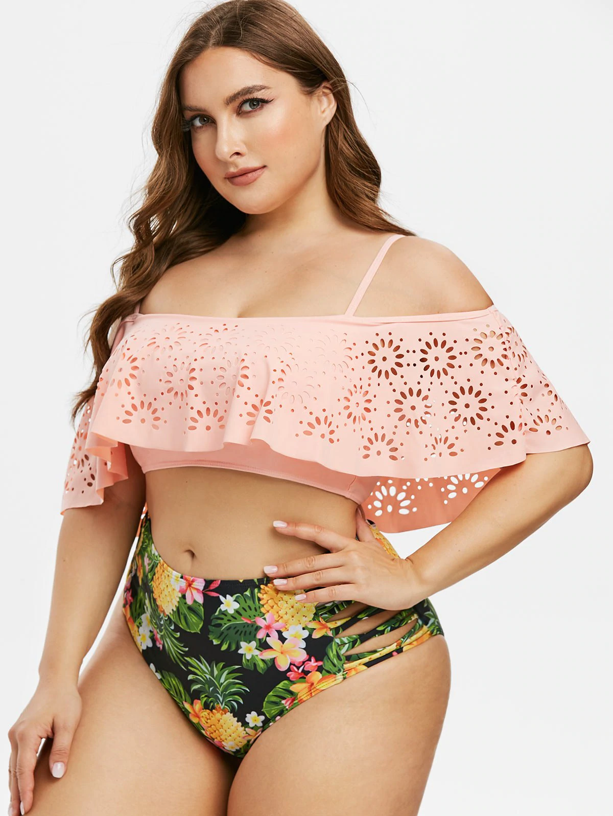 Plus Size Laser Cut Sunflower Print Two Piece Swimwear