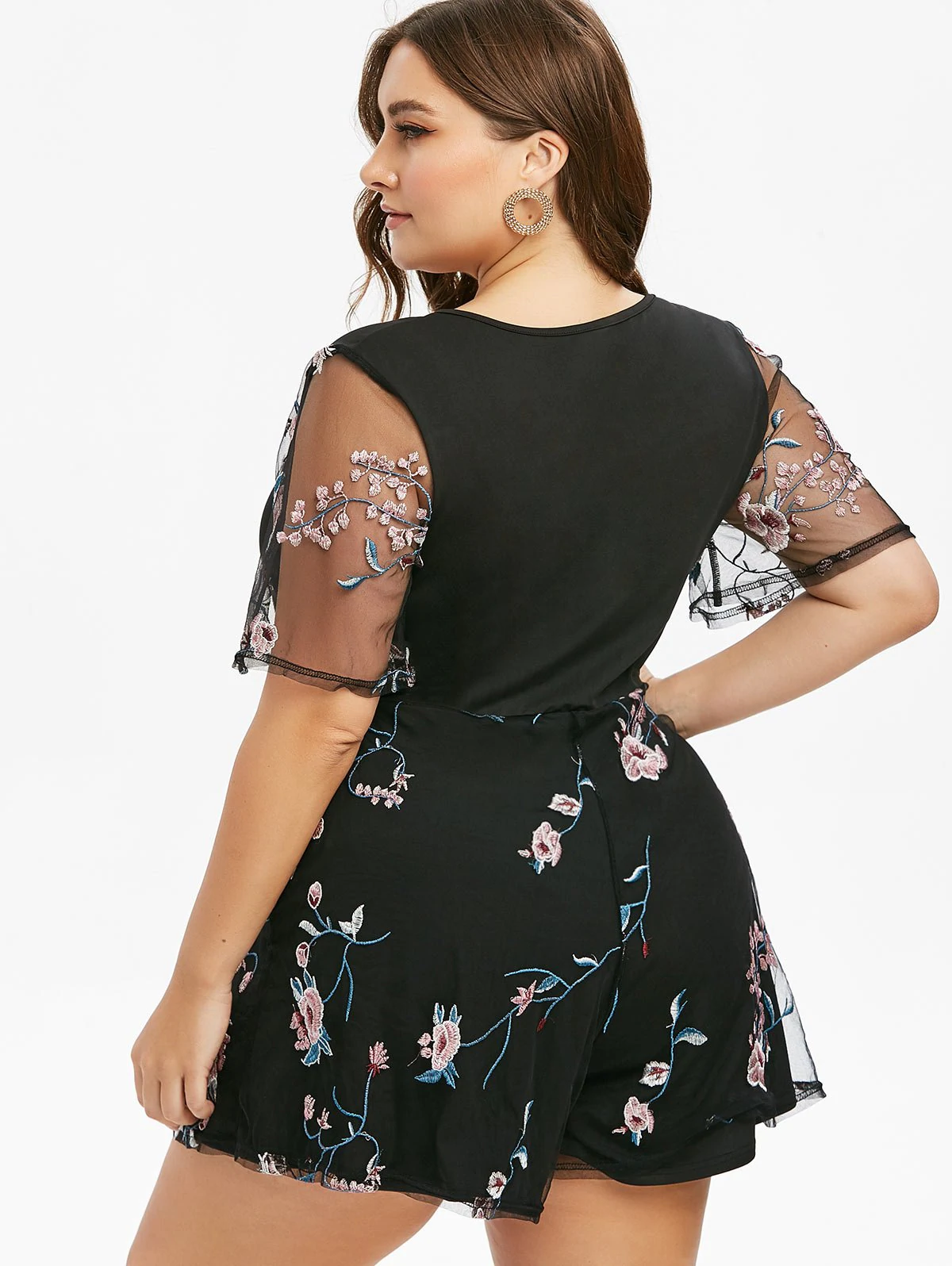Plus Size Mesh Embroidered Surplice Romper