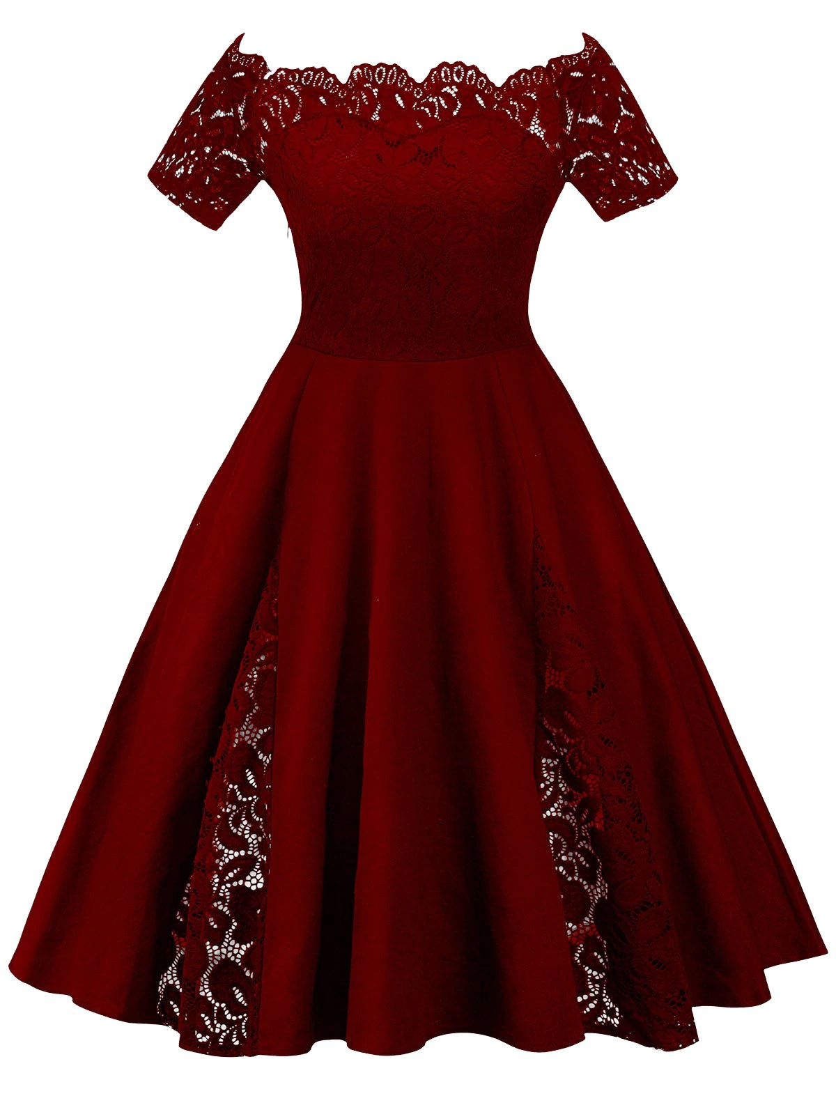 This super sweet flare dress is lovely in floral lace, with short sleeves that go scalloped off-the-shoulder, and an interior lining with a sweetheart neckline. It is suitable for cocktail parties, homecoming, and other special occasions.