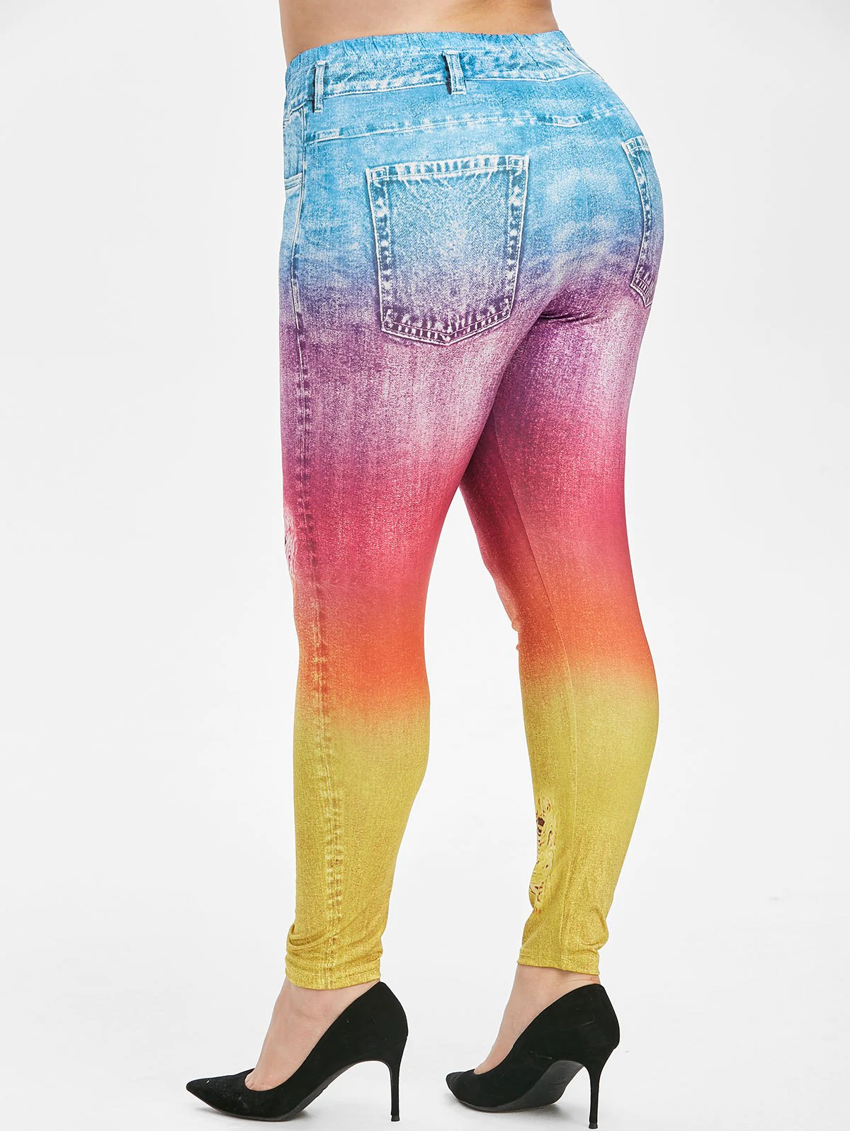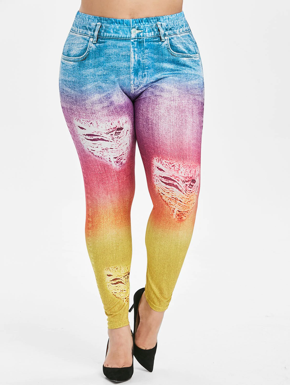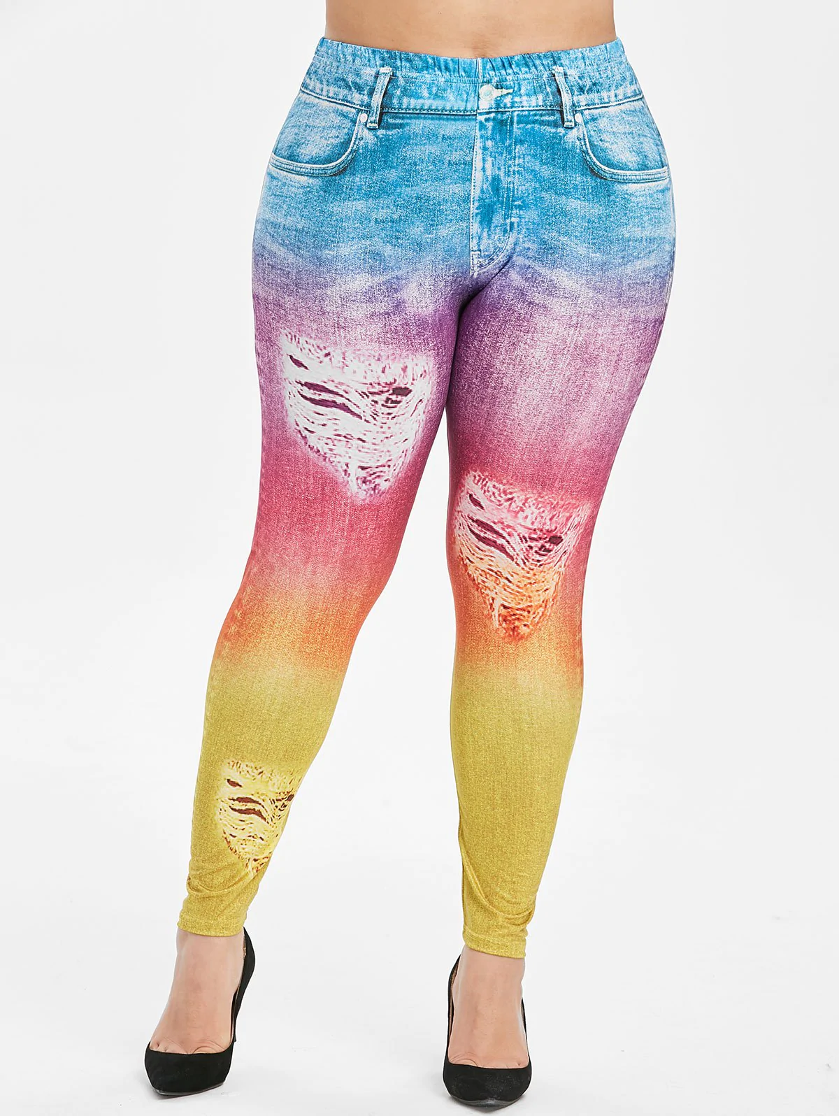 Plus Size Ombre Color 3D Destroyed Print Jeggings