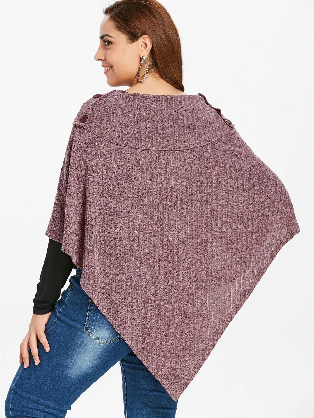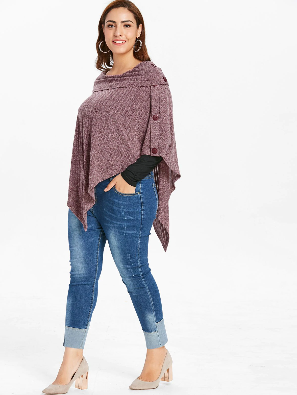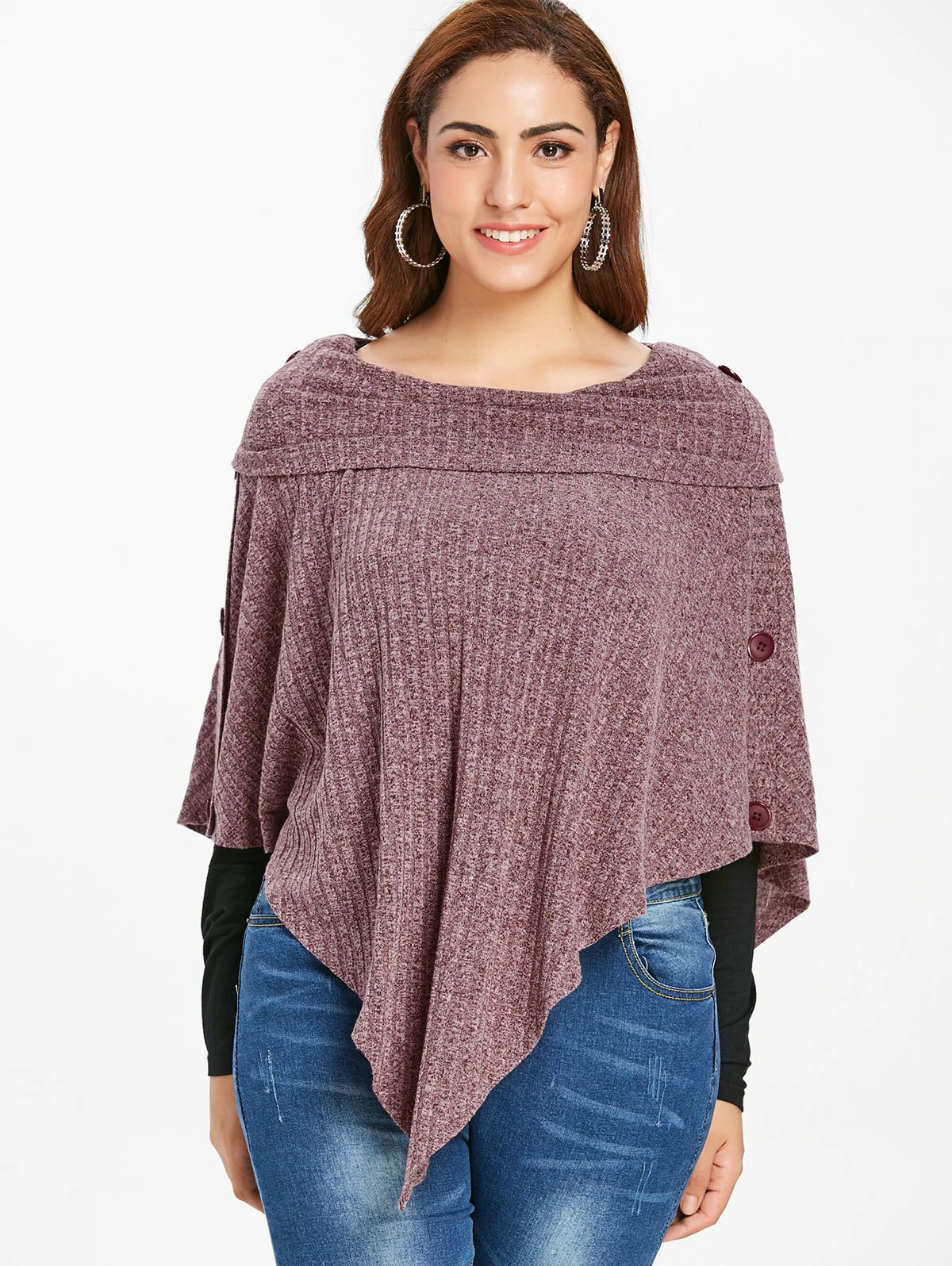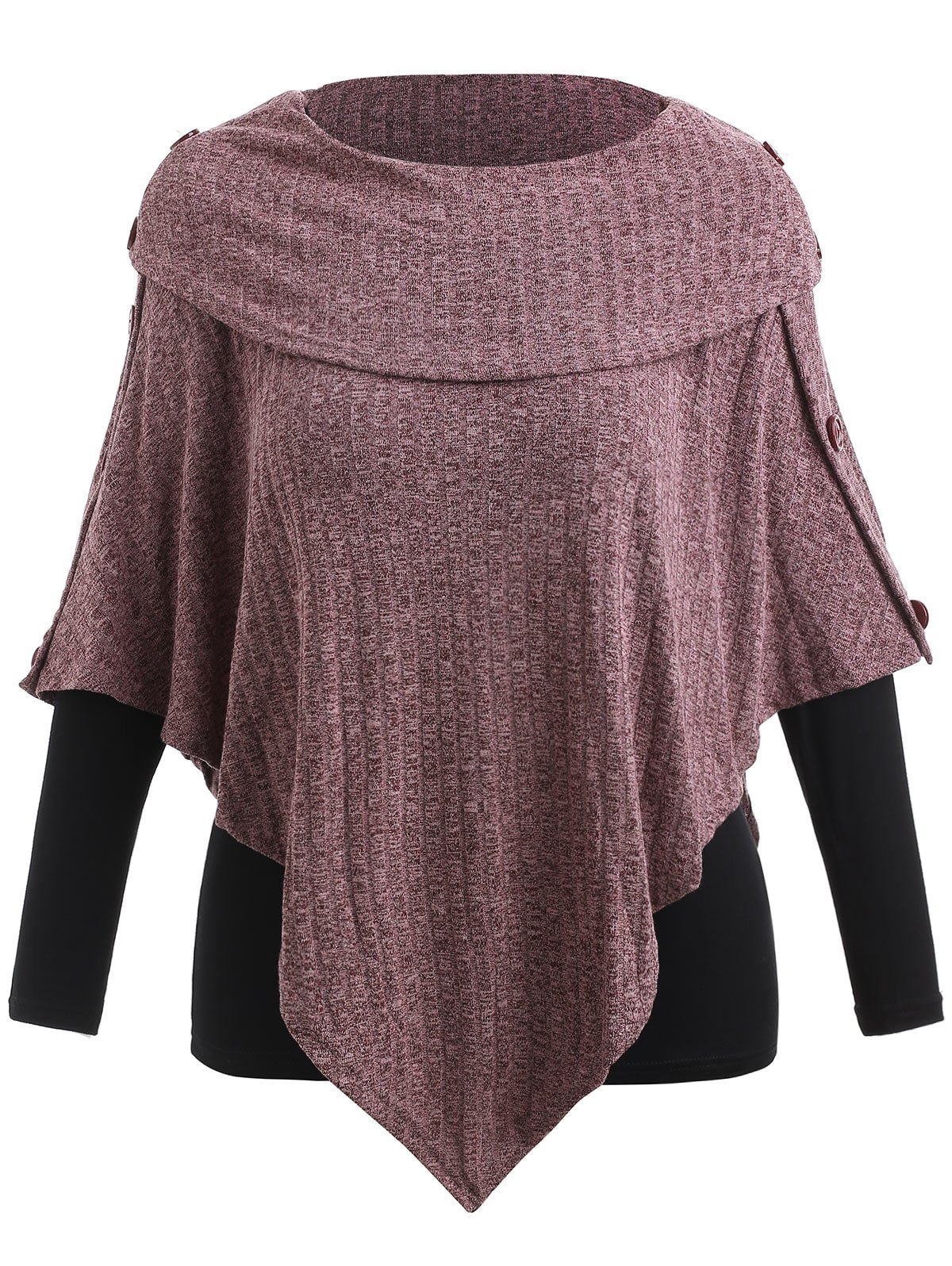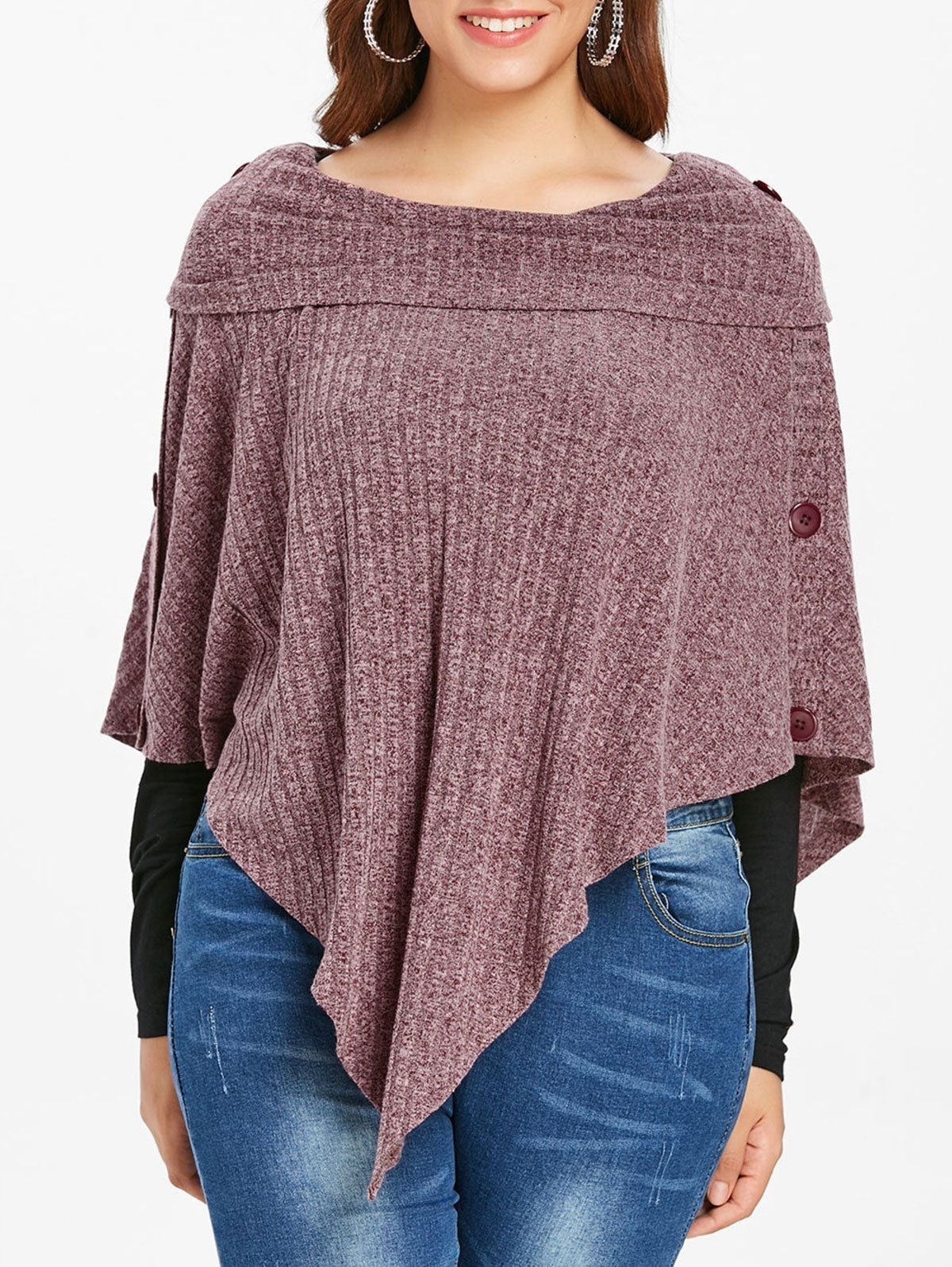 Plus Size Ribbed Buttons Knit Cape with T-shirt