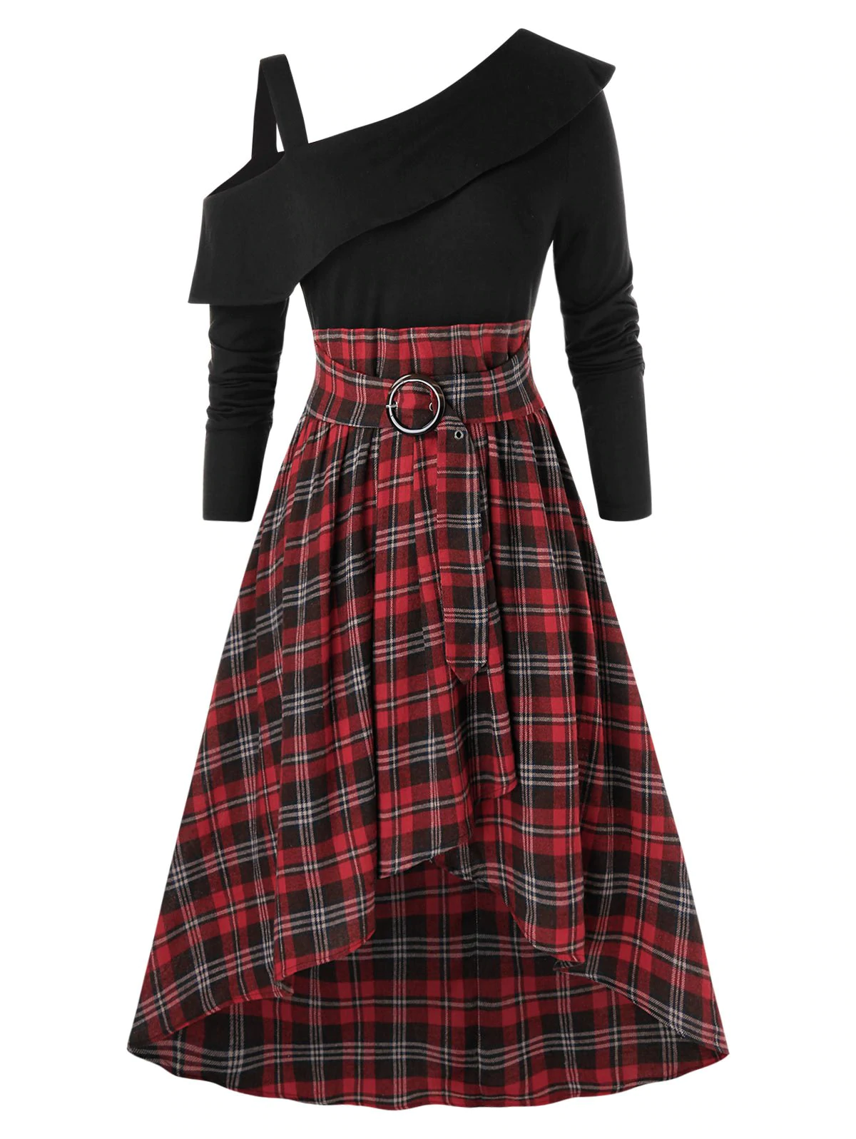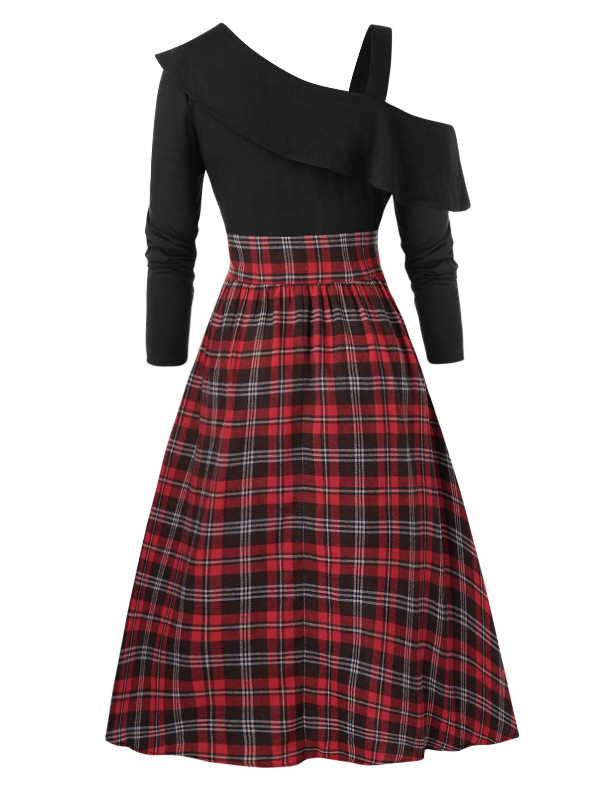 Plus Size Skew Neck Ruffled High Low Plaid Dress