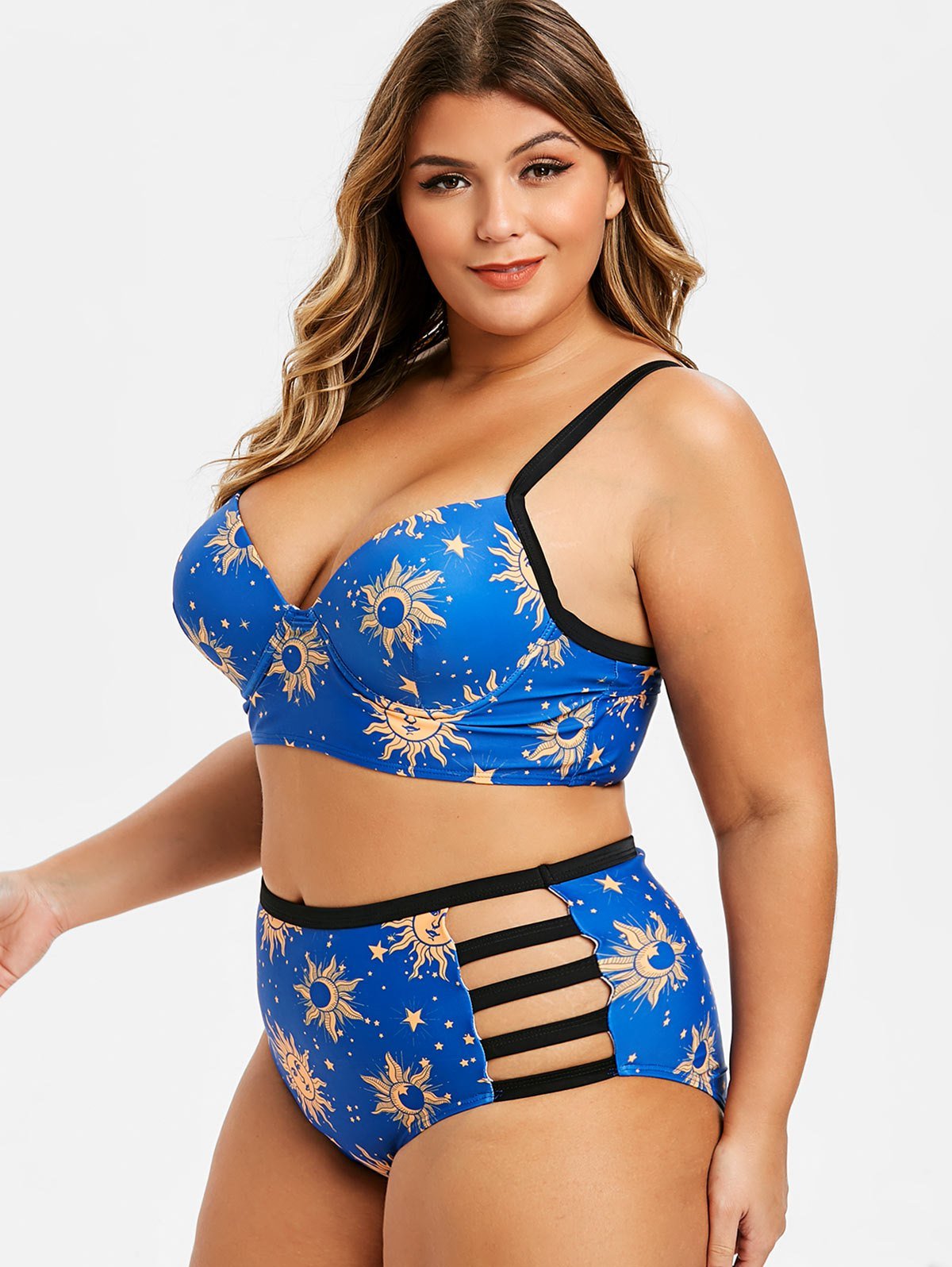 Covered in allover sun and stars to show love for the solar system, this plus size suit is designed with strongly supportive cups that flatter the shape and hollow out details to amp up the flirty style. A matching bottom features ladder cutouts and boasts a high-rise waist to offer the full coverage.