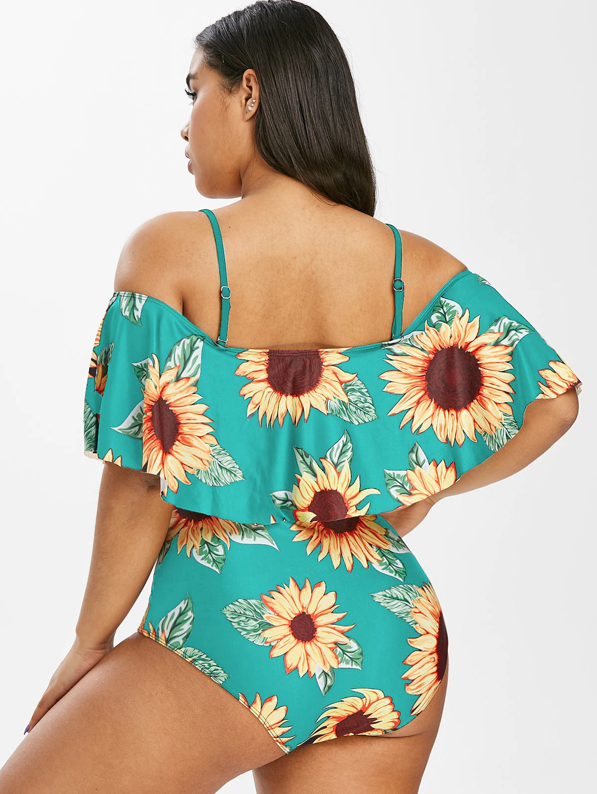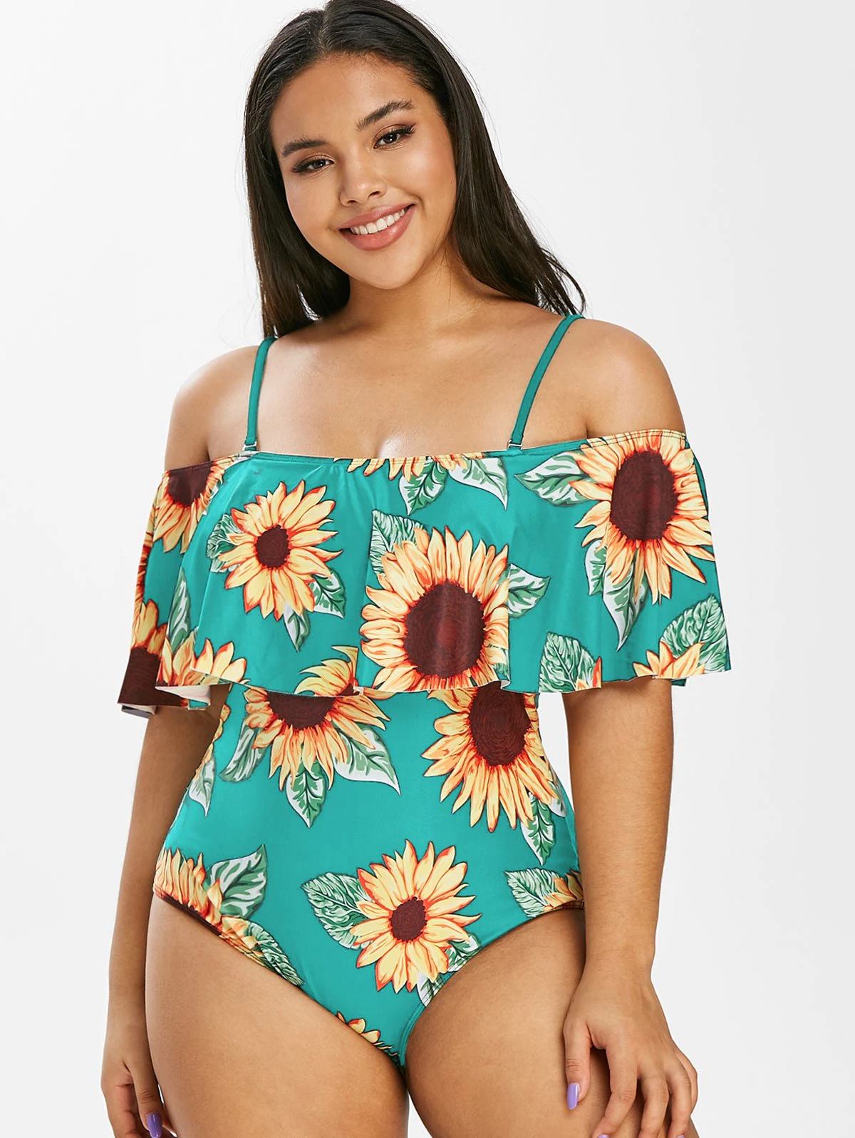 Plus Size Sunflower Print Ruffled One-piece Swimsuit