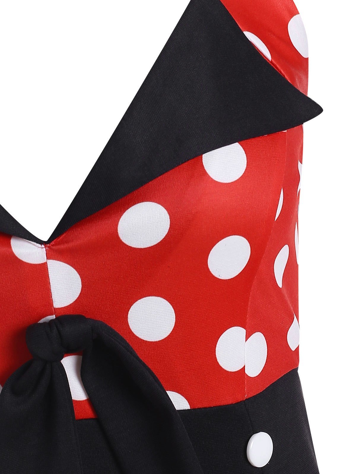 Adorable polka dot spread on the top part of the dress to make a contrast visual effect with the solid bottom part. Six large decorative buttons help to highlight your slim waist. And the self-tie straps fashion into large bowknot at the nape forming a chic halter neck.