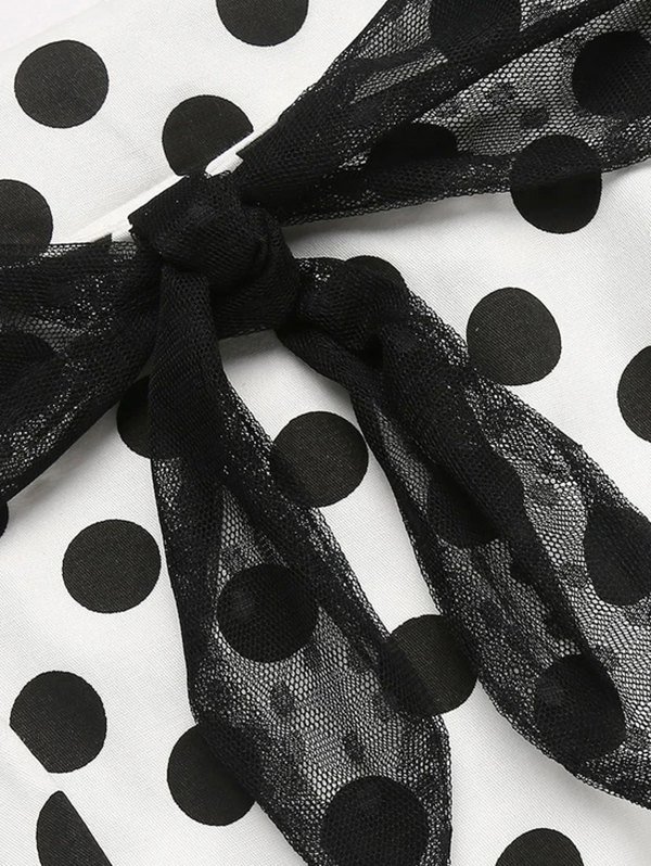 What makes this classic polka dot dress unique is the lace insert which forms elegant cap sleeves, as well as fashion a dangling tie in the front for a playful look. Just enjoy the eyes attracted by you!